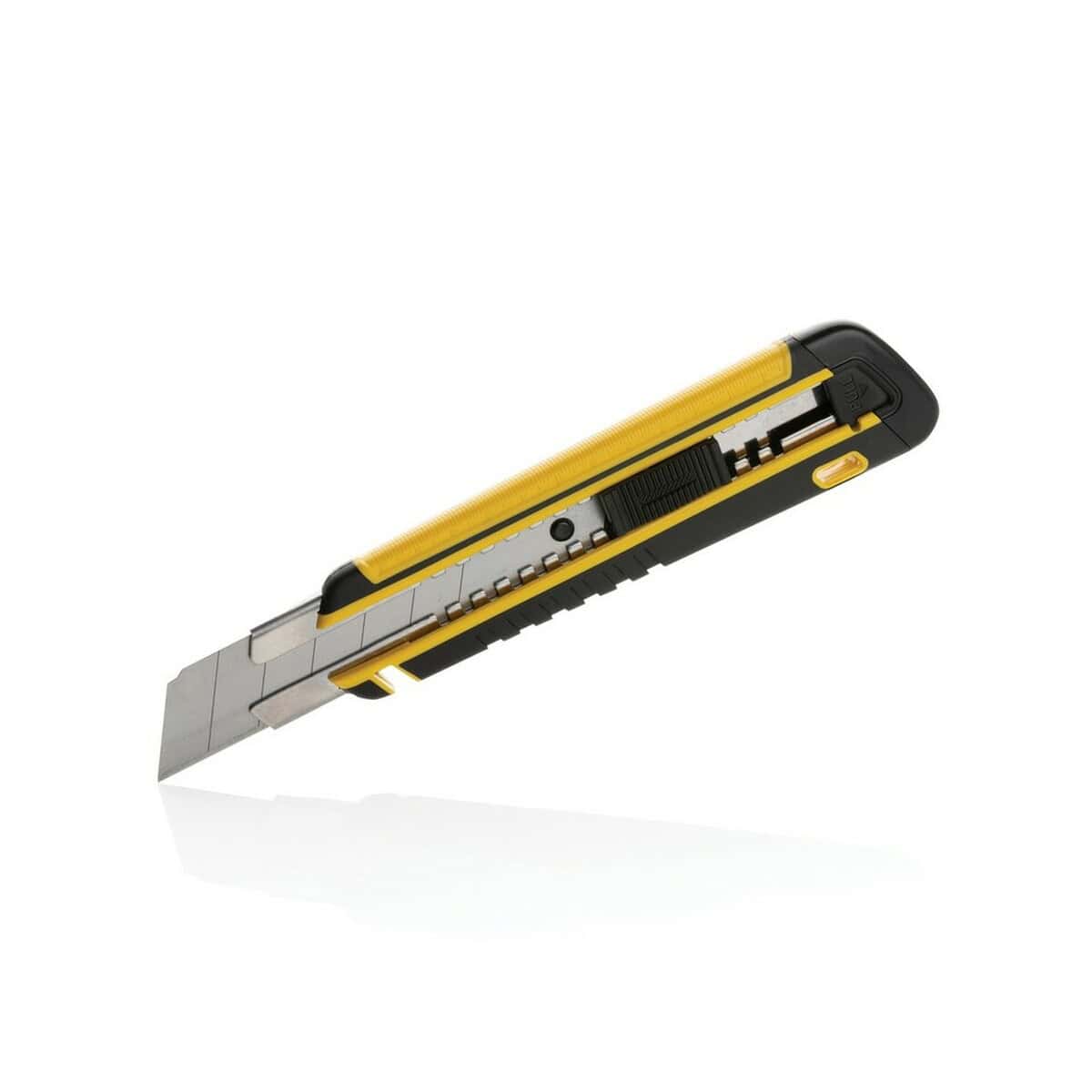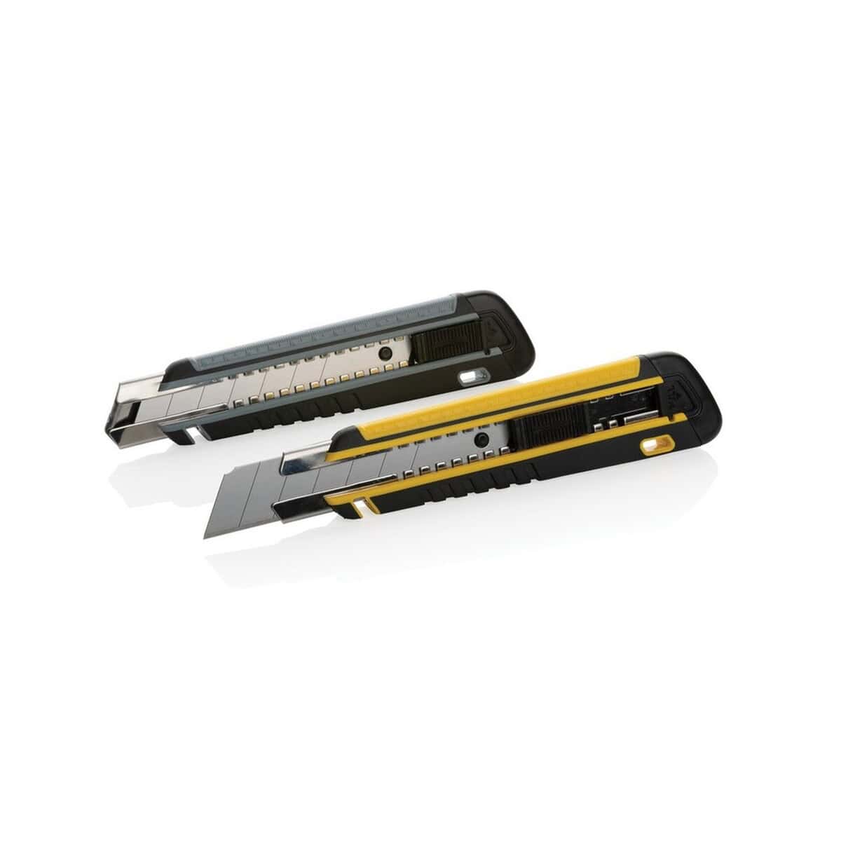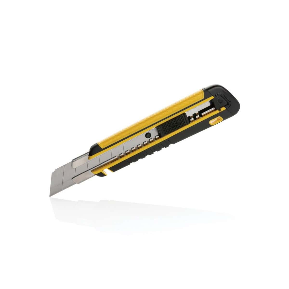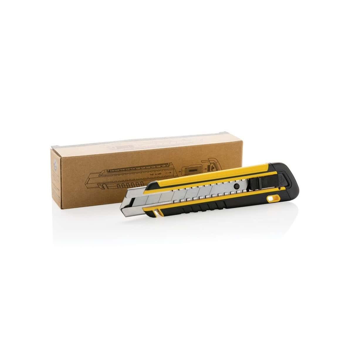 Szary lub żółty kolor obudowy ładnie komponuje się z każdym projektem graficznym, a ekologiczne pudełko kraft z certyfikatem FSC® mix podkreśla odpowiedzialny charakter kampanii. Niewielki ślad węglowy – zaledwie 0,95 kg CO₂ – czyni z narzędzia doskonały wybór dla marek promujących zrównoważony rozwój. Ten perfekcyjny gadżet jest również niezastąpiony w agencjach reklamowych, drukarniach wielkoformatowych czy pracowniach dekoratorskich, gdzie codziennie trzeba precyzyjnie przycinać folie, kartony i plakaty.
