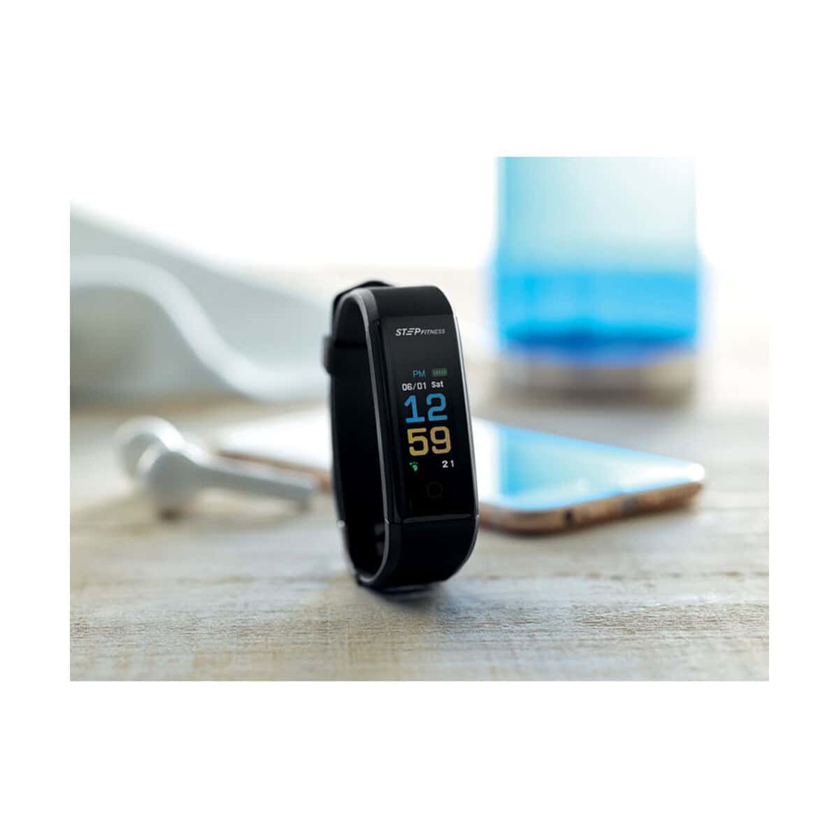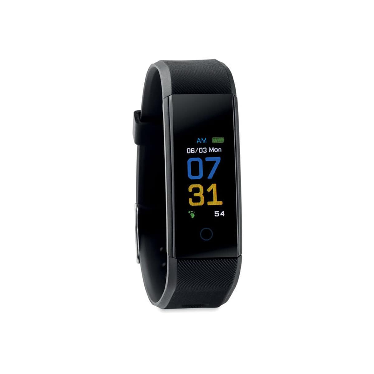 Opaska monitorująca zdrowie MUEVE WATCH to znakomity wybór dla każdej marki, która chce podarować klientom coś więcej niż zwykły upominek 😊. Ten smukły, czarny tracker łączy się bezprzewodowo w technologii 4.0, korzysta z akumulatora Li-Pol 90 mAh i współpracuje z darmową aplikacją Yoho Sport dla systemów iOS i Android. Dzięki temu użytkownik otrzymuje stały dostęp do pomiaru tętna, kroków, spalonych kalorii czy jakości snu, a odpinany pasek TPU o długości 25 cm sprawia, że ładowanie jest szybkie i wygodne. Całość waży zaledwie 55 g, więc praktycznie nie czuje się jej na nadgarstku.