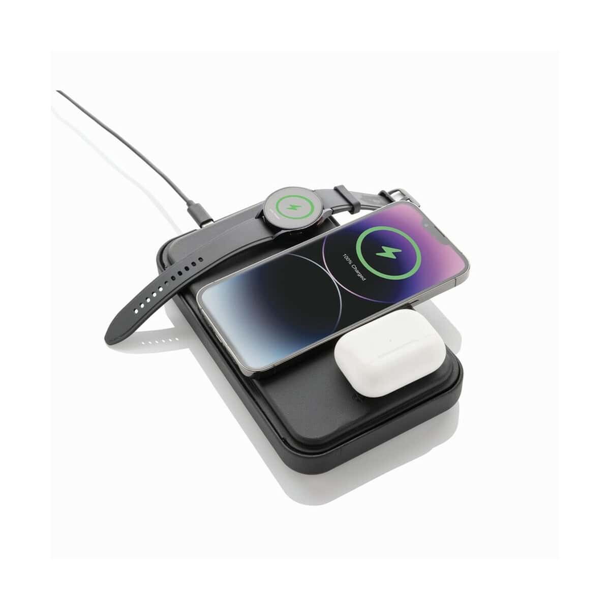 Organizer podróżny, ładowarka bezprzewodowa 3 w 1, 15W to wszechstronny gadżet, który łączy elegancję z funkcjonalnością – stworzony z myślą o wymagających użytkownikach smartfonów, smartwatchy i słuchawek. Wykonany z tpe i aluminium pochodzących z recyklingu, zachwyca kompaktowymi wymiarami 20 × 12 × 3 cm oraz głęboką, klasyczną czernią, która świetnie eksponuje firmowe logo czy kreatywny nadruk. Dzięki temu staje się doskonałym nośnikiem przekazu reklamowego – zarówno na targach, konferencjach, jak i podczas programów lojalnościowych. 🙂