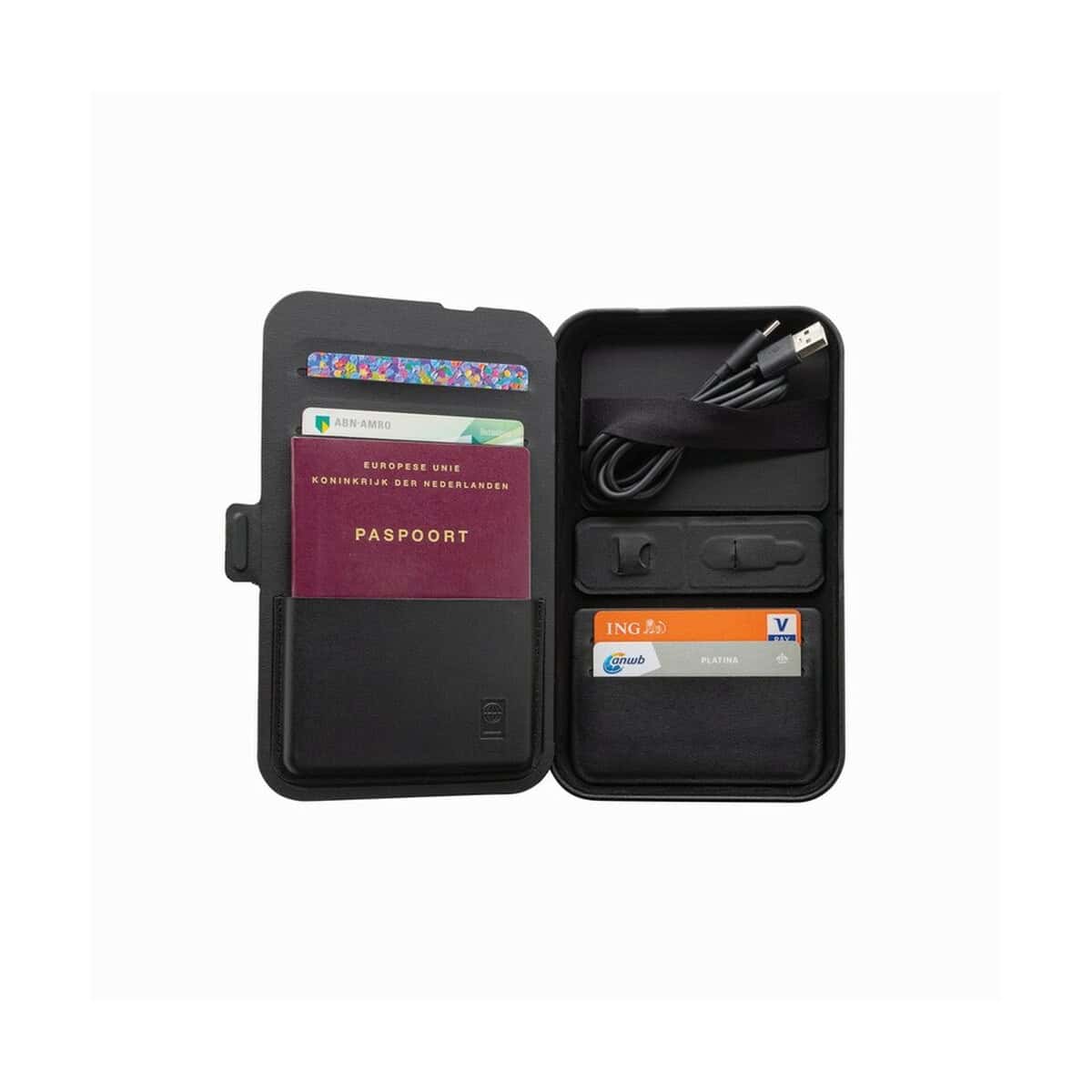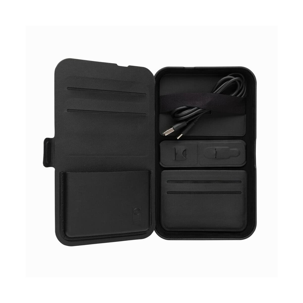 Wnętrze skrywa inteligentnie zaprojektowane przegrody na paszport, karty i kable, a także magnetyczny portfel wewnętrzny. Centralnym punktem jest moduł ładujący: ładowarka 15 W do telefonu, ładowarka 5 W do etui na słuchawki oraz ładowarka 2,5 W do Apple Watch. Zestaw uzupełnia 120-centymetrowy kabel TPE – wszystko zapakowane w eleganckie opakowanie FSC® mix, wolne od PVC. Parametry techniczne (wejście 9 V/3 A, wyjścia 15 W/5 W/2,5 W) gwarantują szybkie i bezpieczne zasilanie wielu urządzeń jednocześnie, co czyni produkt niezwykle użytecznym w podróży służbowej, na lotnisku czy w hotelu.