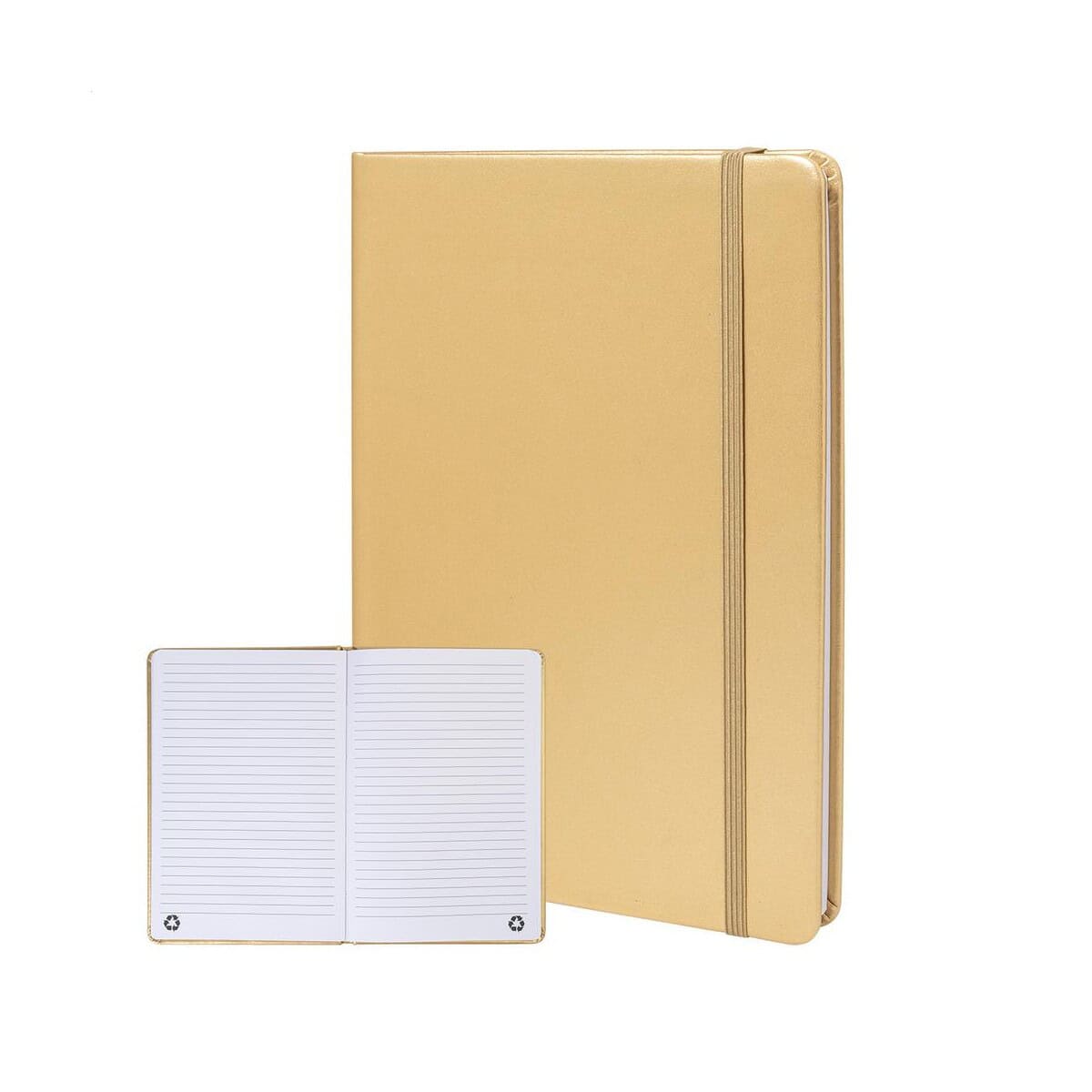 Oropuk A5 notes RPU to perfekcyjny wybór, gdy szukasz eleganckiego nośnika, na którym Twoje firmowe logo i wyrazisty nadruk będą prezentować się efektownie. Metaliczna, wykonana z recyklingowanej skóry PU oprawa w odcieniach złotym, srebrnym lub jasnoróżowym przyciąga wzrok, a jej przyjemna w dotyku faktura natychmiast podkreśla prestiż marki. W środku znajdziesz 100 kartek w linie z papieru pochodzącego z recyklingu, dzięki czemu ten gadżet jest zarówno stylowy, jak i przyjazny środowisku 😊.