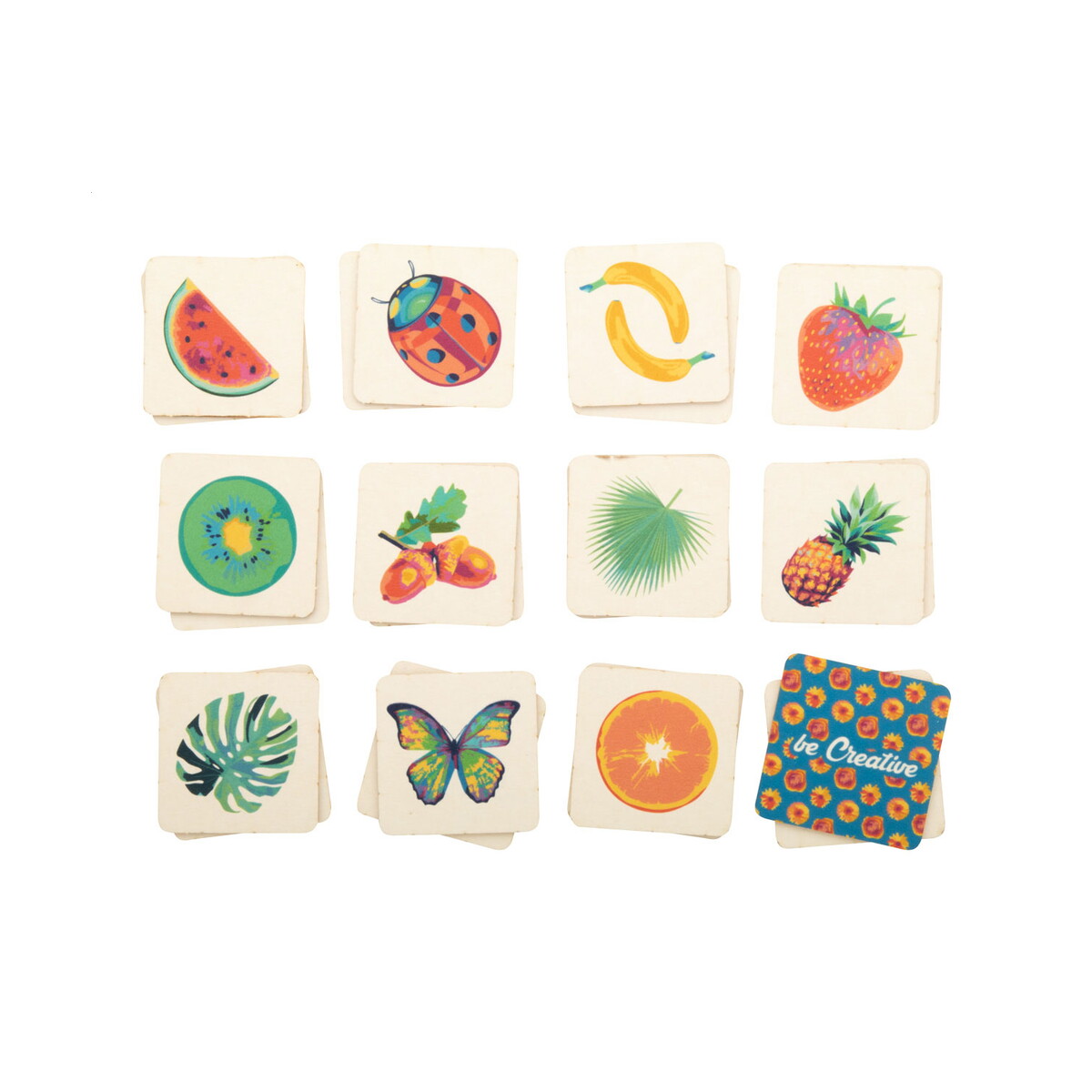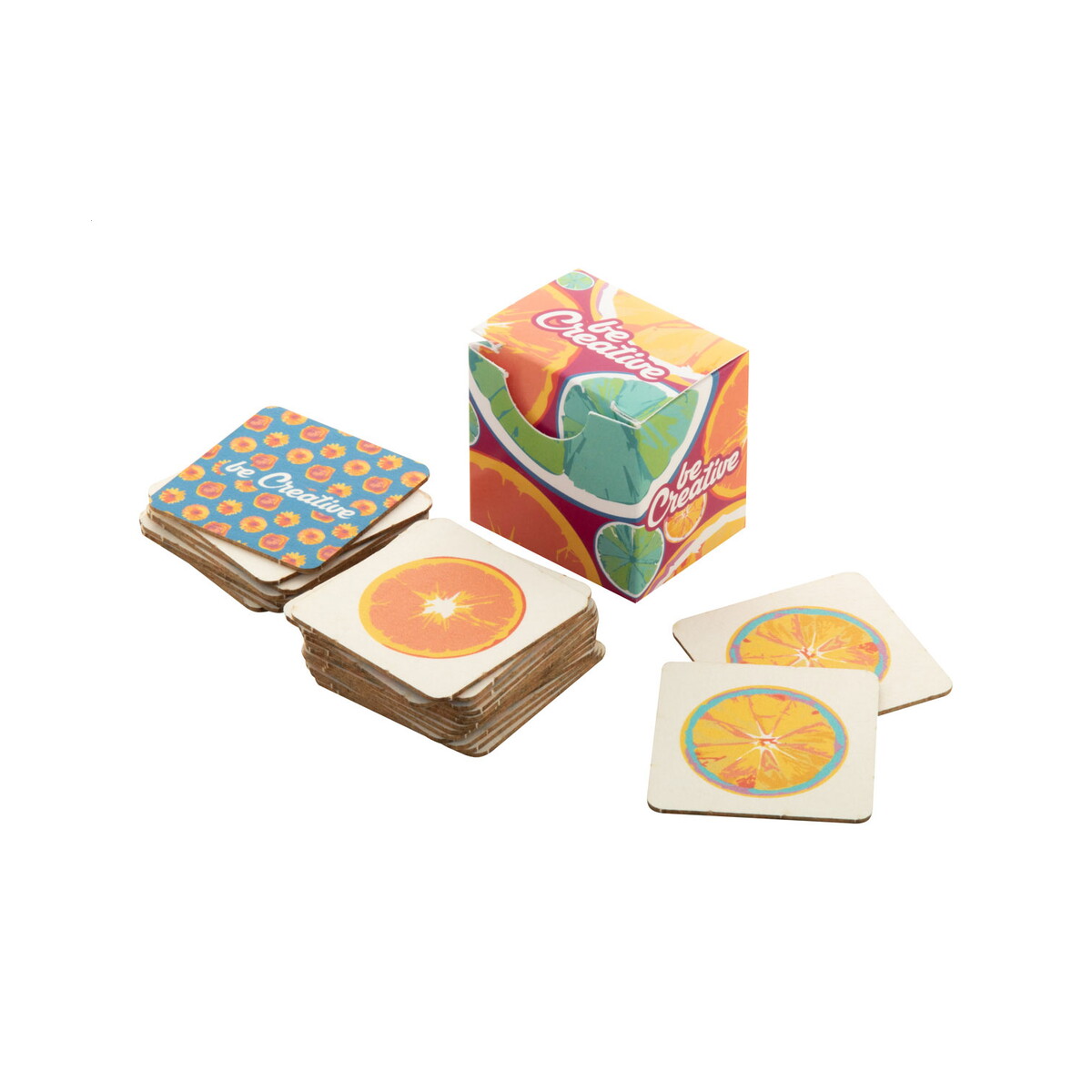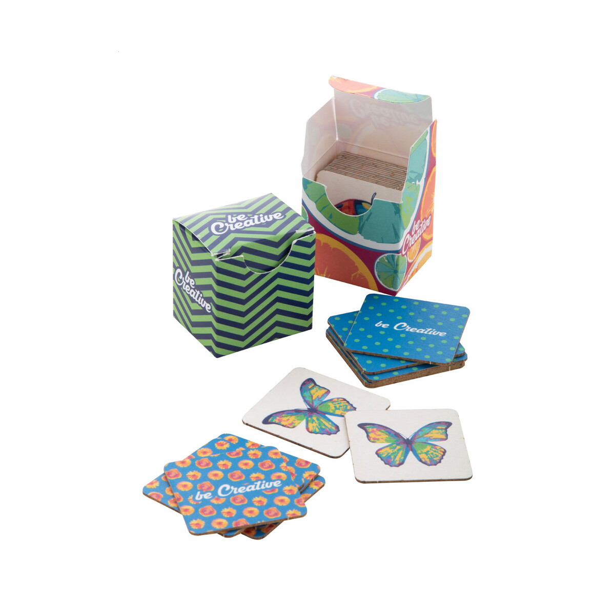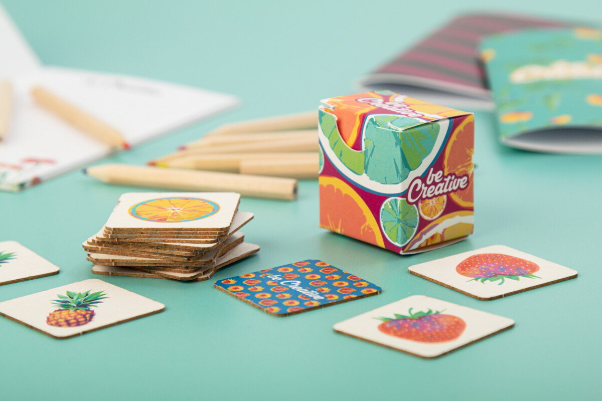W zestawie znajdują się 24 płytki o wymiarach 40 × 40 mm, zapakowane w solidne, ekologiczne pudełko z kartonu o wymiarach 35 × 42 × 42 mm i wadze zaledwie 20 g. Każdą stronę płytek zdobi pełnokolorowy nadruk, a druga strona czeka na wyeksponowanie Twojego logo. Całość wykonana z naturalnego kartonu i papieru to propozycja szczególnie atrakcyjna dla marek stawiających na rozwiązania przyjazne środowisku. Niska waga i kompaktowe rozmiary sprawiają, że produkt bez problemu zmieści się w wysyłkowym boxie, paczce PR czy zestawie powitalnym dla nowego pracownika.