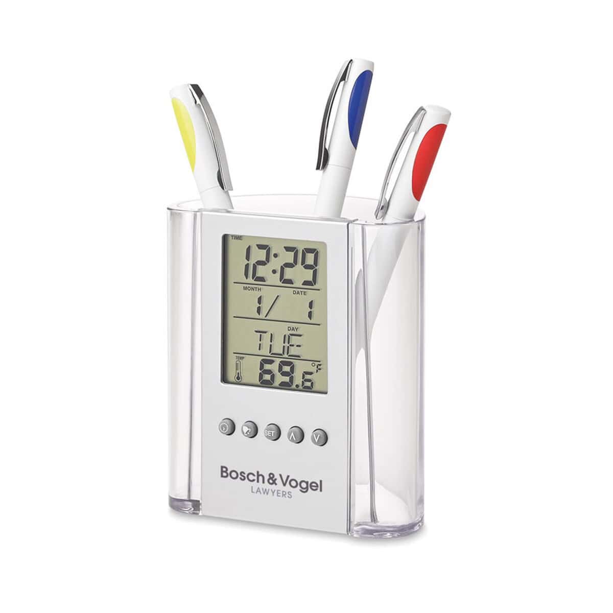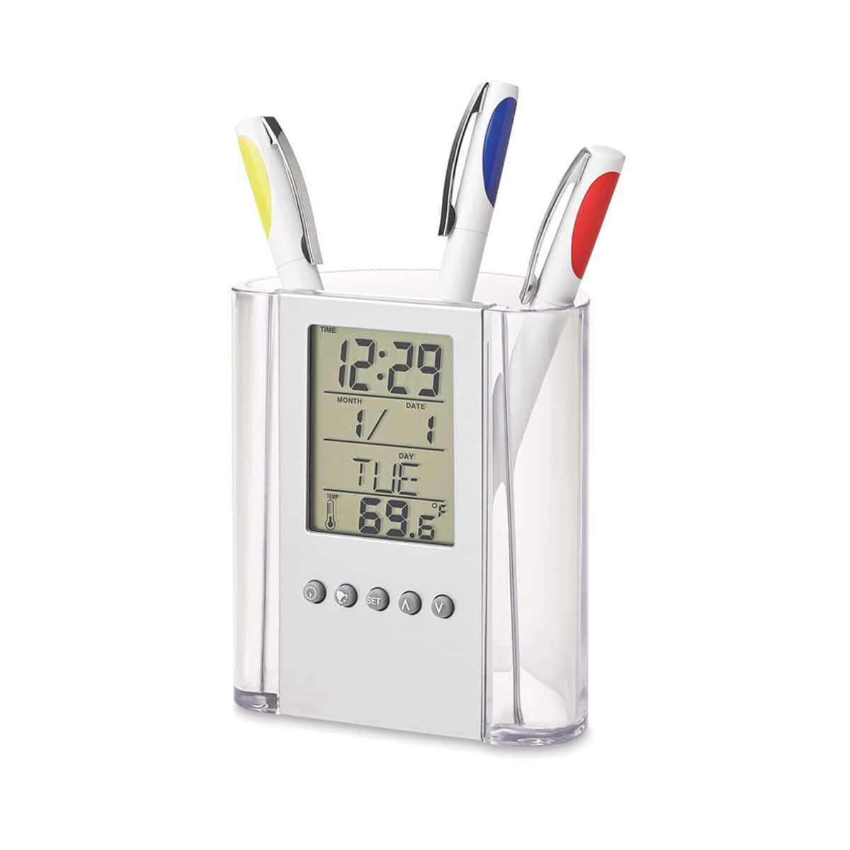 Piórnik z kalendarzem PRODIGY to niezwykle praktyczny i jednocześnie stylowy gadżet, który sprawdzi się w każdym nowoczesnym biurze. Jego kompaktowe wymiary 10x5x11,5 cm oraz lekka waga 0,215 kg czynią go znakomitym kompanem na każdym biurku, a trwały acrylic w eleganckim, przezroczystym wykończeniu dodaje mu nuty futurystycznego designu. Wbudowany budzik, kalendarz i termometr sprawiają, że masz wszystkie ważne informacje pod ręką, a dołączona 1 bateria umożliwia natychmiastowe użytkowanie. 😊