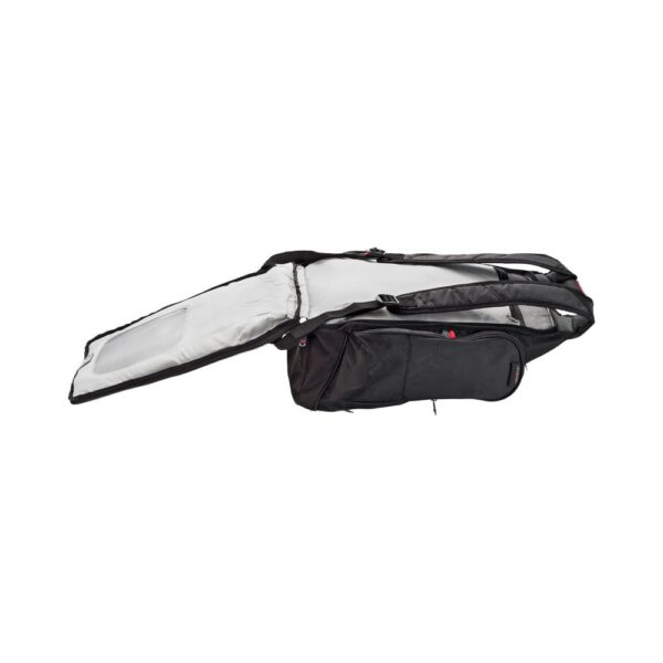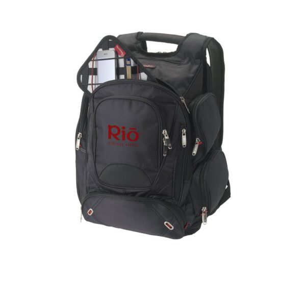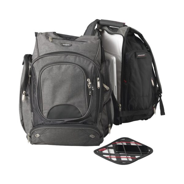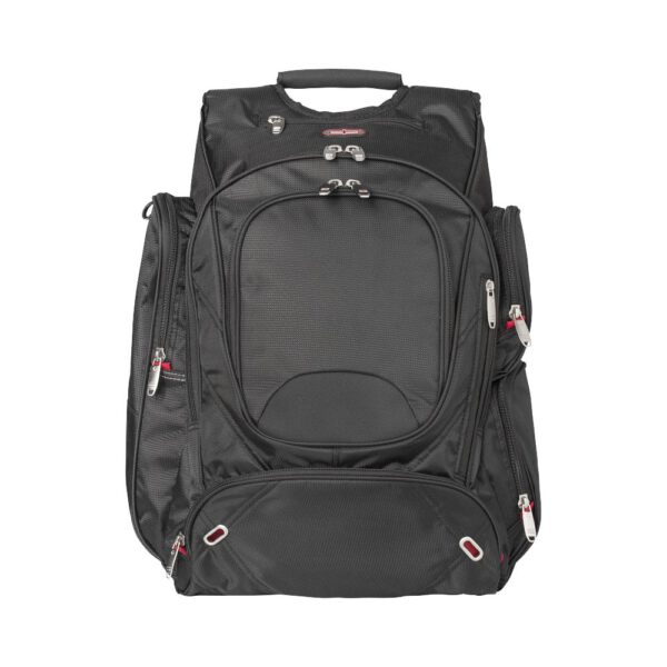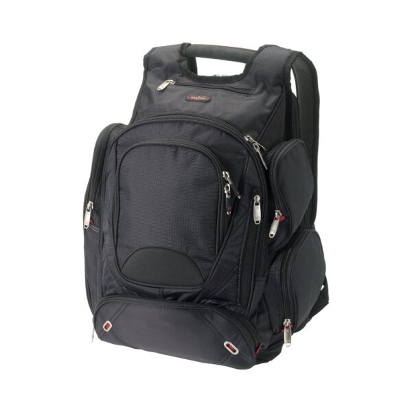 Ten wyjątkowy plecak to idealne rozwiązanie dla wielbicieli podróżowania. Objęty wzorem zastrzeżonym, wyposażony w część z laptopem, którą można rozłożyć na płasko na pasie skanera, pomaga w kontroli na lotnisku. Przegroda zapinana na zamek pomieści laptop 17″. Główna komora posiada przedziały na dokumenty, wewnętrzne boczne kieszenie oraz wyjmowany panel organizacyjny TechTrap. Kieszonka na media zamykana na zamek z dostępem do gniazda słuchawek, a przednia kieszeń na zamek pozwala na przechowywanie drobiazgów. Dolna przednia kieszeń i ukryte kieszonki zapewnią bezpieczeństwo cennych przedmiotów. Trzy pojemne kieszenie boczne uzupełniają opcje przechowywania. Dodatkowo plecak ma pasek umożliwiający zaczepienie na walizce.
