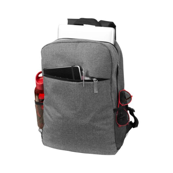 Plecak to doskonałe rozwiązanie dla osób poszukujących wytrzymałego i pojemnego plecaka. Posiada on dużą główną komorę zamykaną na zamek błyskawiczny z pokrowcem na 15” laptopa oraz przednią komorę zamykaną na zamek błyskawiczny. Pozwala to na szybki dostęp do urządzeń przenośnych. W zestawie znajdują się wyściełane paski na ramię, uchwyt do transportu oraz siatkowa kieszeń na butelkę z wodą. Oferuje on pojemność 18L, a ze względu na rodzaj barwników tkanin, splotów i nadruków mogą występować niewielkie różnice w kolorze rzeczywistego produktu.