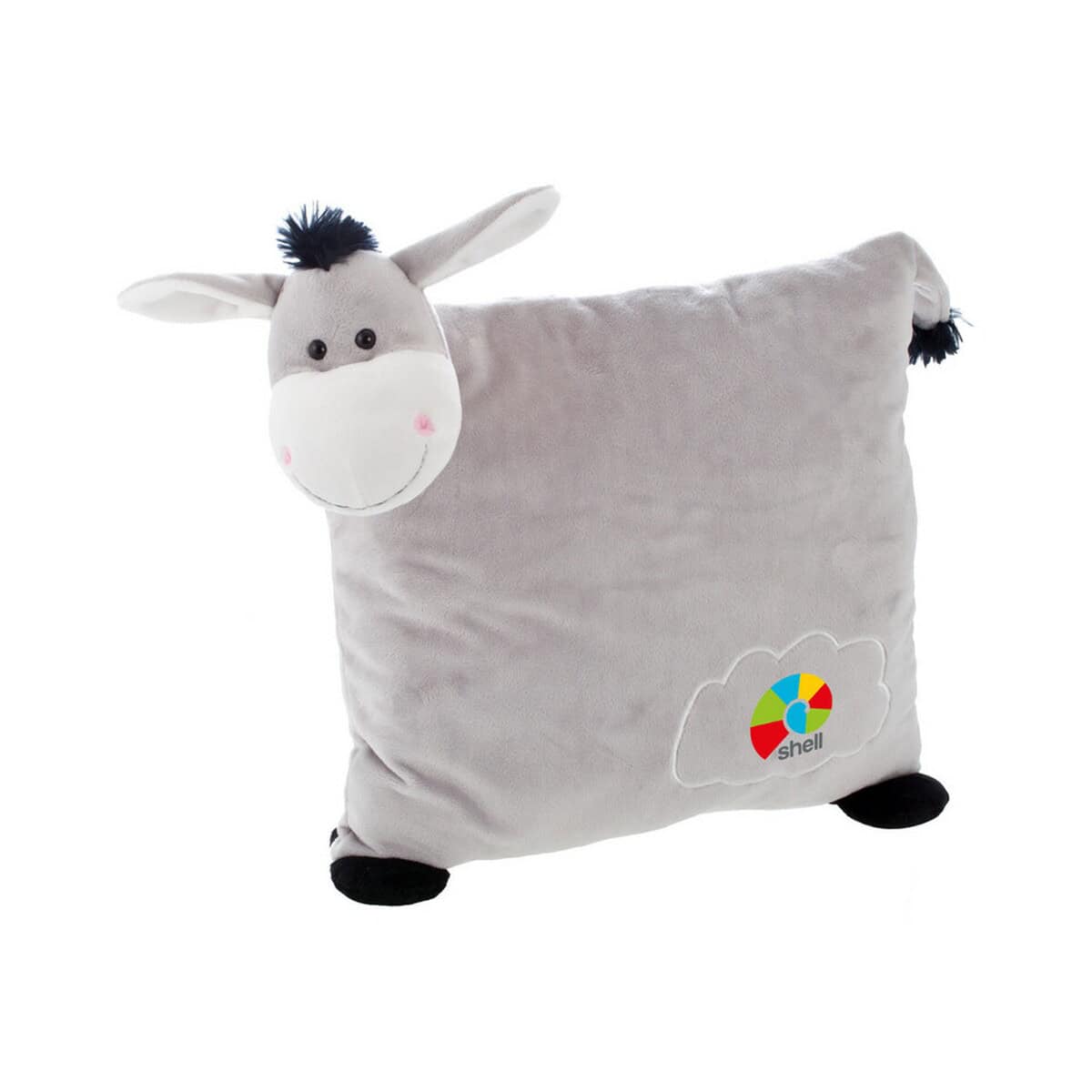 Pluszowa poduszka, osiołek | Logan to wyjątkowo mięciutki i przyjazny gadżet, który łączy w sobie funkcję maskotki oraz wygodnej podpórki pod głowę. Dzięki kompaktowemu rozmiarowi 30 cm i wadze zaledwie 234 g można go łatwo zabrać w podróż, do biura czy do domu, gdzie stanie się uroczą dekoracją kanapy. Staranne wykonanie z delikatnego, certyfikowanego pluszu w odcieniu szary sprawia, że produkt jest bezpieczny nawet dla najmłodszych. Na umieszczonej przy osiołku chmurce pozostawiono przestrzeń pod wyrazisty nadruk, który wyróżni Twoje logo 😊.