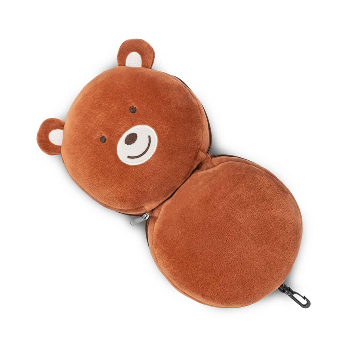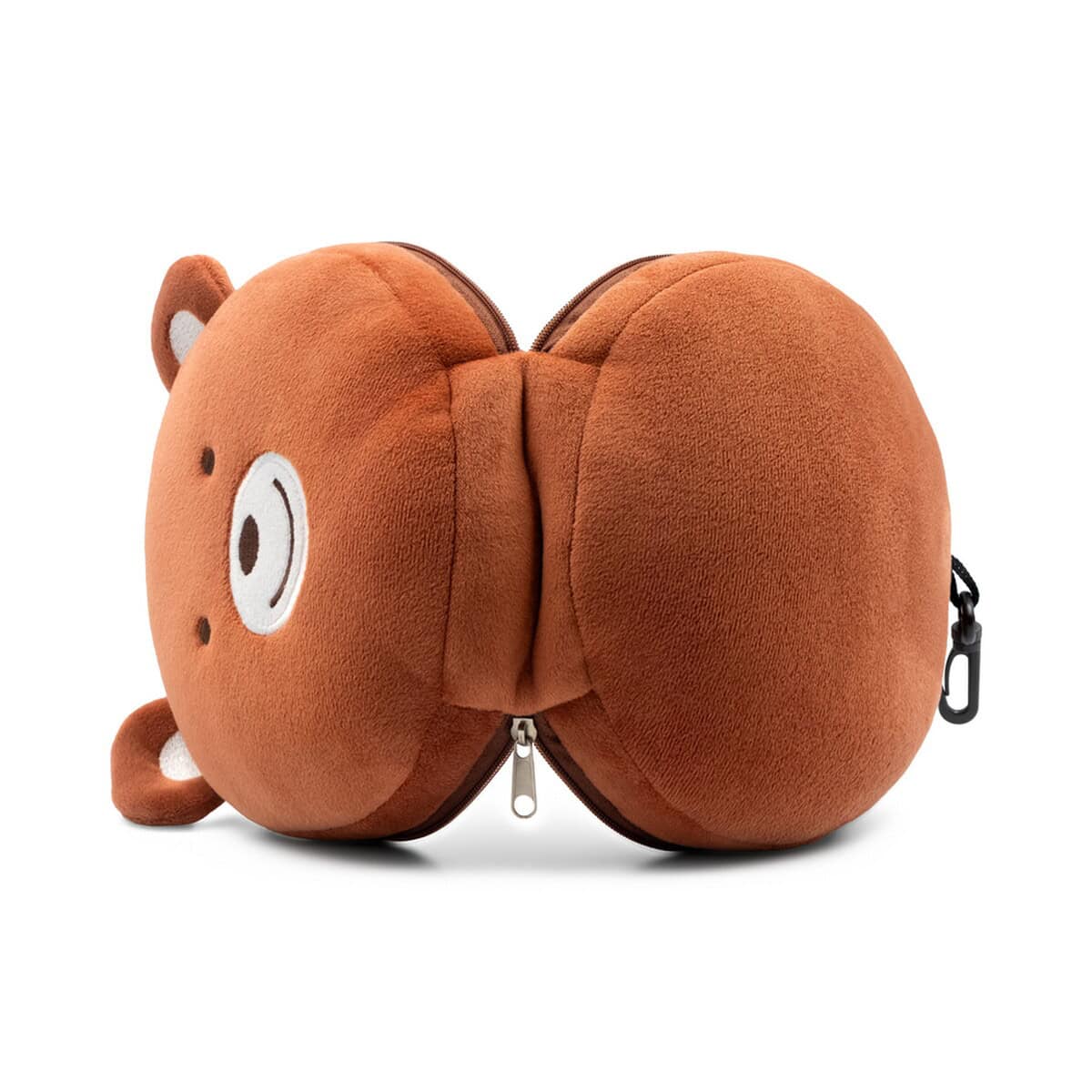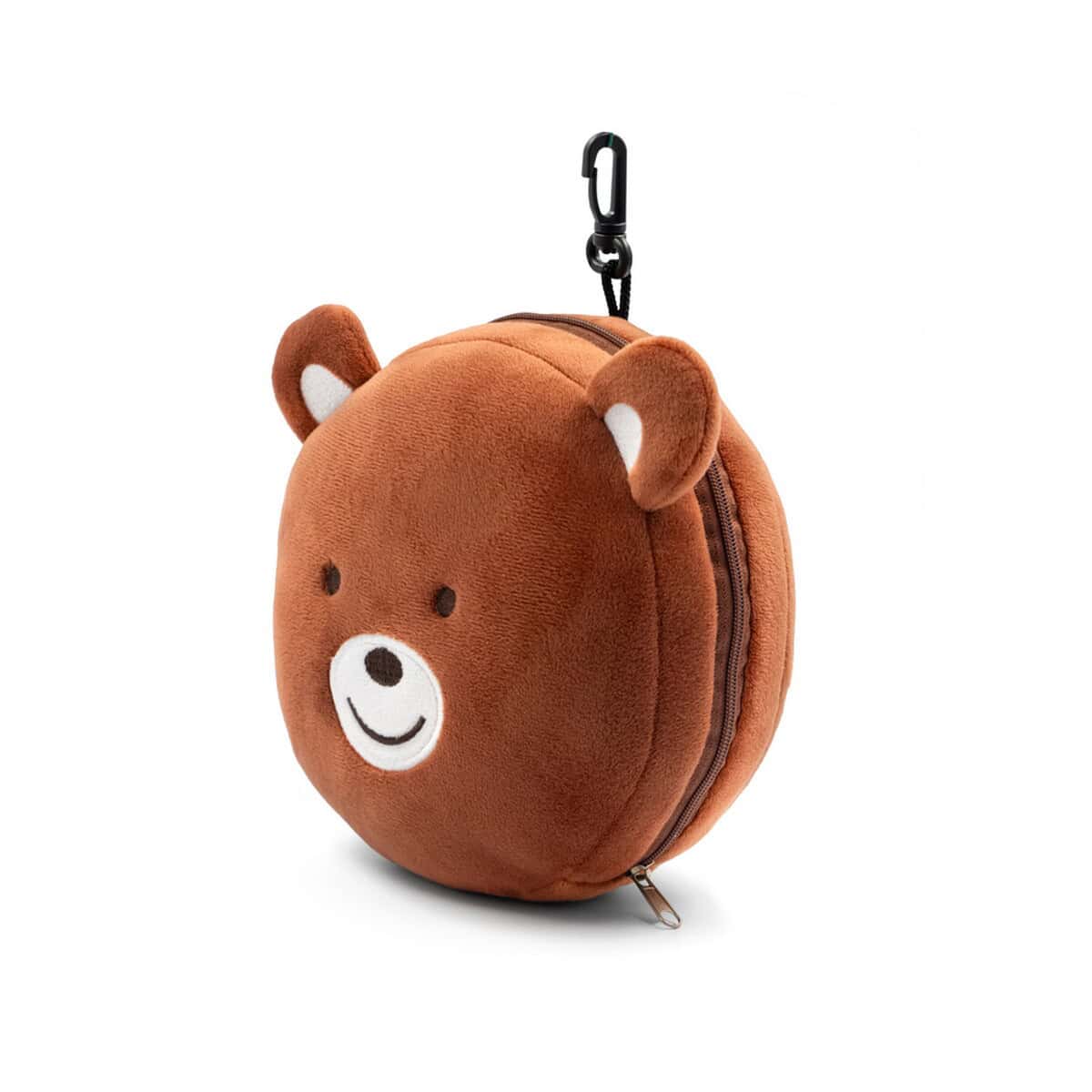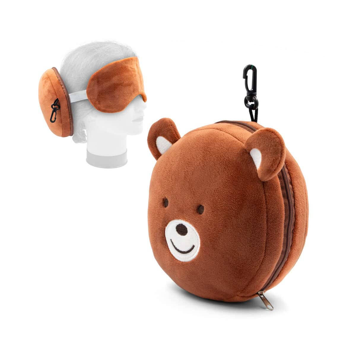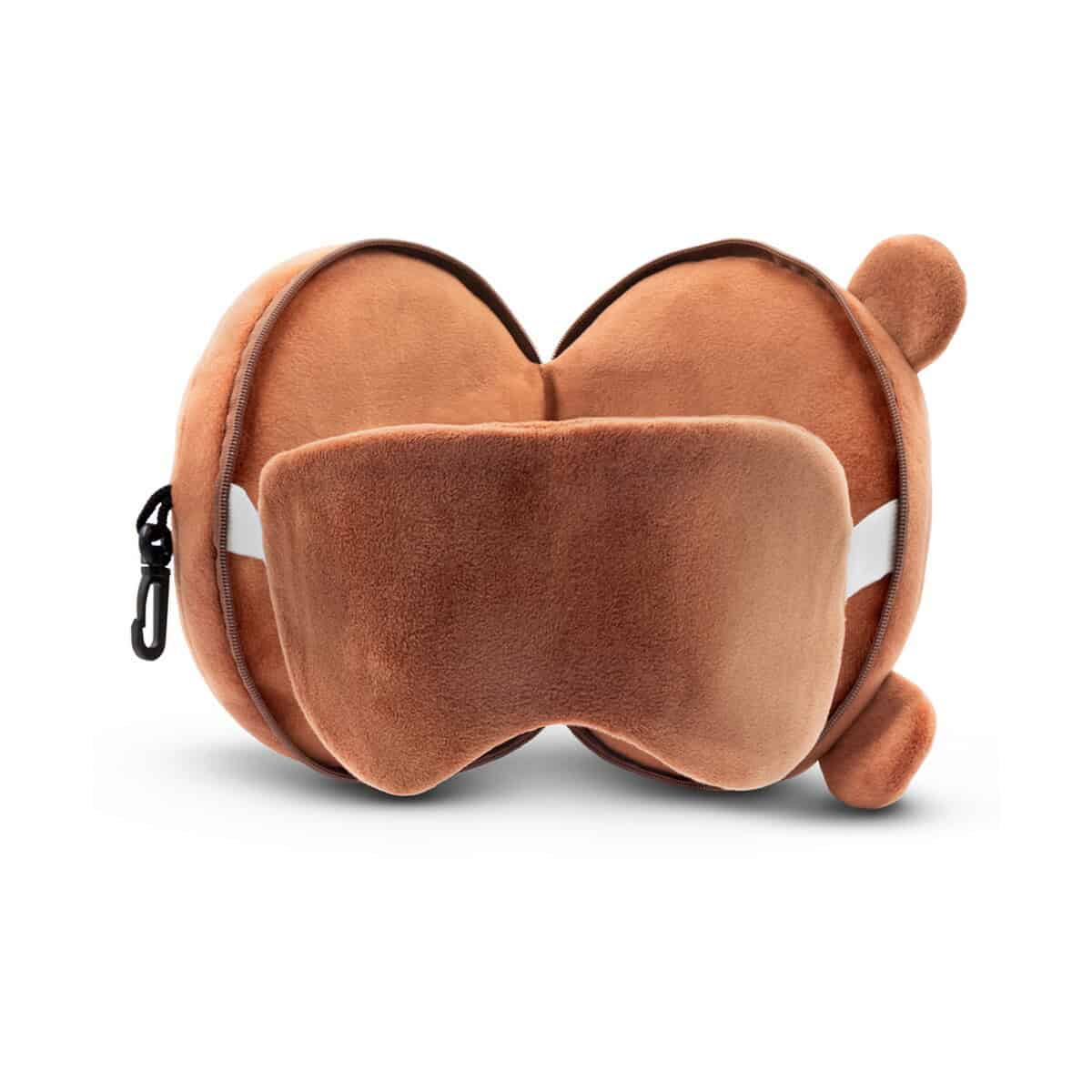 Pluszowa poduszka, zagłówek podróżny, maska na oczy, miś | Ren to prawdziwie wszechstronny gadżet, który zamieni każdą podróż w przyjemną przygodę 😊. Miękki plusz w ciepłym, brązowym kolorze otula szyję, jednocześnie chroniąc oczy przed światłem dzięki dołączonej masce, a sympatyczny kształt misia wywołuje uśmiech zarówno u dzieci, jak i dorosłych. Zmyślnie ukryty zamek pozwala wygodnie odpiąć elementy, co czyni zestaw nie tylko praktycznym, lecz także łatwym w utrzymaniu czystości.