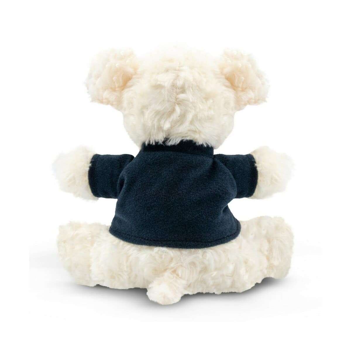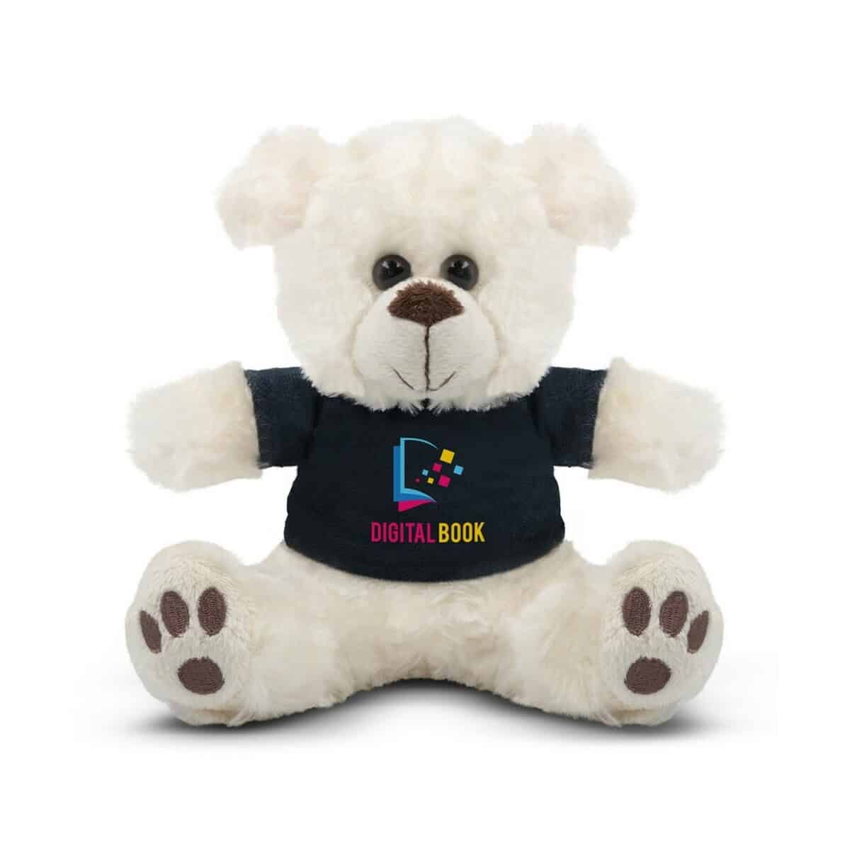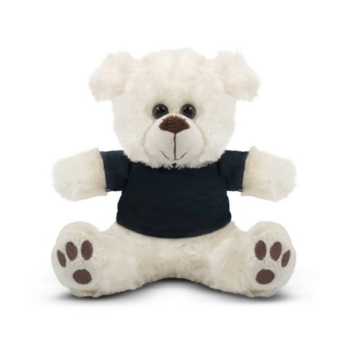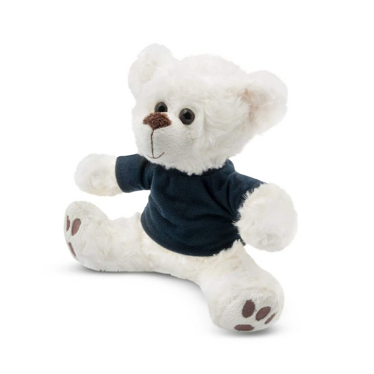 Maskotka urzeka detalami: Wymiary: 18 cm, Waga: 70 g, Materiał: plusz, poliester, kolor beżowy, a miękkość futerka sprawia, że trudno się z nią rozstać. Granatowa koszulka, pakowana osobno, zapewnia łatwy dostęp podczas znakowania. Dzięki temu nadruk jest wyraźny i trwały, a każdy miś staje się niepowtarzalnym nośnikiem Twojej historii 🎁.