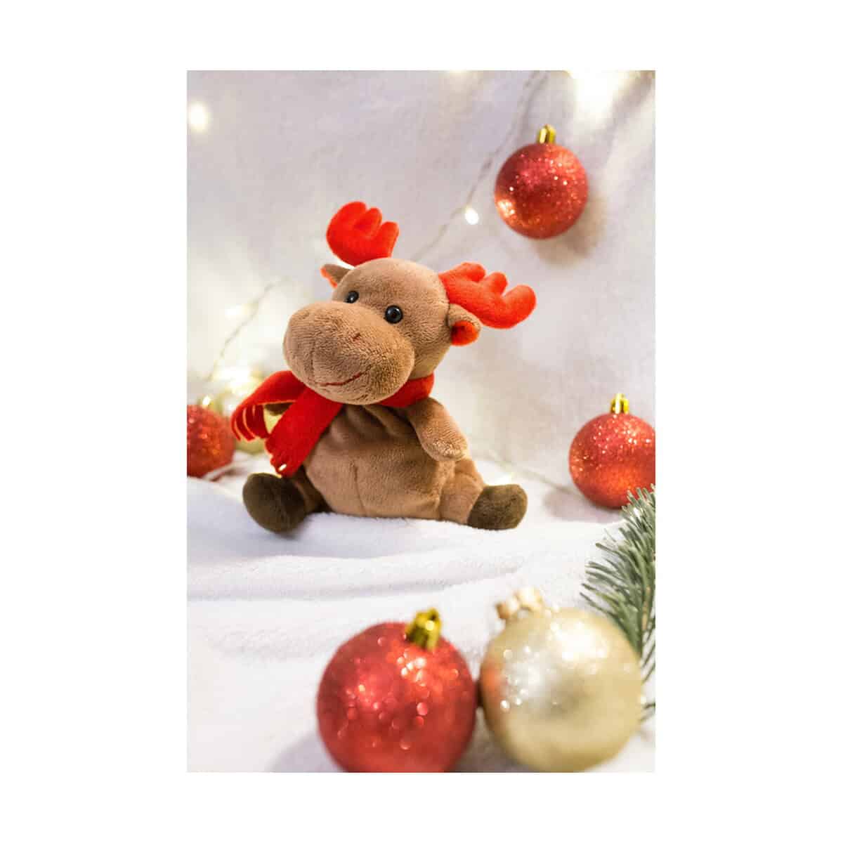 Pluszowy renifer | Archie to prawdziwie świąteczny bohater, który z łatwością skradnie serca klientów i pracowników. Jego sympatyczna buźka, mięciutkie rogi i uroczy czerwony nosek sprawiają, że od pierwszego wejrzenia wywołuje uśmiech 🙂. Dzięki kompaktowemu rozmiarowi 16 cm oraz wadze zaledwie 60 g doskonałe sprawdza się jako upominek wręczany podczas eventów, konferencji czy akcji promocyjnych. Solidne obciążenie z drobnych kulek umieszczone w korpusie pomaga mu stabilnie siedzieć na biurku, półce lub ladzie recepcyjnej, co czyni go nie tylko ozdobą, ale i użytecznym nośnikiem przekazu.