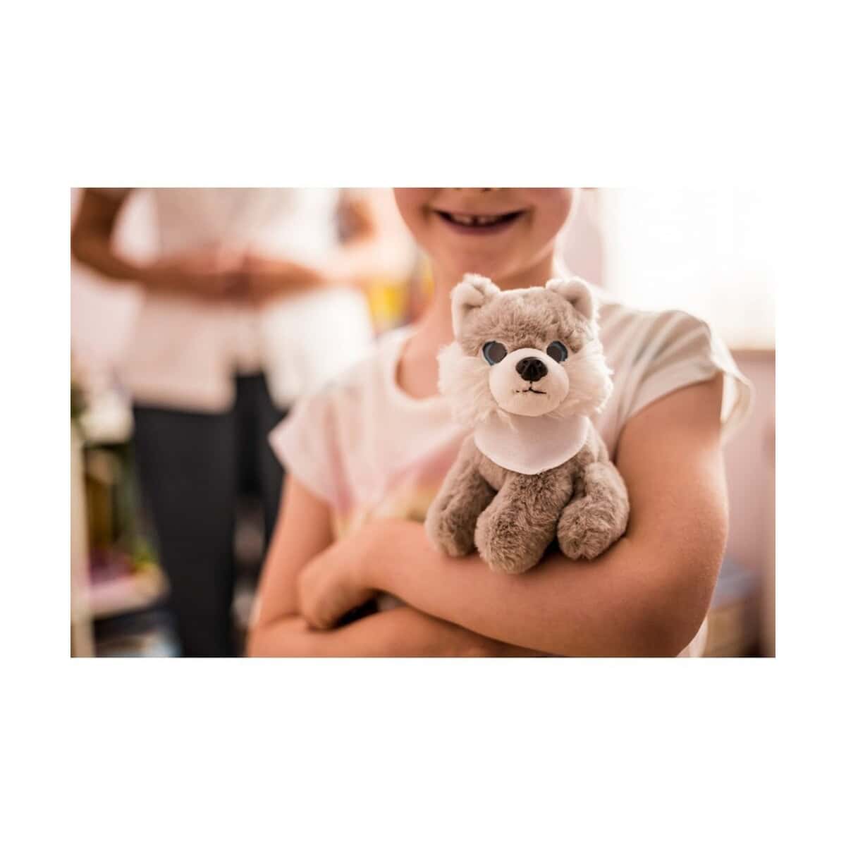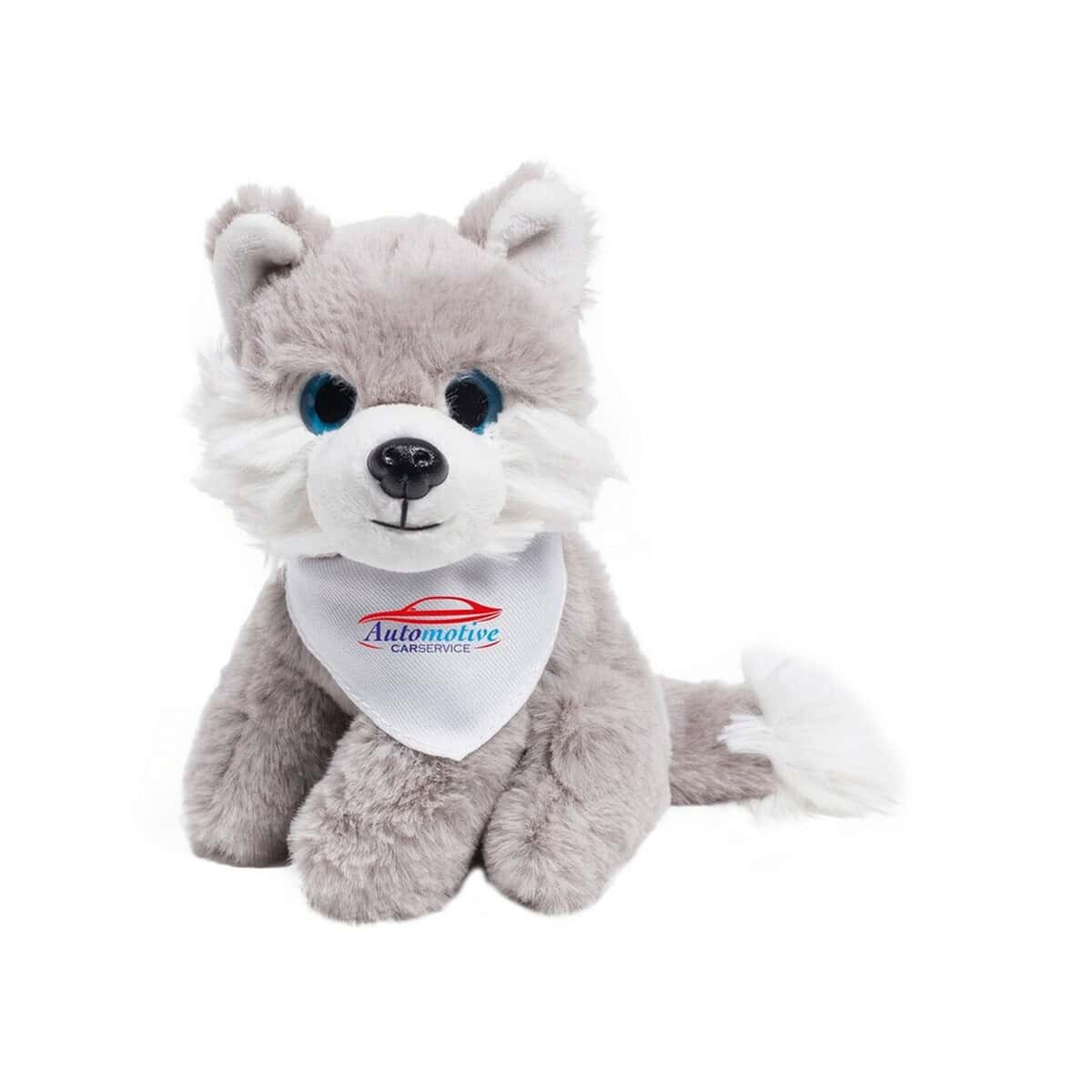 Pluszowy wilk | Fang to znakomity ambasador ciepłych emocji, który już od pierwszego spojrzenia budzi sympatię 😊. Maskotka mierzy zaledwie wymiary 14 cm i waży jedynie waga 65 g, dzięki czemu bez trudu zmieści się w dziecięcym plecaku, w torbie konferencyjnej czy na biurku pracownika. Wykonany z mięciutkiego materiału: plusz, poliester, w eleganckim kolory szarym, prezentuje się stylowo, a jednocześnie pozostaje przyjemny w dotyku. Do zestawu dołączona jest biała chustka pod nadruk, pakowana oddzielnie, co pozwala zachować świeżość i perfekcyjną czystość materiału przed znakowaniem.