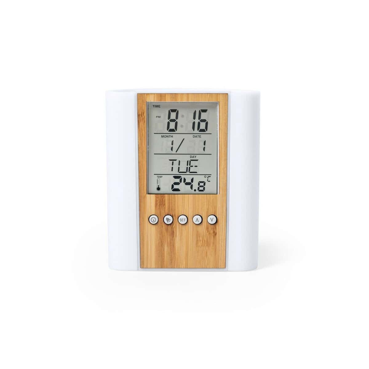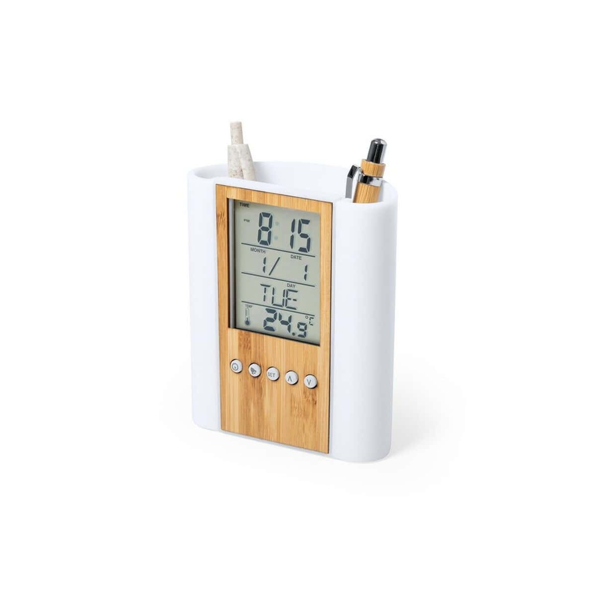 Pojemnik na przybory do pisania, zegar wielofunkcyjny to niewielki, a jednocześnie niezwykle praktyczny gadżet, który zamieni każde biurko w nowoczesne centrum dowodzenia 😊. W obudowie wykonanej z eleganckiego bambusowego elementu o wymiarach 10,2 × 11,9 × 5,4 cm znajdziesz nie tylko miejsce na długopisy i ołówki, ale również kalendarz, zegar, termometr oraz alarm z funkcjami minutnik i przypomnienie o urodzinach. Ten kompaktowy pomocnik wykonany z połączenia bambus & ABS doskonale łączy naturę z technologią, tworząc estetyczne dopełnienie biurowej przestrzeni.
