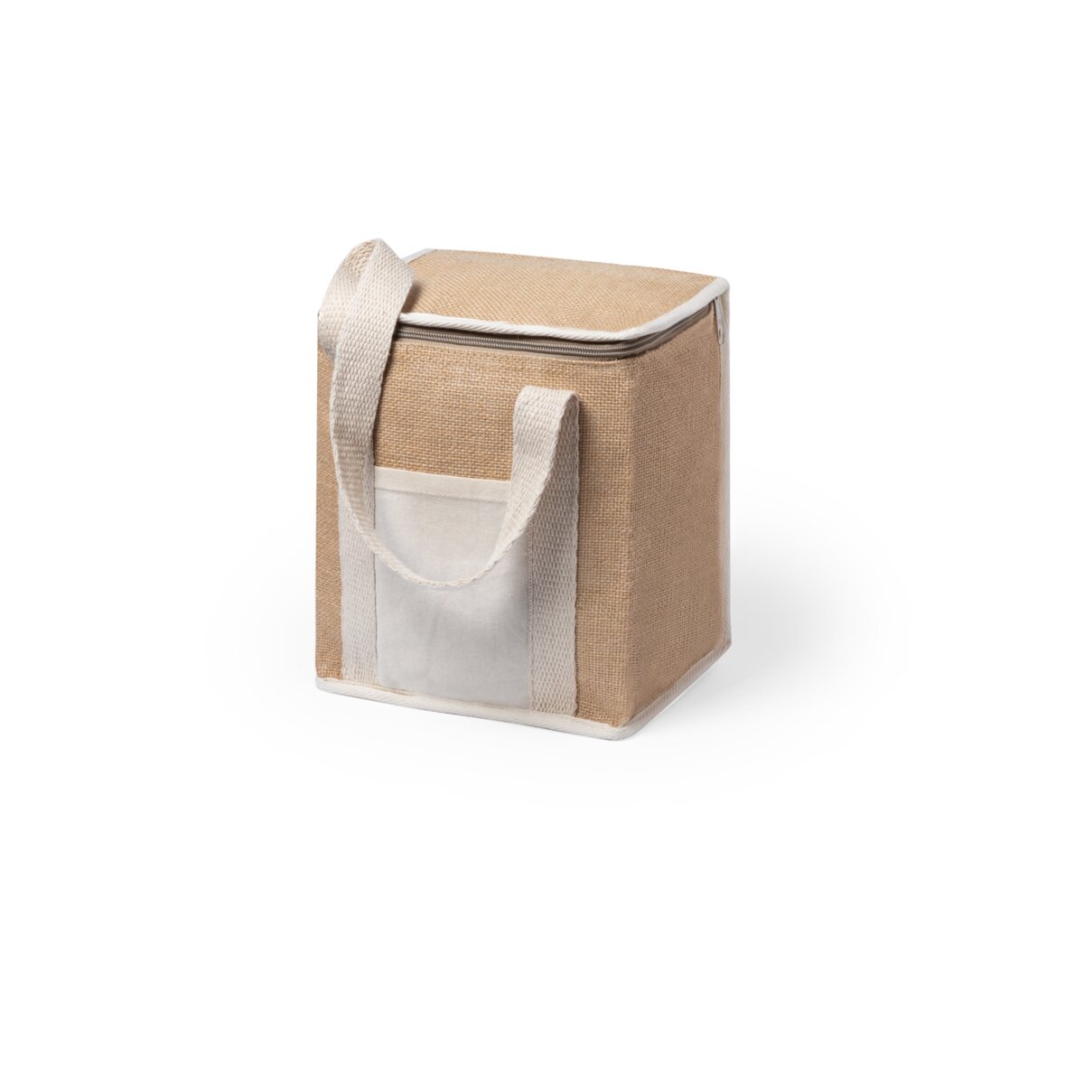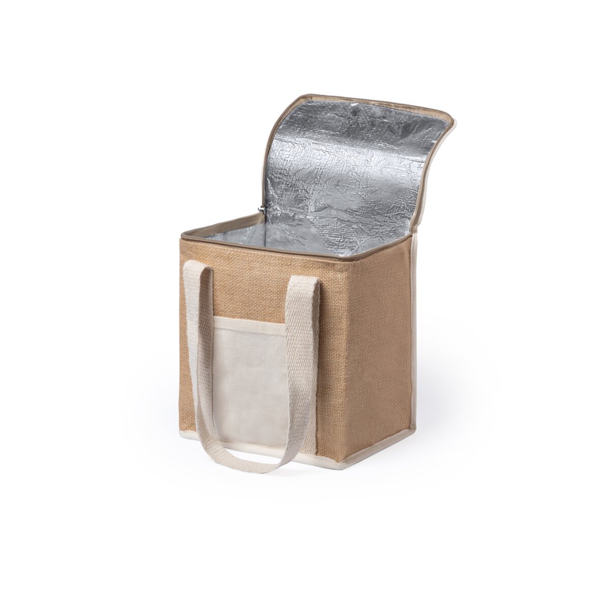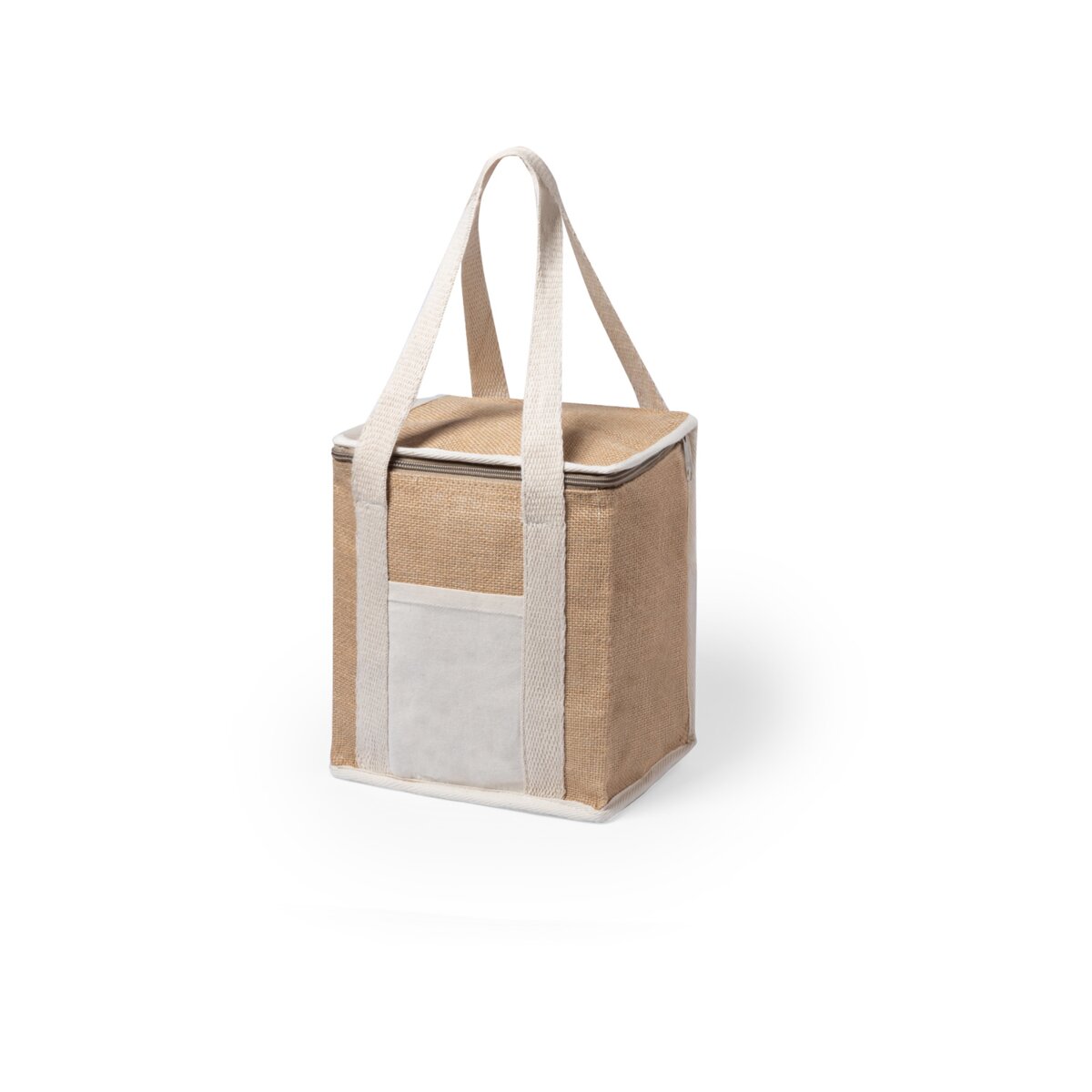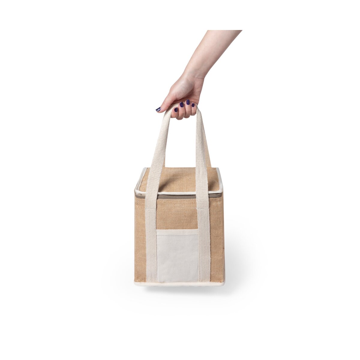Dzięki zamontowanemu zamkowi, zapinana torba termoizolacyjna jest wytrzymała i wygodna w użyciu. Juta i bawełna, z których jest wykonana, są solidne i trwałe, a aluminiowa wyściółka dodatkowo zwiększa jej wytrzymałość. Przednia kieszeń z bawełny i wygodnym zamkiem błyskawicznym daje możliwość wygodnego i bezpiecznego przechowywania dodatkowych rzeczy.