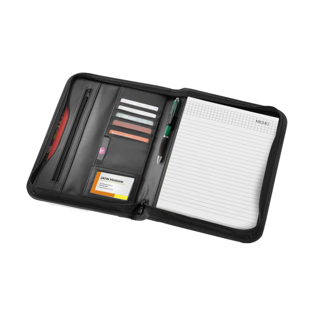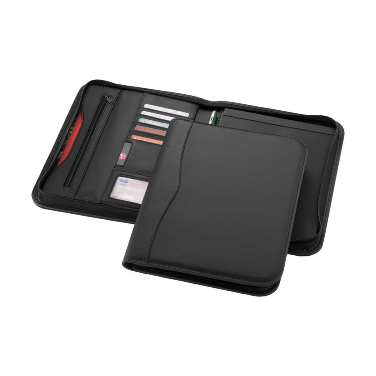 Wyróżniają go następujące, kluczowe cechy: format A4, praktyczna przegródka oraz zamykana kieszeń na dokumenty, 20-stronicowy notatnik z podszewką i pętelka na długopis. Całość chroni solidny zamek błyskawiczny, który zabezpiecza zawartość przed wypadnięciem. Starannie dobrany materiał: imitacja skóry nie tylko wygląda szlachetnie, lecz także jest wytrzymały na codzienne użytkowanie. Kompaktowe wymiary 34 × 2,5 × 25 cm oraz optymalna waga 750 g gwarantują wygodę przenoszenia, a ponadczasowy kolor czarny nadaje mu biznesowego charakteru.