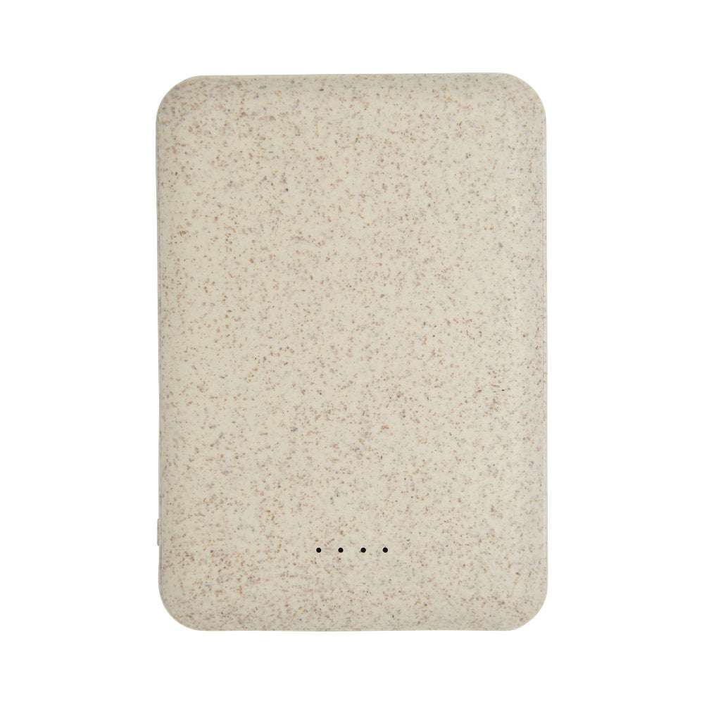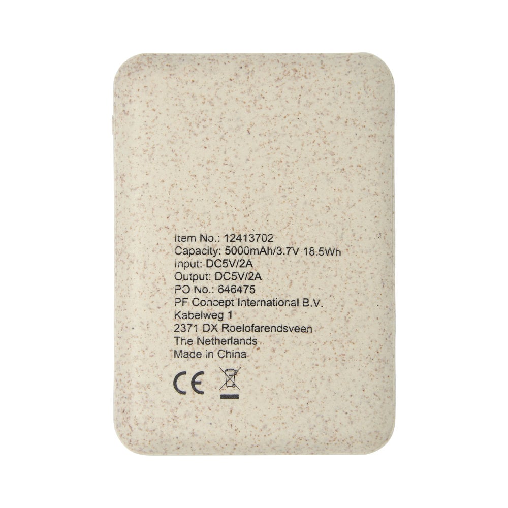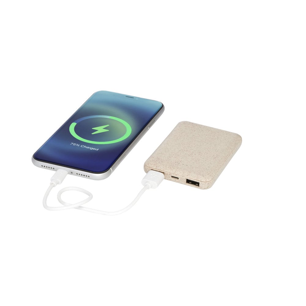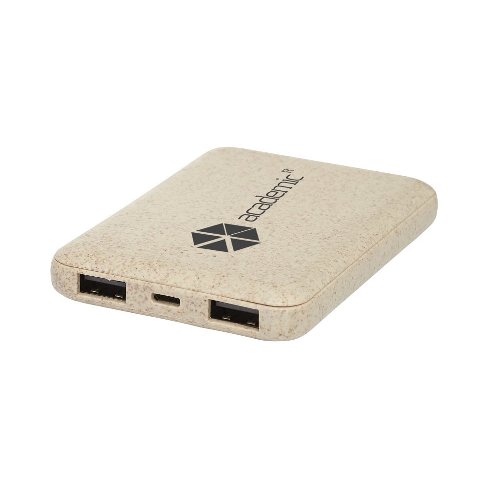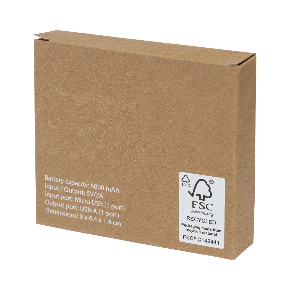 Lekki i kompaktowy powerbank o pojemności 5 000 mAh jest idealnym rozwiązaniem do ładowania urządzeń elektronicznych wszędzie tam, gdzie jest to potrzebne. Wykonany został z połączenia słomy pszenicznej i tworzywa sztucznego, co pozwoliło na zmniejszenie ilości potrzebnego plastiku. Powerbank posiada podwójne wyjście USB umożliwiające jednoczesne ładowanie dwóch urządzeń. Zestaw zawiera kabel ładowania micro USB oraz instrukcję wydrukowaną zgodnie ze standardem FSC, a całość zapakowana jest w pudełko z certyfikatem 100% FSC. Powerbank jest idealnym rozwiązaniem dla osób aktywnych i lubiących podróżować.