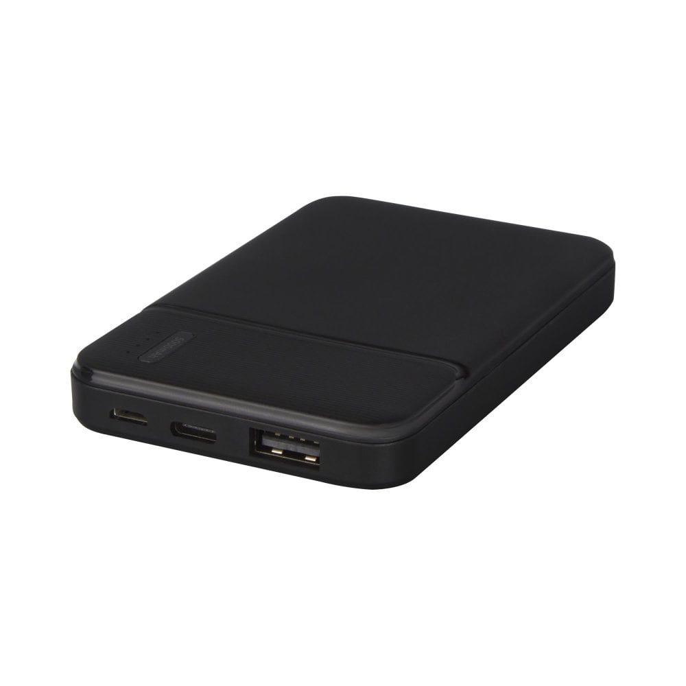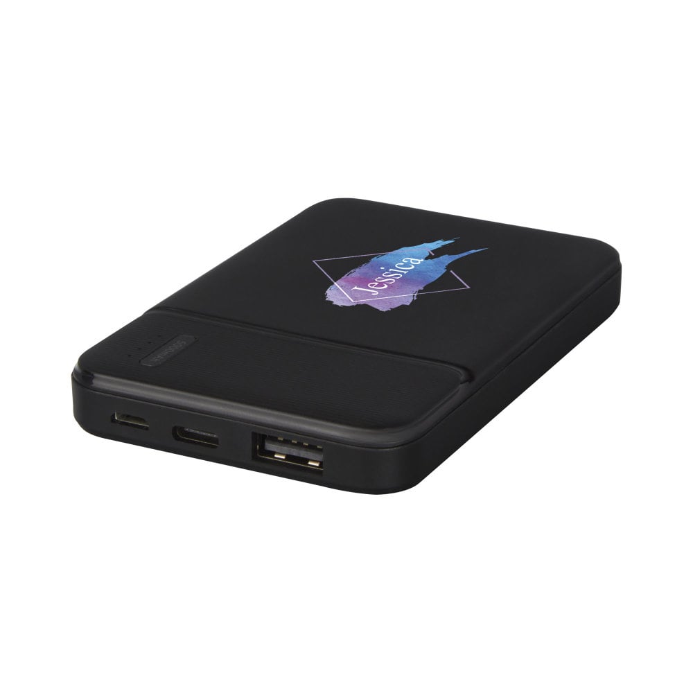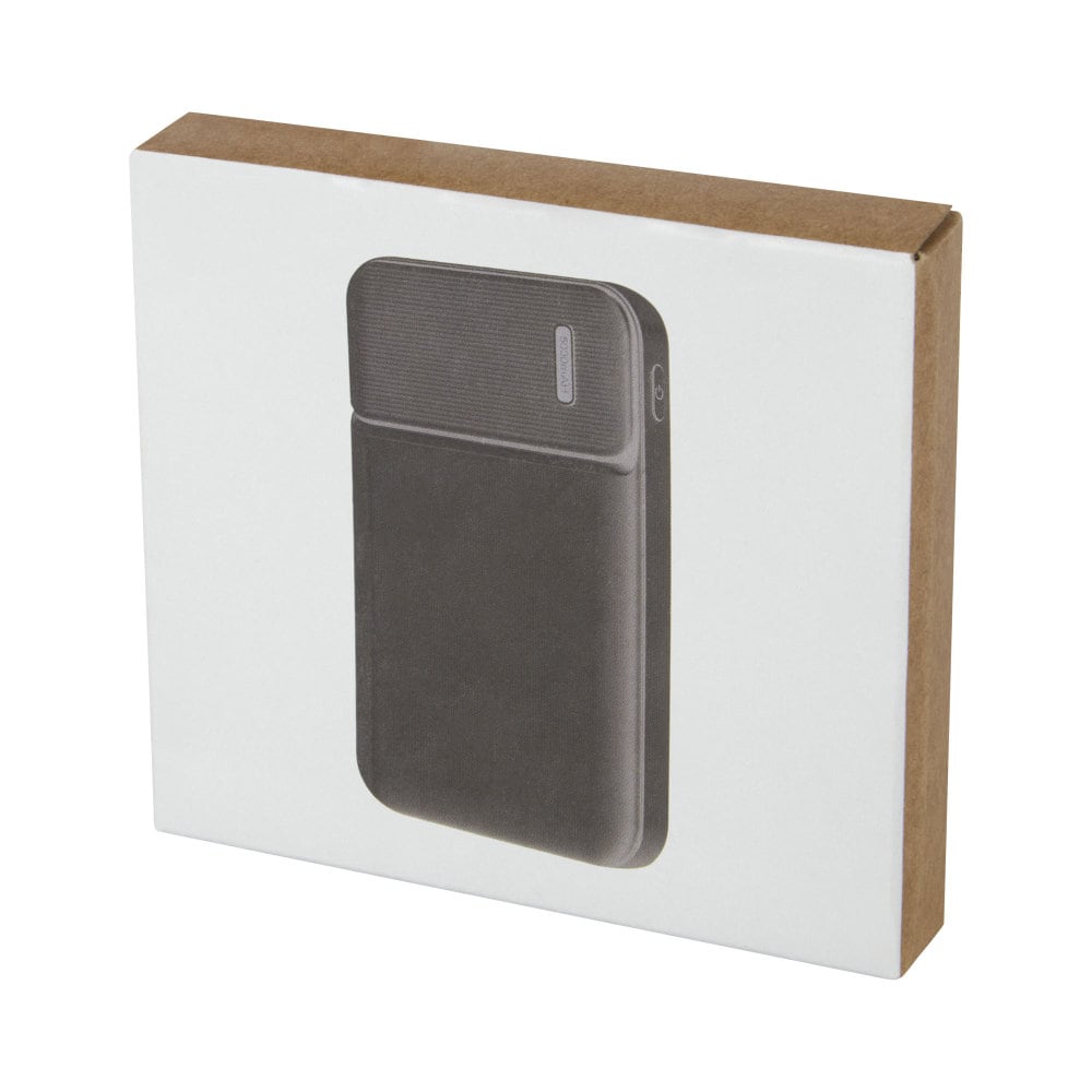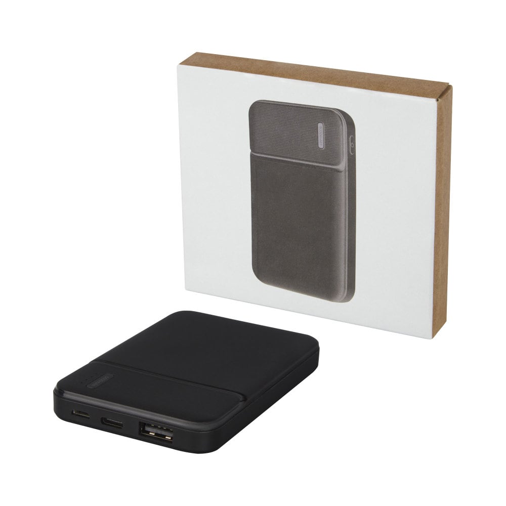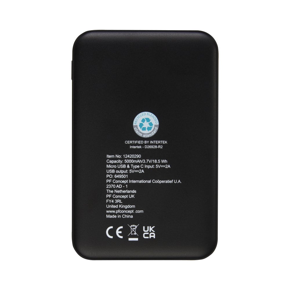 Powerbank wykonany z certyfikowanego przez RCS plastiku ABS pochodzącego z recyklingu to doskonały wybór dla osób dbających o środowisko. Posiada a wytrzymałą baterię litowo-polimerową klasy A o pojemności 5000 mAh, dzięki czemu zawsze masz dostęp do energii. Dodatkowo wskaźniki mocy wskazują poziom energii, dzięki czemu wiesz kiedy należy ponownie naładować urządzenie. Wejście typu C 5 V / 2 A oraz wyjścia Micro USB 5 V / 2 A i USB 5 V / 2A pozwalają szybko i wygodnie naładować powerbank. Powerbank jest dostarczany w pudełku upominkowym wraz z instrukcją obsługi, które zostały wykonane z materiałów ekologicznych.