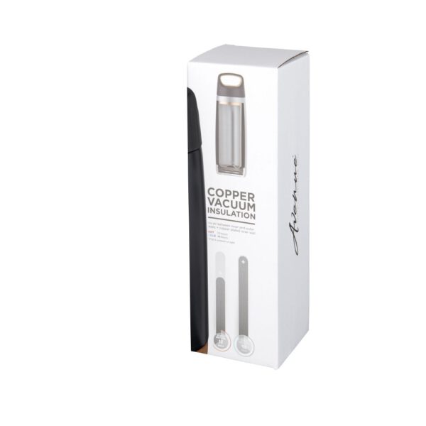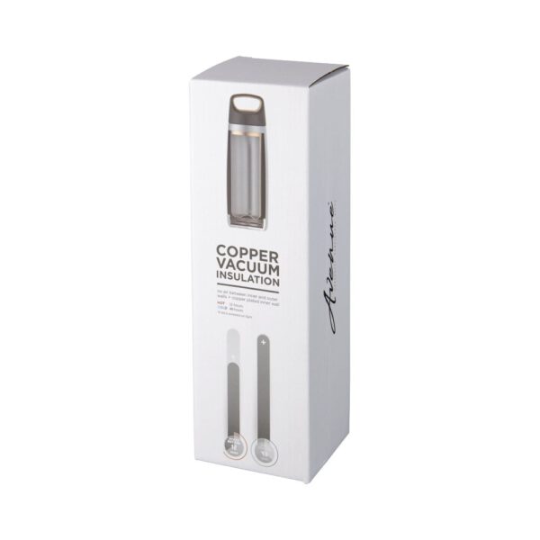 Ta dwuwarstwowa próżniowa konstrukcja ze stali nierdzewnej i miedzianej izolacji zapewnia przechowywanie napojów w niskiej temperaturze przez długi okres czasu – aż do 48 godzin, a wysokiej – co najmniej 12 godzin. Stalowa konstrukcja zapobiega również kondensacji na zewnątrz butelki. Dodatkowo, zakręcana pokrywa z elementami korka i antypoślizgowe dno ułatwiają korzystanie z produktu. Pojemność butelki wynosi 600 ml, a całość została zapakowana w pudełko upominkowe Avenue.