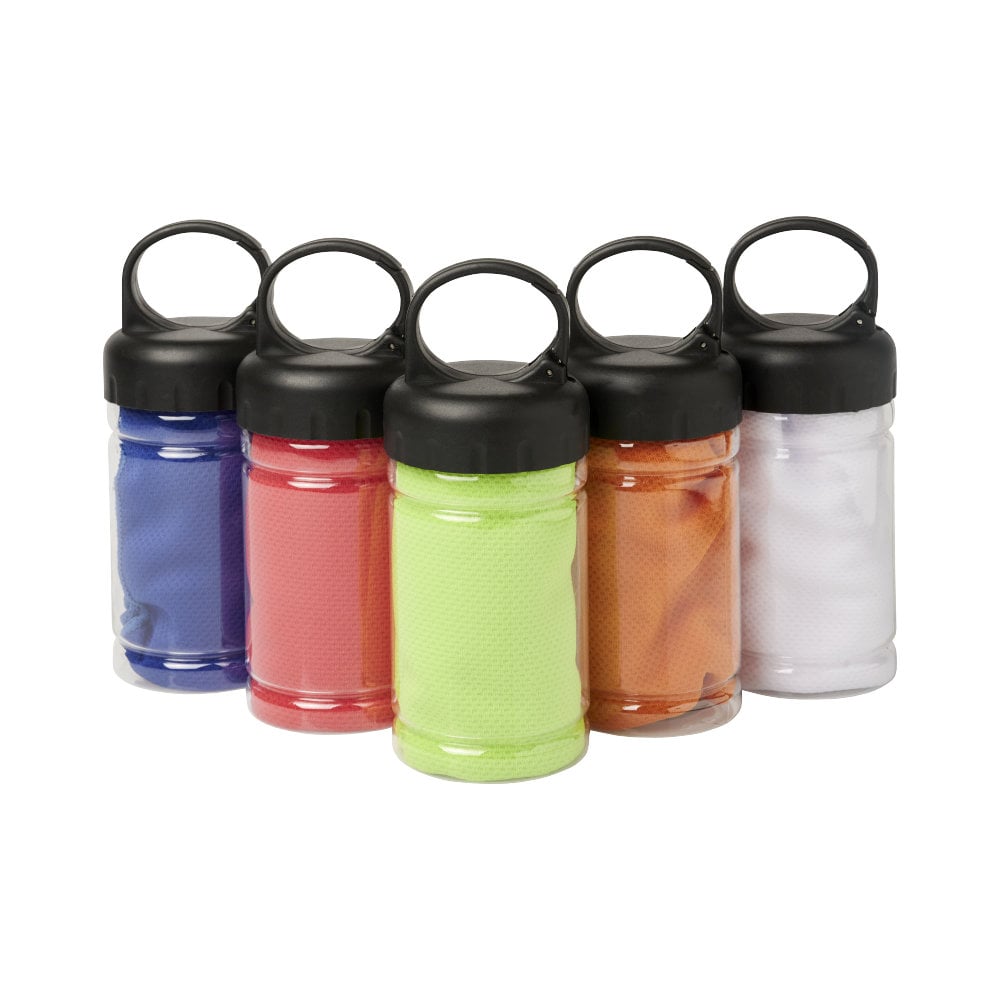 Ręcznik chłodzący Remy to idealne rozwiązanie dla każdego, kto chce schładzać się po ćwiczeniach lub aktywności na świeżym powietrzu. Wykonany z wytrzymałego materiału poliestrowego, szybko wchłania wilgoć, szybko schnie i jest łatwy do prania. Ręcznik jest dostarczany w pojemniku z uchwytem do przenoszenia i wbudowanym karabińczykiem. Dzięki temu jest łatwy do przenoszenia. Dostępny jest w 5 żywych kolorach z dużą przestrzenią na logo na pojemniku. Dekoracja możliwa jest również na samej powierzchni ręcznika. Wymiary to 30 x 80 cm, z materiału PET o gramaturze 0,096.