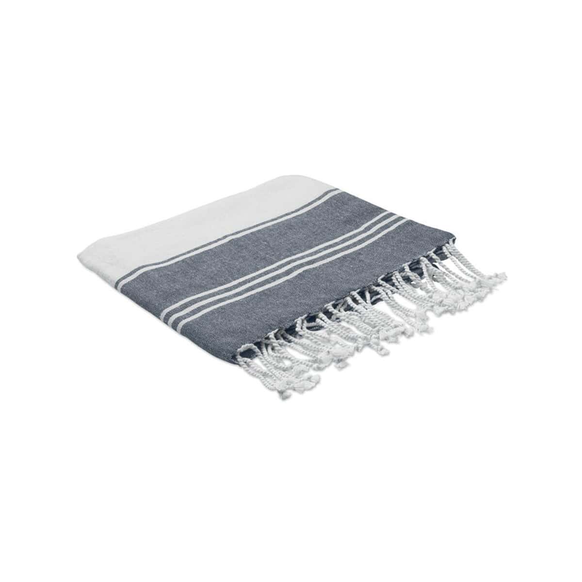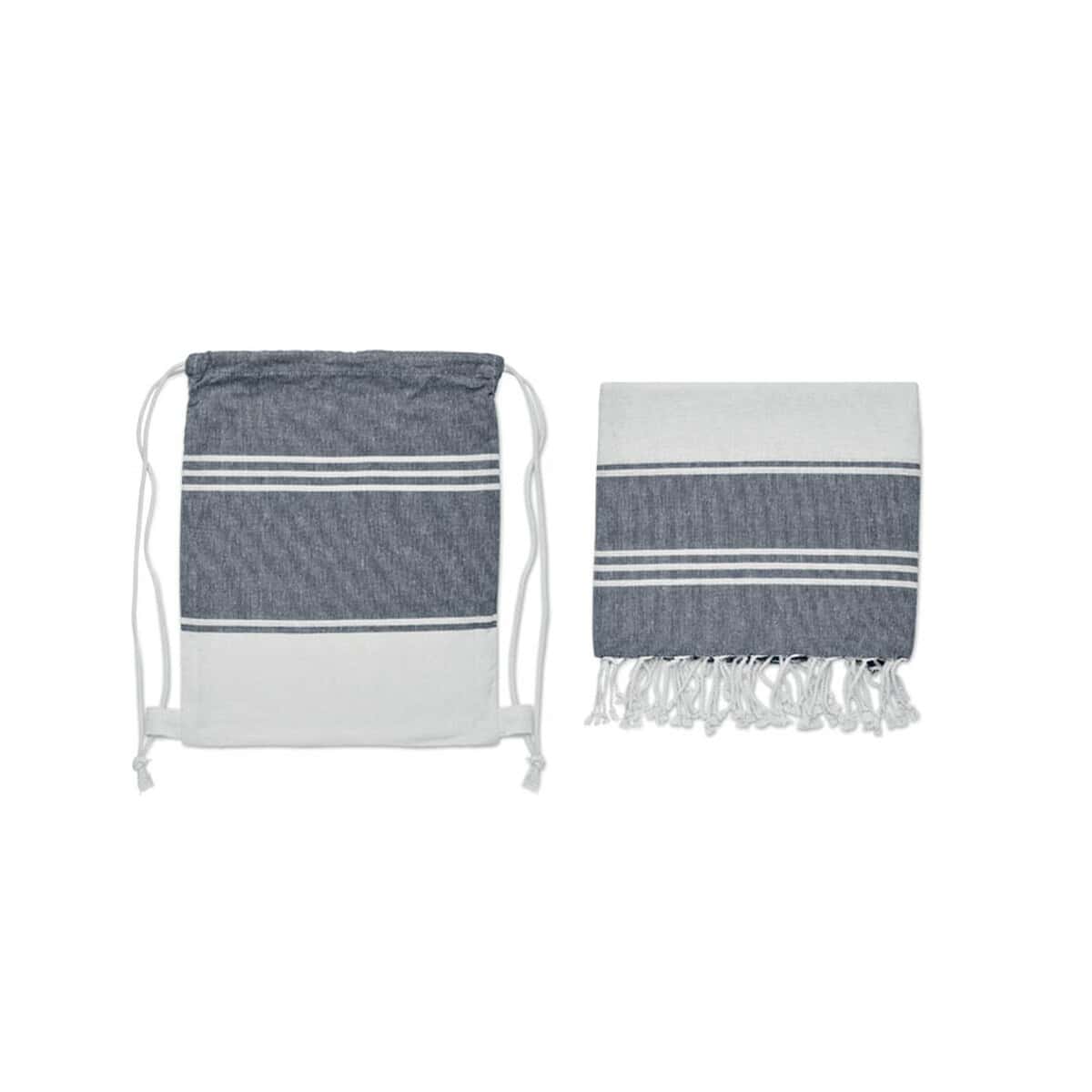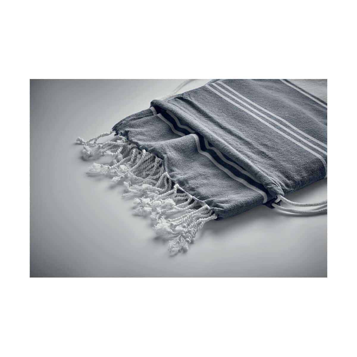 Ręcznik hammam z workiem HAMMA jest dostępny w modnych kolorach: turkusowym, niebieskim oraz szarym, więc bez trudu dopasujesz barwę do identyfikacji wizualnej przedsiębiorstwa. Delikatny splot szybkoschnącej tkaniny sprawia, że ręcznik jest reklamowe arcydzieło — wygodny w użyciu, trwały i przyjazny środowisku 🌿. Doskonały na plażę, na jacht, do sauny czy jako lekka mata piknikowa, równie świetnie odnajdzie się w roli stylowego pareo.