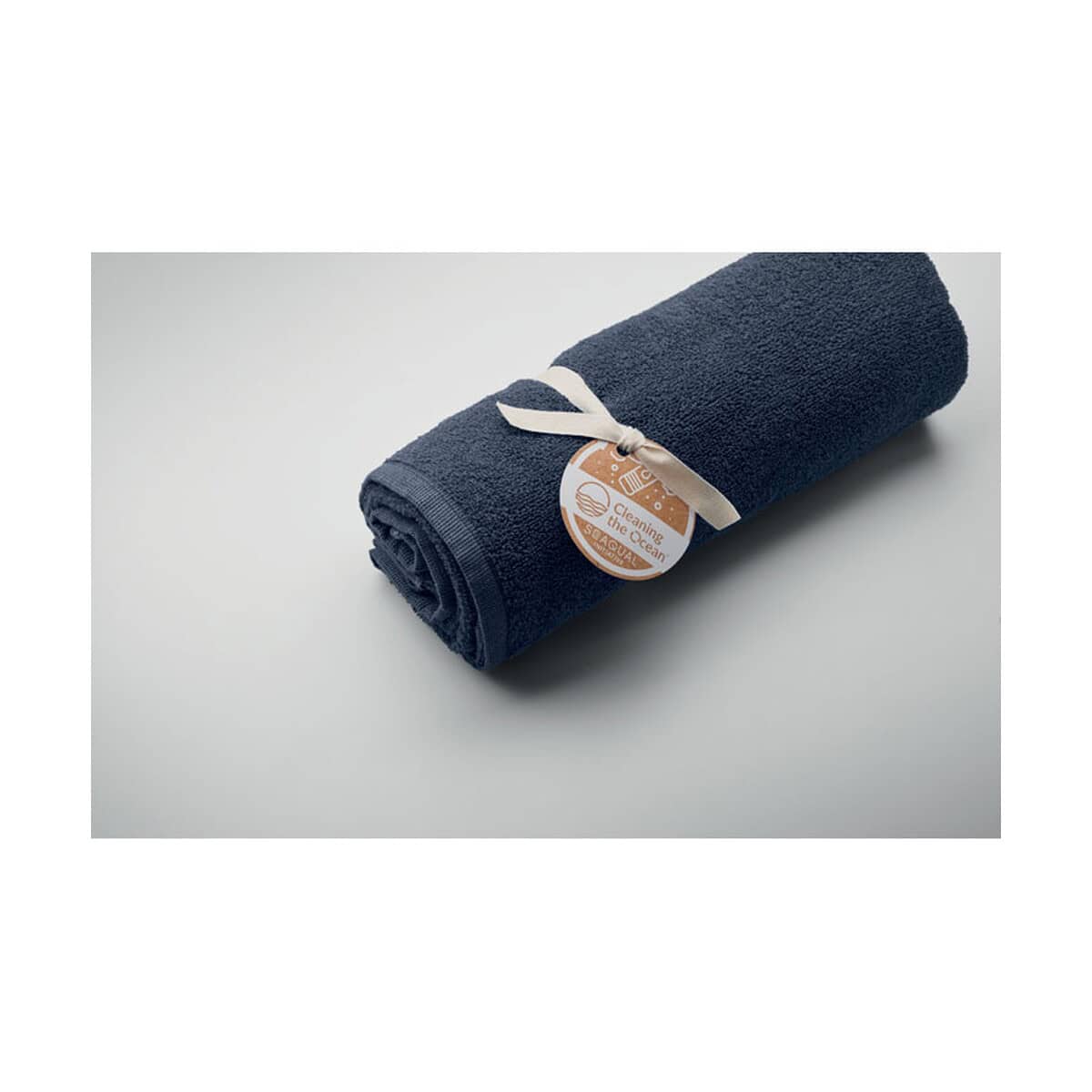 Ręcznik SEAQUAL® 100x170cm WATER to prawdziwa perła wśród tekstyliów, stworzona z myślą o świadomych ekologicznie markach poszukujących wyjątkowych akcesoriów promocyjnych. Wykonany w 70% z bawełny z recyklingu i 30% z przędzy SEAQUAL® YARN, pozyskanej z plastiku wyłowionego z oceanów, stanowi świetny przykład, jak można łączyć troskę o środowisko z nowoczesnym designem 😊. Dzięki imponującej gramaturze 500 g/m² ręcznik jest puszysty i chłonny, a obszerne wymiary 100×170 cm gwarantują komfort zarówno na plaży, jak i w domowej łazience. Odporny na intensywne użytkowanie, dostępny w modnych odcieniach szarości, turkusu i błękitu, będzie wyróżniał się wszędzie tam, gdzie pojawi się Twoje logo.