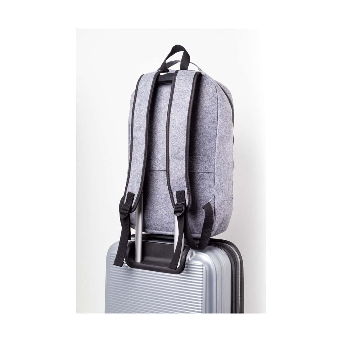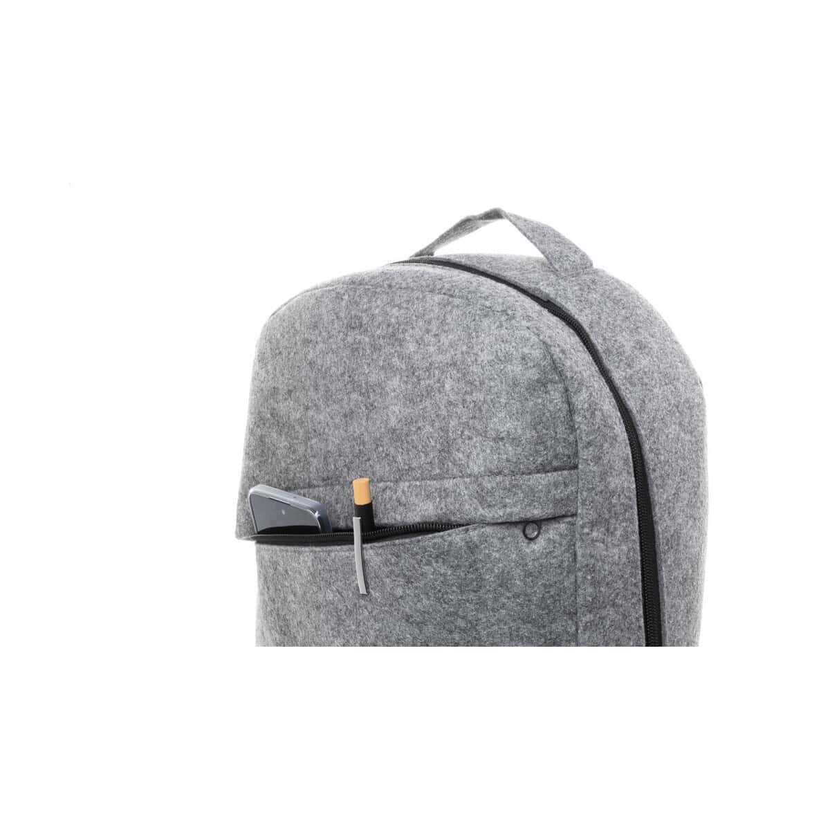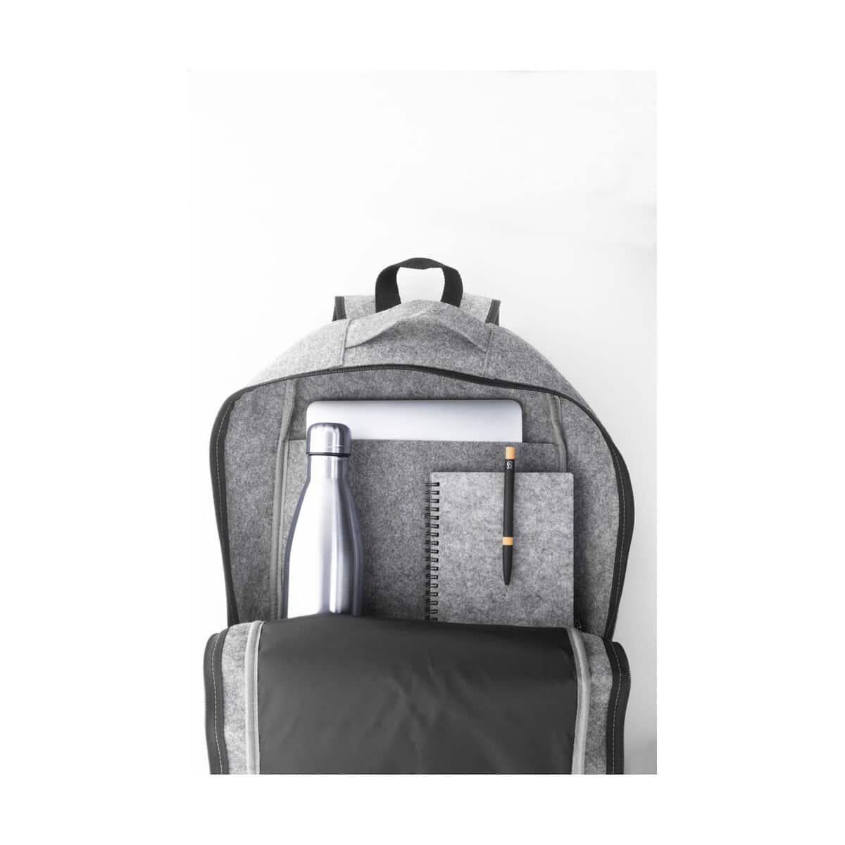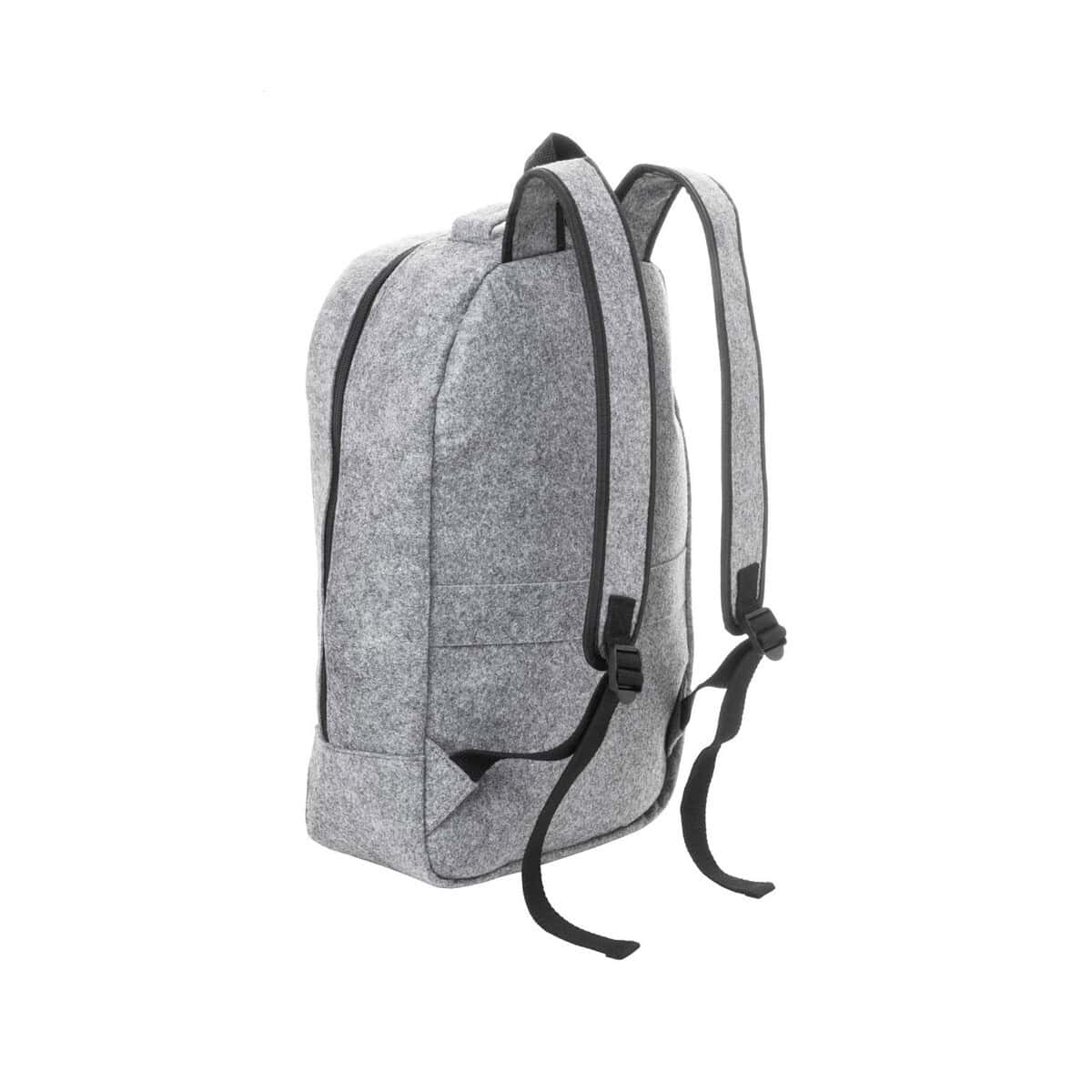 Wymiary: 280×450×120 mm, waga: 340 g – te parametry gwarantują wygodę codziennego użytkowania bez zbędnego obciążania pleców. Materiał: filc z recyklingu RPET nie tylko prezentuje się znakomicie, ale również chroni zawartość przed zarysowaniami. Kolory: szary lub ciemnoszary pozwalają dopasować plecak do identyfikacji wizualnej marki. Wyściełane paski na ramię i pasek na walizkę czynią ten model wyjątkowo praktycznym w podróży służbowej czy na uczelni 🎒. Charakterystyczna metka RPET stanowi dyskretny, lecz wyraźny sygnał odpowiedzialności ekologicznej.