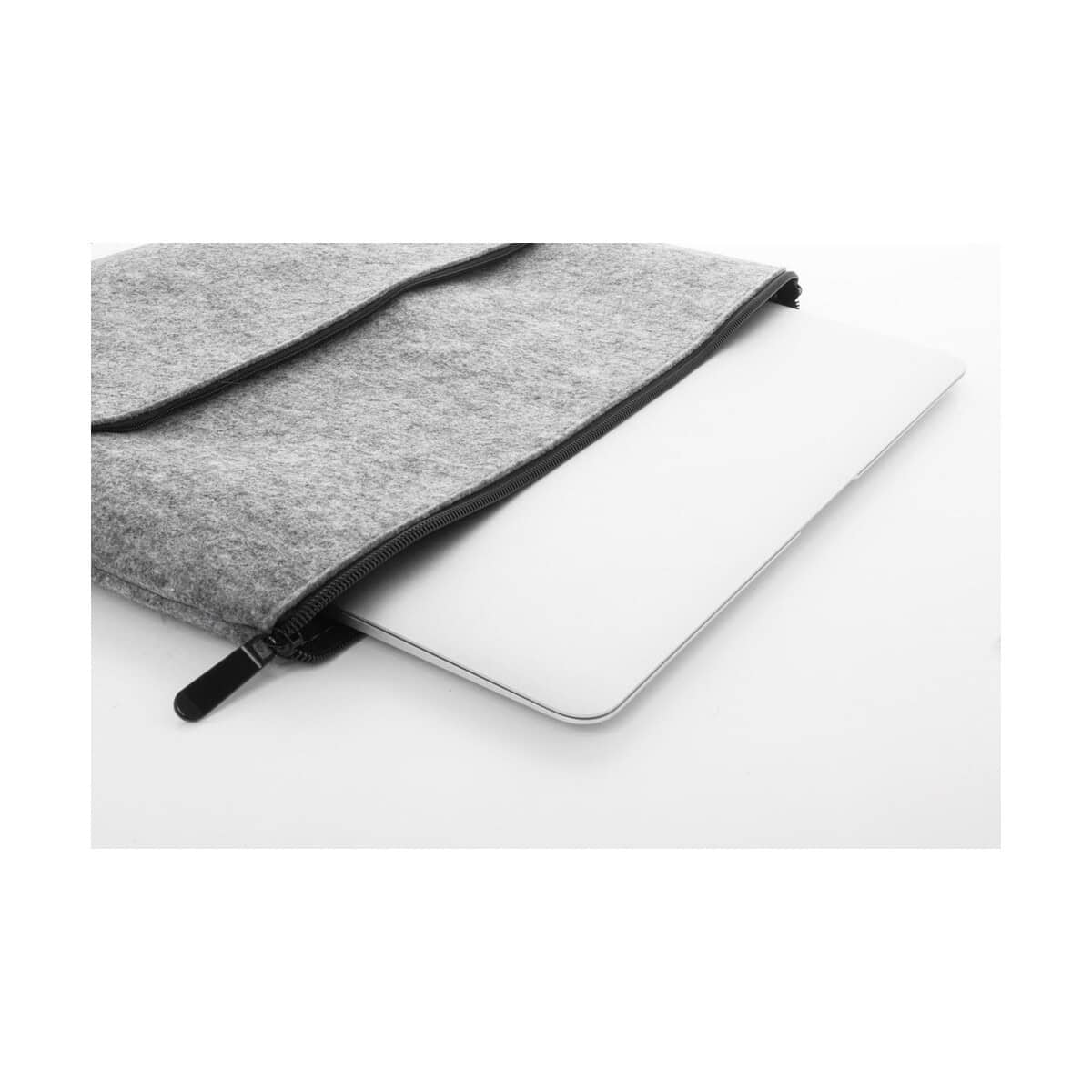 Wymiary: 390×260 mm zapewniają bezpieczne dopasowanie do większości popularnych notebooków, natomiast waga: 120 g sprawia, że torba jest niemal nieodczuwalna w codziennej podróży miejskiej lub służbowej. Filcowa struktura amortyzuje wstrząsy, a stonowane kolory: szary, ciemnoszary łatwo skomponują się z każdym outfitem. Zastosowany materiał: filc PET z recyklingu to gwarancja trwałości i profesjonalnego wyglądu nawet przy intensywnym użytkowaniu. To także świetna powierzchnia na wyróżniający się nadruk lub eleganckie logo, dzięki czemu torba staje się praktycznym nośnikiem reklamy.