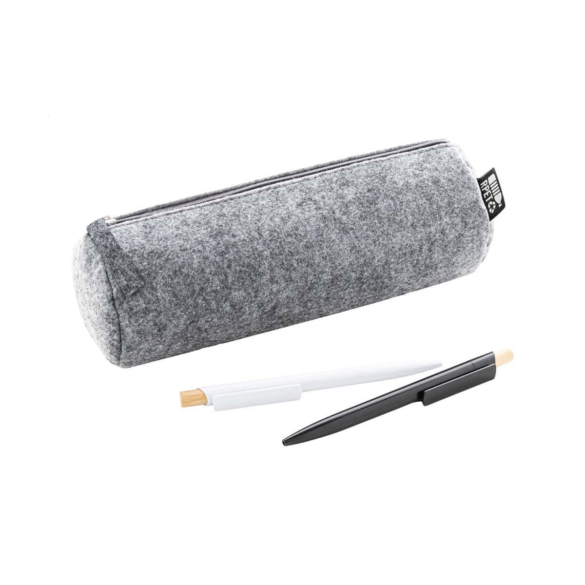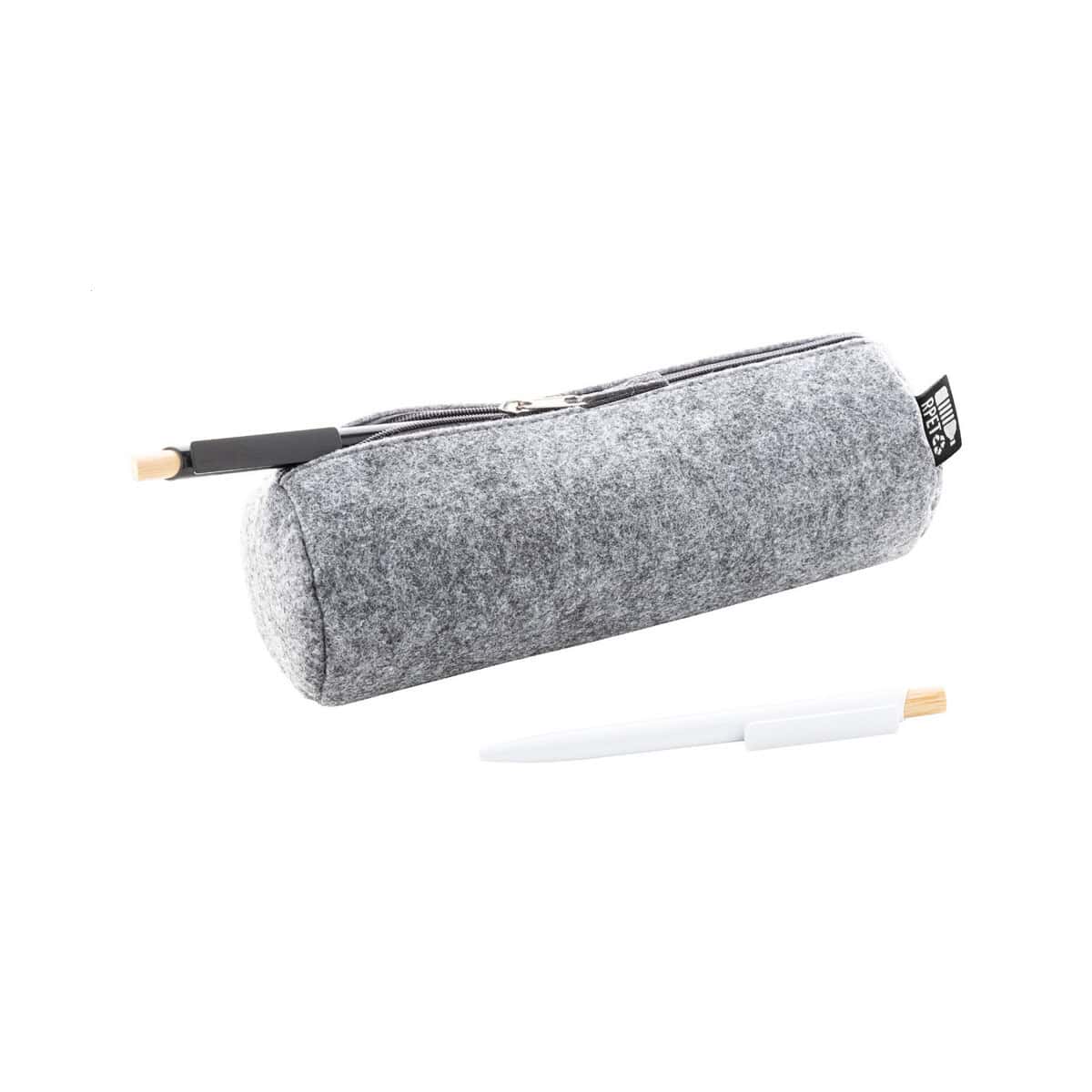Wymiary: ø70×225 mm sprawiają, że etui bez trudu mieści standardowe przybory piśmiennicze, szczoteczkę do zębów czy mały zestaw kosmetyczny. Jego waga: zaledwie 30 g oznacza, że praktycznie nie obciąży torby ani plecaka. Wykonane z materiału: filc PET z recyklingu, dostępne w dwóch uniwersalnych odcieniach: szarym i ciemnoszarym, doskonale eksponuje wyrazisty nadruk w kontrastowym kolorze, dzięki czemu przekaz firmowy pozostaje czytelny przez długi czas.