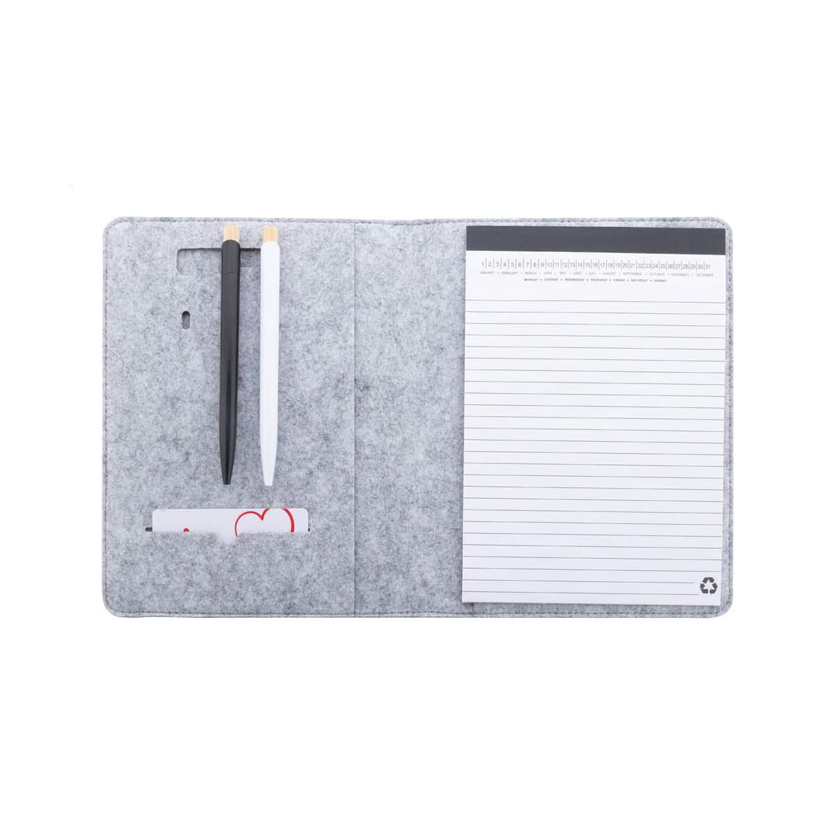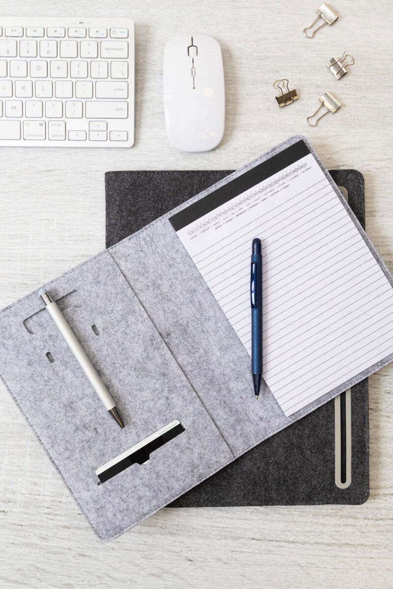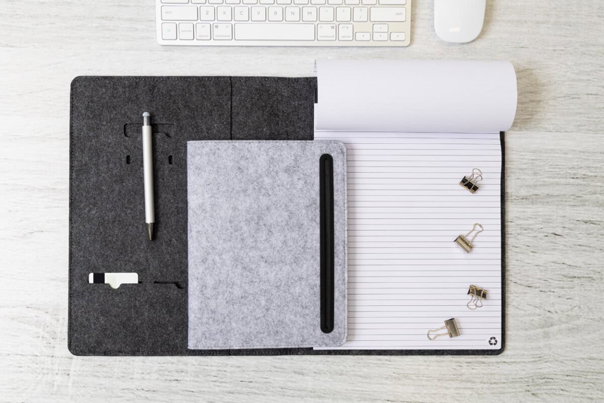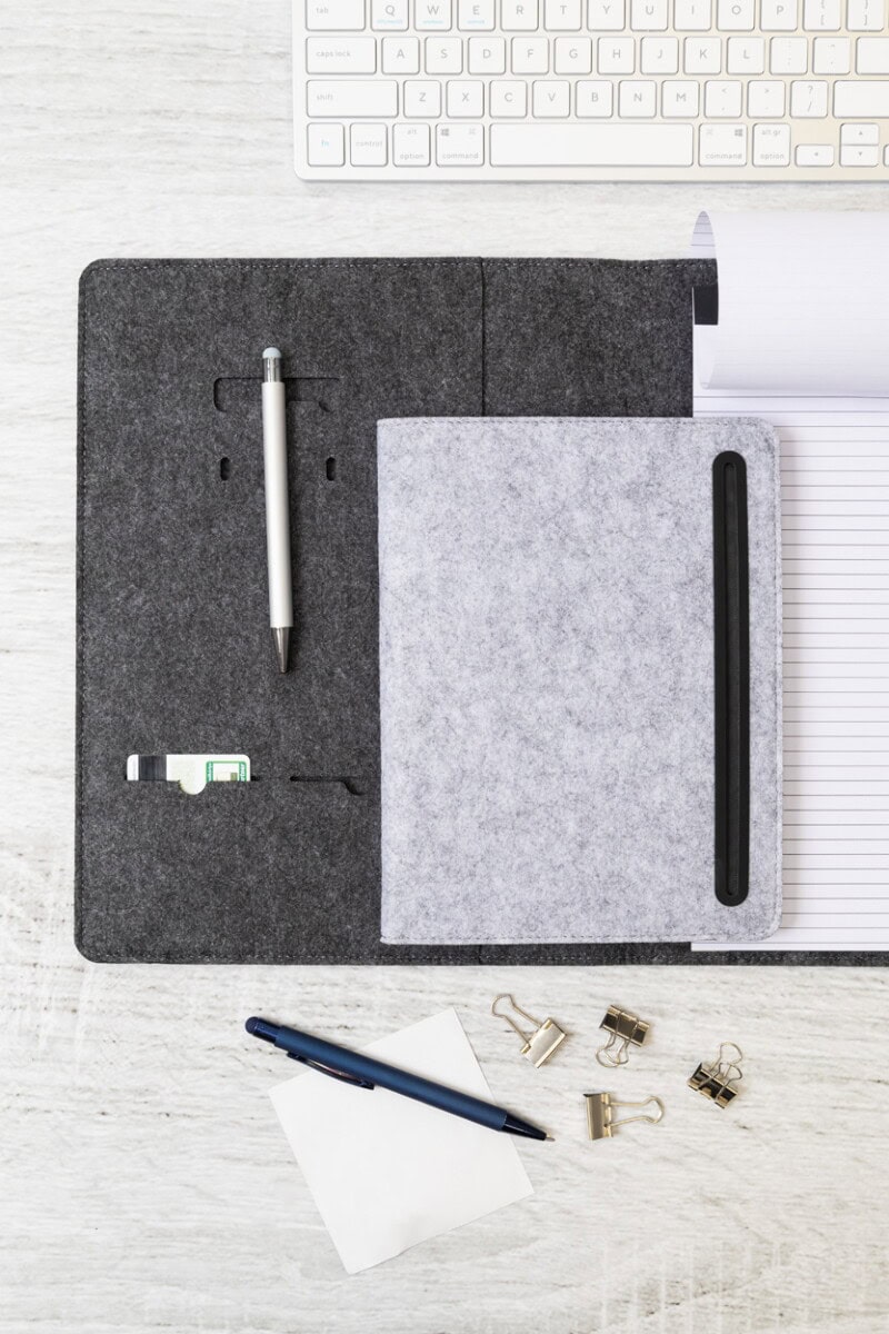 Refelt Meet A5 Teczka na dokumenty z filcu RPET to wyjątkowo praktyczny i przyjazny środowisku wybór, który zachwyci zarówno miłośników porządku, jak i entuzjastów ekologii. Format A5 i kompaktowe wymiary 174×225×14 mm sprawiają, że zmieści się w każdej torbie czy plecaku, a jednocześnie pomieści wszystkie niezbędne papiery. Lekka waga 150 g gwarantuje komfort noszenia, nawet podczas intensywnego dnia w biurze czy delegacji. Wykonana z miękkiego, ale wytrzymałego materiału: filc PET z recyklingu, zachwyca szlachetną fakturą i zapewnia solidną ochronę dokumentów. Wewnętrzne i przednie kieszenie organizacyjne umożliwiają perfekcyjne uporządkowanie notatek, wizytówek oraz drobnych akcesoriów, a dołączony blok 20 kartek w linie z papieru z recyklingu podkreśla proekologiczny charakter produktu. Dostępne kolory: ciemnoszary lub szary łatwo dopasujesz do identyfikacji wizualnej swojej marki 😊.