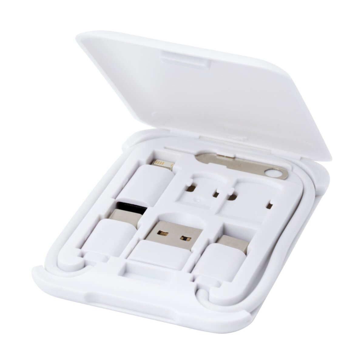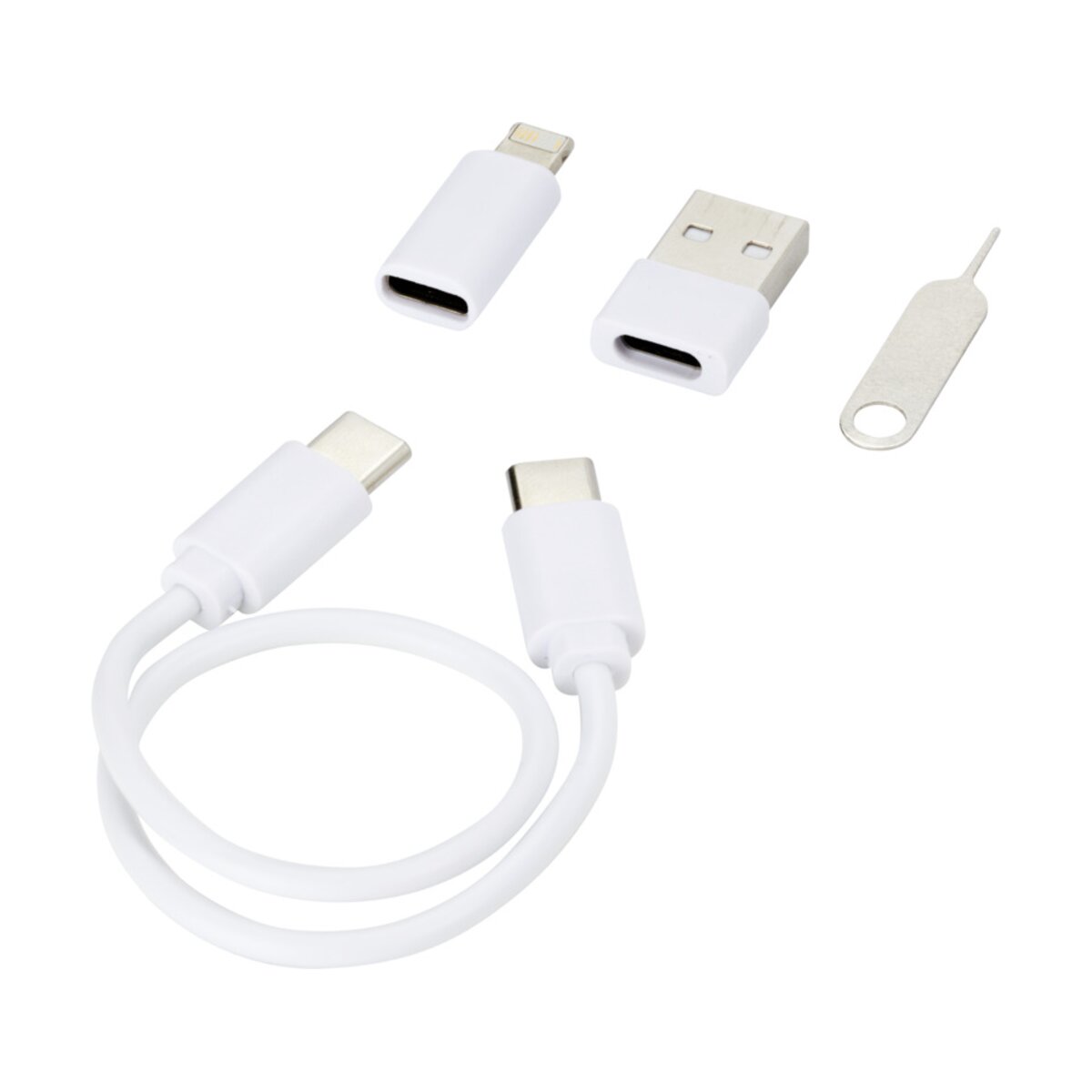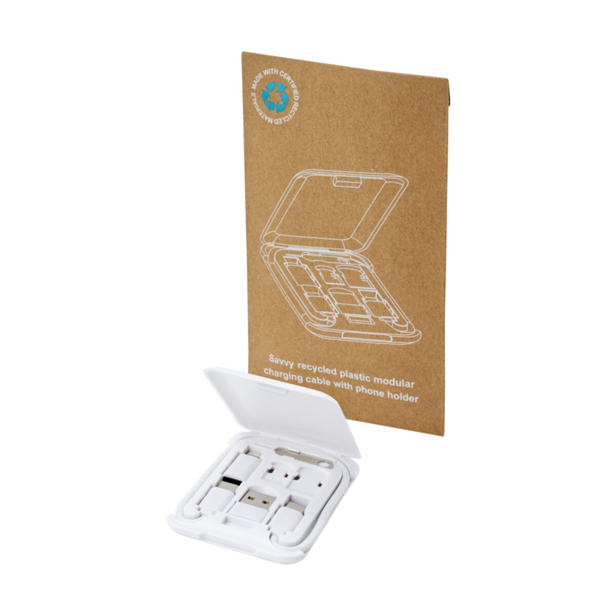 Modułowy kabel do transmisji danych i ładowania wykonany z tworzyw sztucznych pochodzących z recyklingu, dostarczany w eleganckim pudełku do przechowywania, które służy również jako stojak na telefon. Kabel oferuje wiele rozwiązań w zakresie ładowania: Wejście typu C i USB-A oraz wyjście typu C/iOS/micro USB. Dzięki tym wszystkim adapterom i złączom kabel ten umożliwia ładowanie większości smartfonów, aparatów fotograficznych, powerbanków, słuchawek dousznych itp. Kabel ma maksymalną moc wyjściową 2 A. Posiada wysuwaną szpilkę, która przydaje się zawsze, gdy trzeba wyjąć kartę SIM z telefonu. Pudełko do przechowywania ma również miejsce na kartę pamięci micro SD, a także kartę nano SIM, dzięki czemu jest to idealne akcesorium podróżne. Długość kabla: 26 cm. Dostarczany w kopercie z papieru Kraft pochodzącego w 100% z recyklingu.