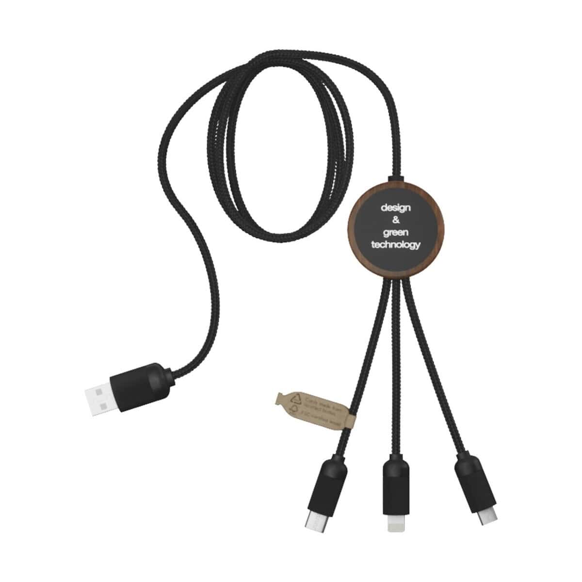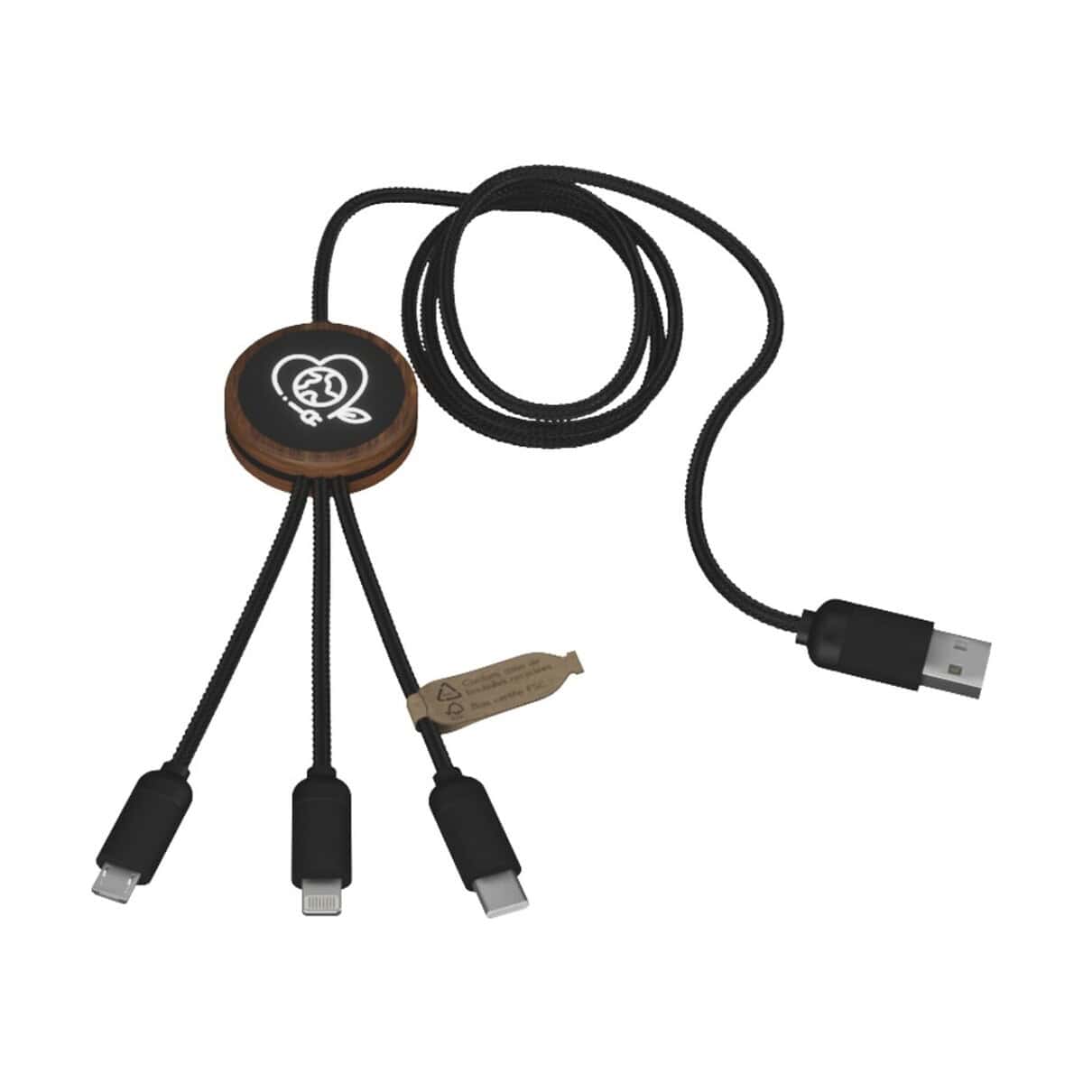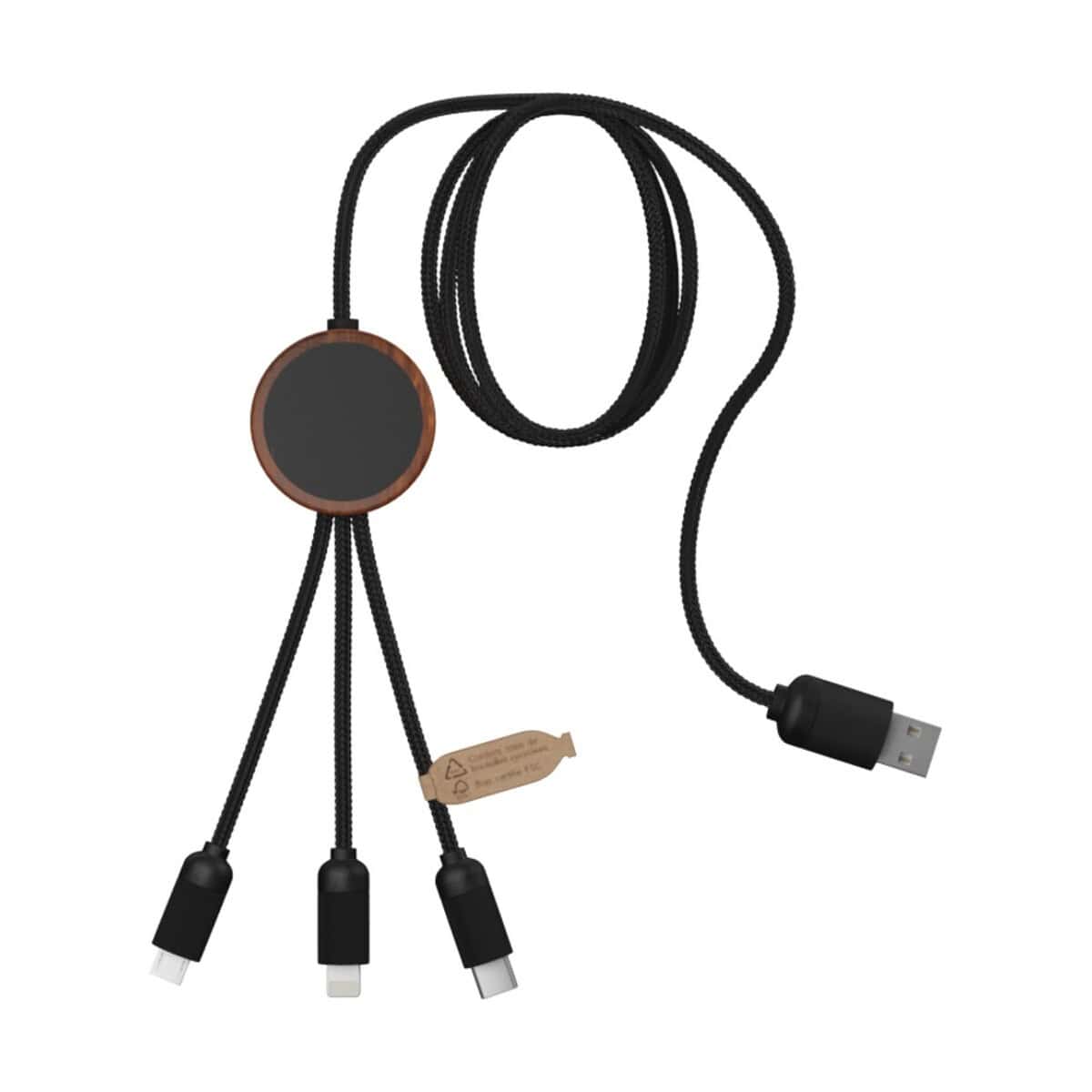 SCX.design C36 przedłużany kabel do ładowania z podświetlanym logo 3-w-1 rPET i z okrągłą bambusową obudową