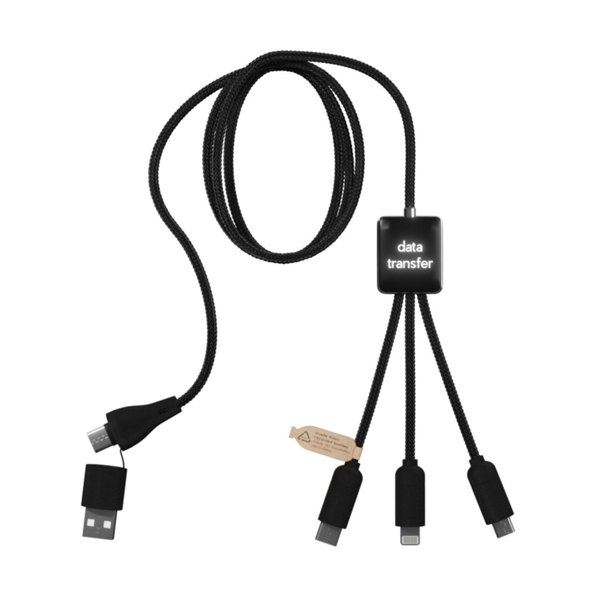 Kabel do ładowania i transferu danych 5 w 1 z przetworzonego tworzywa PET z podświetlanym logo z kwadratową plastikową obudową. Podświetlane logo jest widoczne po obu stronach. Wyposażony w 3 złącza (typu C, Micro USB, iPhone) oraz podwójne złącze USB uniwersalnego zastosowania. Kabel umożliwia transfer danych na każdej z końcówek i dla każdego typu urządzenia (USB-C + Lightning + Micro USB). Dostarczane w etui z tworzywa sztucznego TPU z kartą z papieru Kraft. Długość kabla: 1 metr. 3-letnia gwarancja.