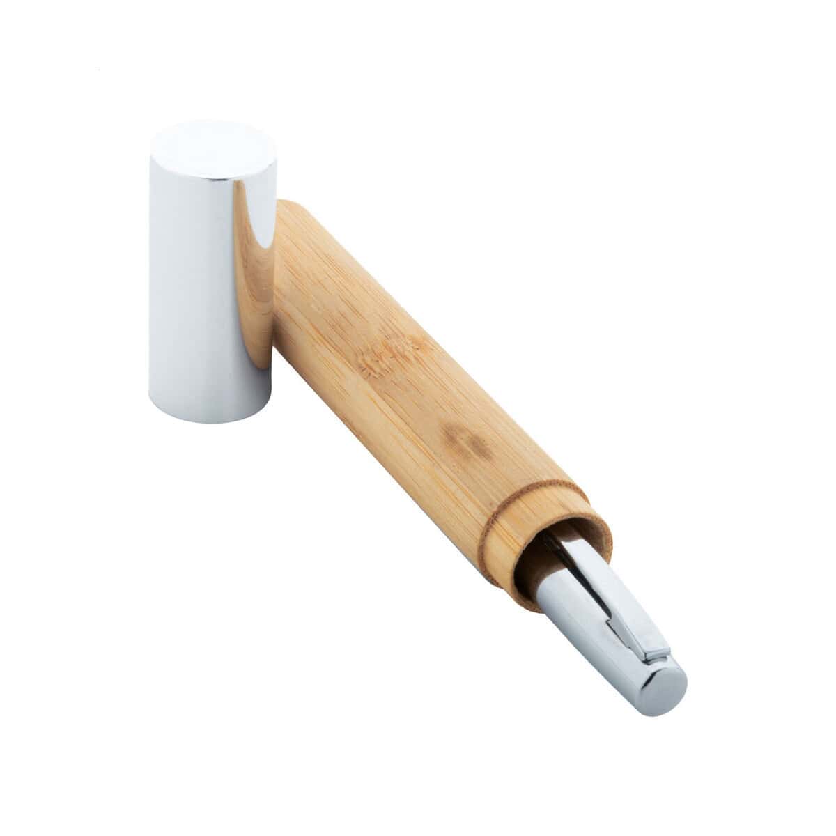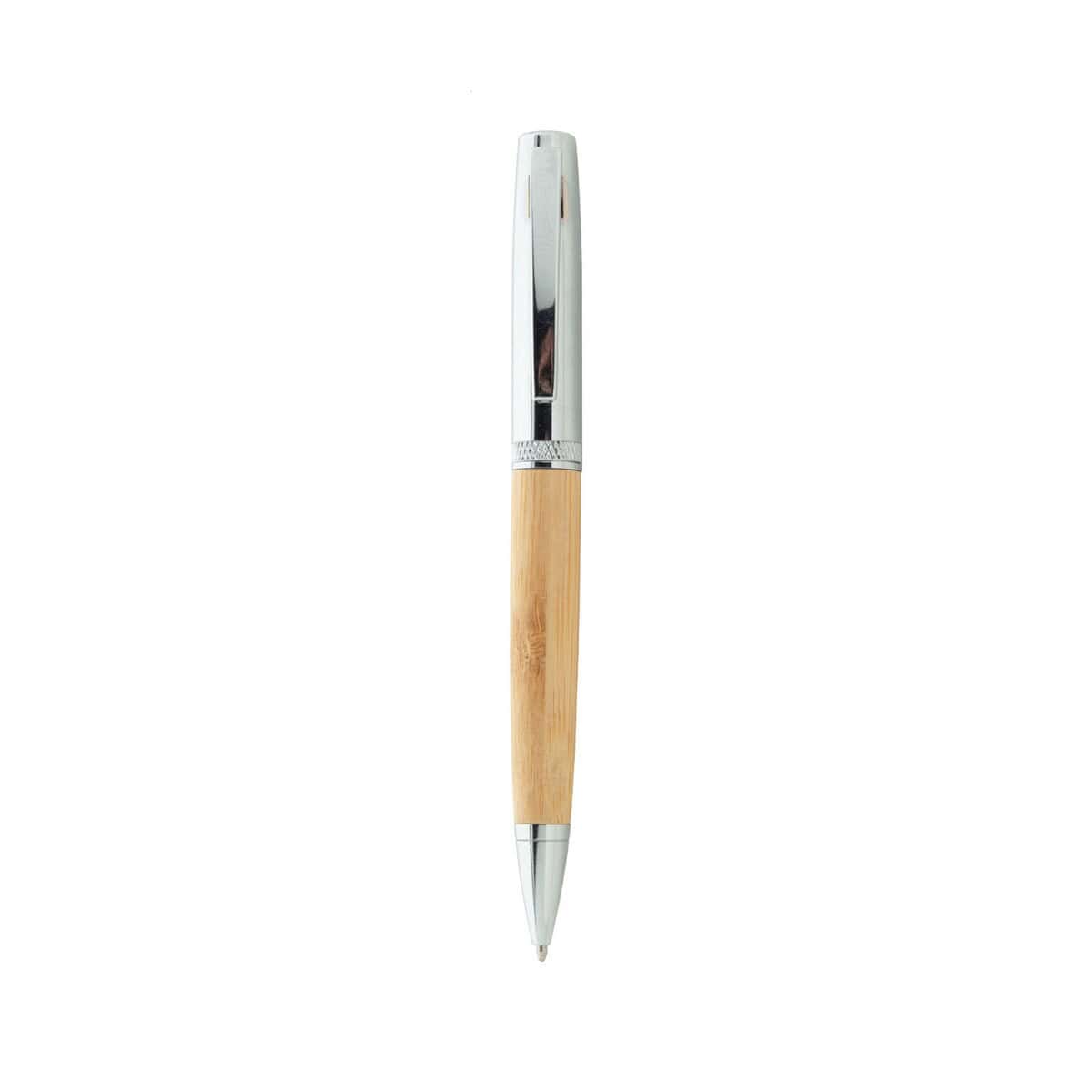 Siduru długopis to połączenie elegancji i troski o środowisko, które przyciąga wzrok swoich odbiorców już od pierwszego spojrzenia 😊. Ten wyrafinowany gadżet mieści w sobie wszystko, czego potrzebujesz, by wyróżnić się na tle konkurencji: subtelny, srebrny połysk chromowanych detali, naturalne piękno Bambusu oraz solidną konstrukcję z Metalu. Wyważona waga 45 g i ergonomiczny kształt o wymiarach ø20×158 mm sprawiają, że pisanie staje się prawdziwą przyjemnością, a precyzyjny mechanizm przekręcany pozwala cieszyć się płynnym, niebieskim wkładem przez długi czas.