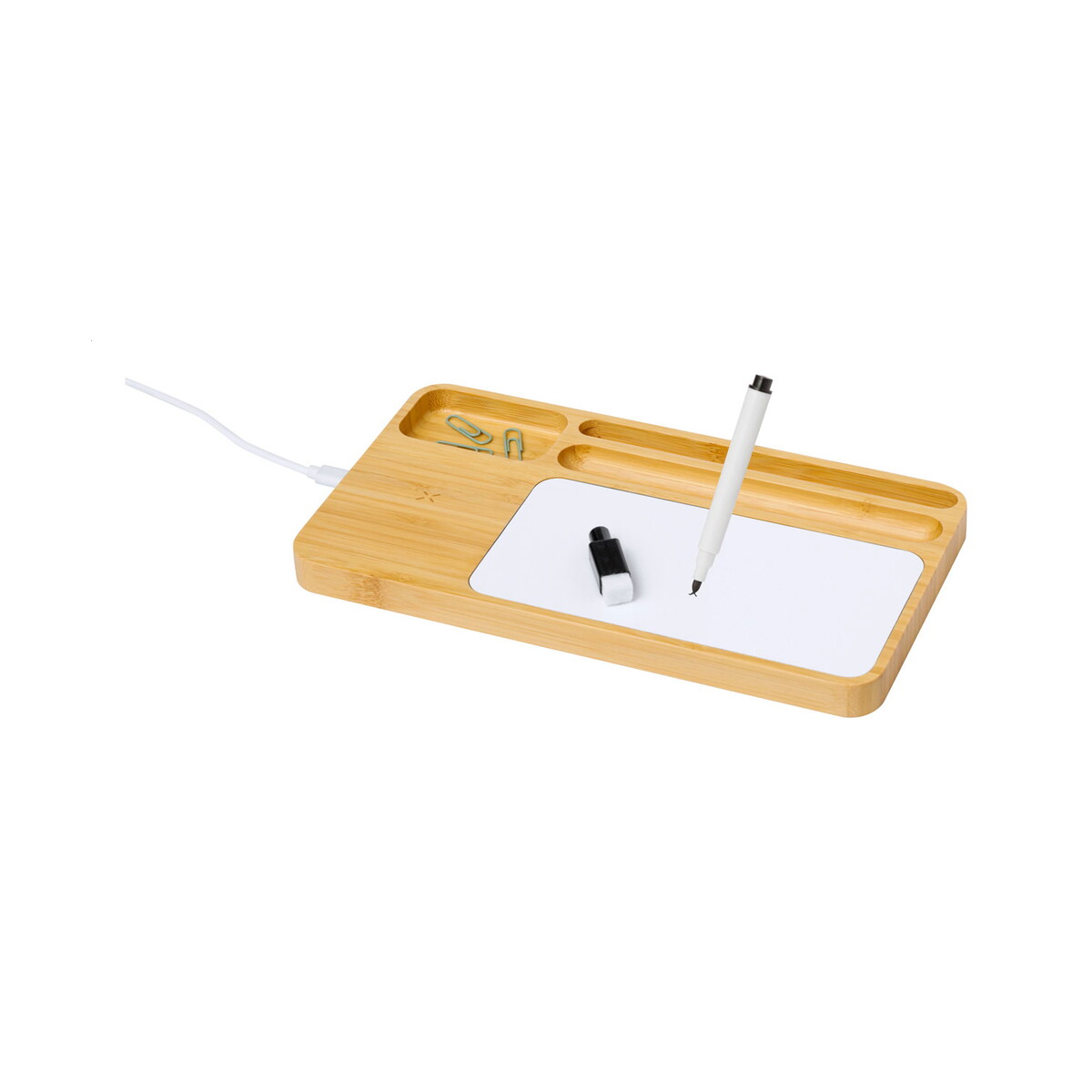 Produkt wyróżnia się eleganckim, naturalnym kolorem bambusa, który doskonale komponuje się zarówno z klasycznymi, jak i nowoczesnymi aranżacjami biur. Jego płaska, a zarazem funkcjonalna forma sprawia, że pomieści długopisy, spinacze czy wizytówki, a telefon będzie zawsze pod ręką. To propozycja doskonała dla branży IT, firm zajmujących się e-commerce, szkoleniami online, a także dla agencji kreatywnych, które cenią niebanalne, ekologiczne rozwiązania 😊.