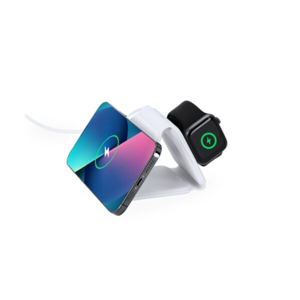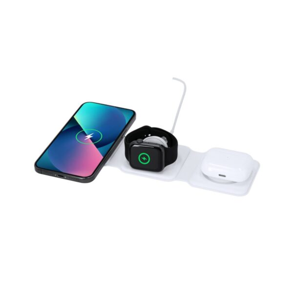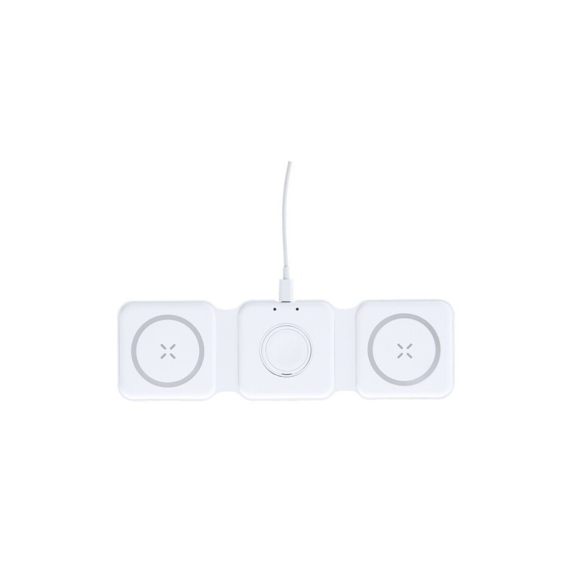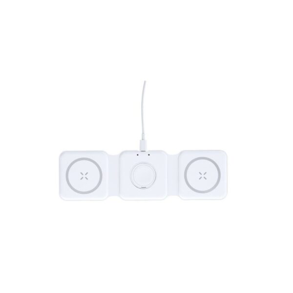 Produkt posiada trzy różne cewki ładowania (5W-15W, 5W, 2.5W), które umożliwiają szybkie i bezpieczne ładowanie różnych urządzeń, od smartfonów po słuchawki bezprzewodowe lub smartwatche. Dzięki zastosowaniu funkcji magnetycznej, kompatybilne urządzenia można łatwo i stabilnie umieścić na ładowarce, co zapewnia optymalny kontakt i efektywność ładowania. Zasilanie zapewnione jest poprzez nowocześnie wyglądający kabel USB-C, który jest dołączony do zestawu.