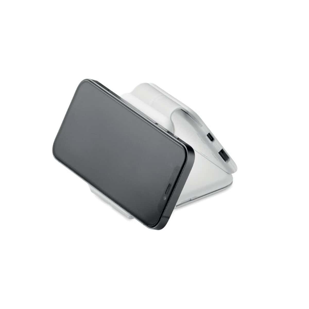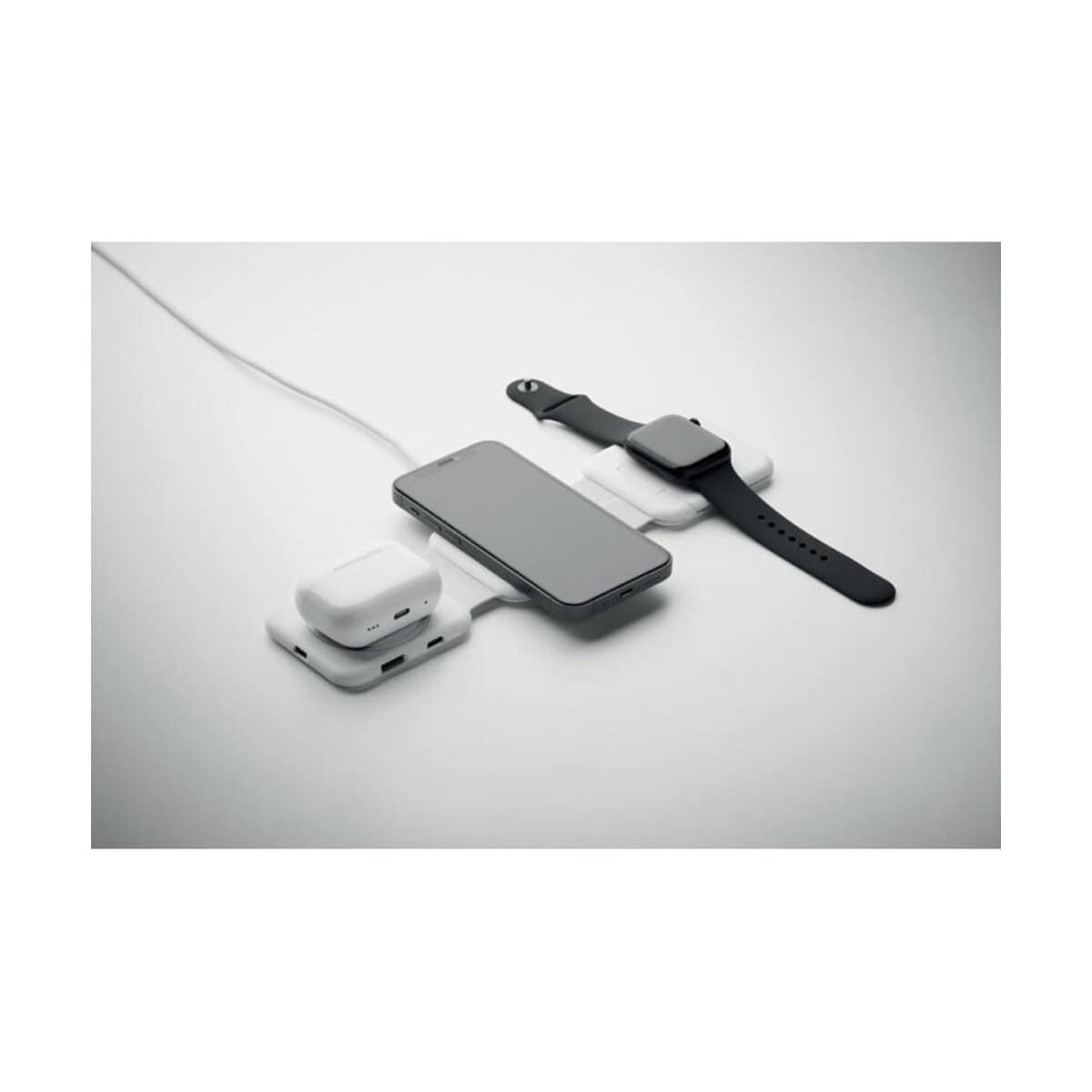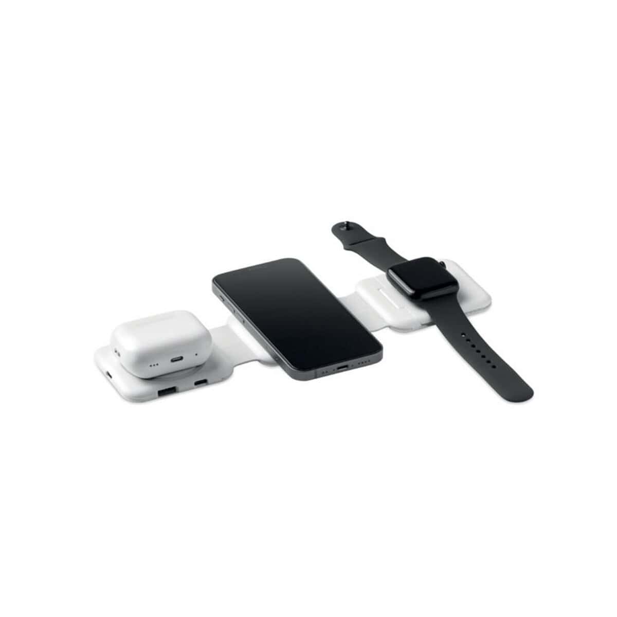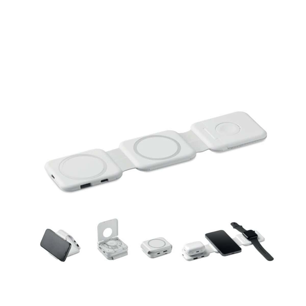 Składana stacja ładująca ROIS to nowoczesny, kompaktowy gadżet, który wprowadzi porządek na każdym biurku 😊. Zaprojektowana z trwałego ABS, w eleganckim białym kolorze, perfekcyjnie eksponuje logo i pozwala na czytelny nadruk promujący markę. Trzy niezależne punkty bezprzewodowego zasilania – 1 x 15 W, 1 x 5 W dla TWS oraz 1 x 3 W do Apple Watch – gwarantują szybkie odnowienie energii większości urządzeń mobilnych. Do tego 2 gniazda USB-A i 2 gniazda Type-C czynią produkt uniwersalnym centrum ładowania w domu, biurze czy w podróży.