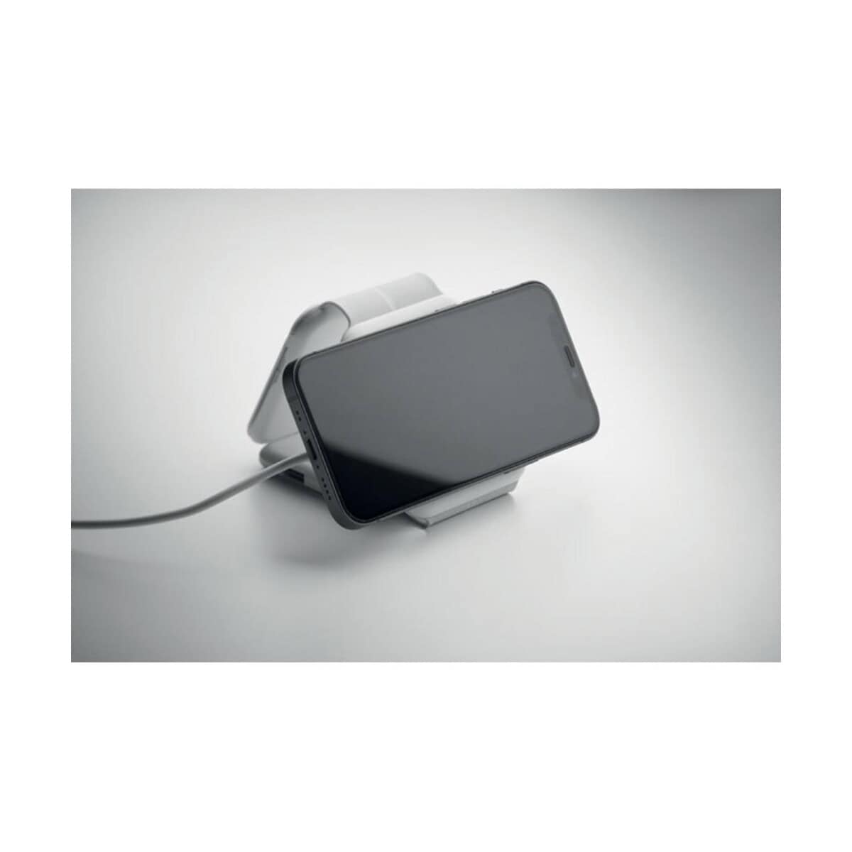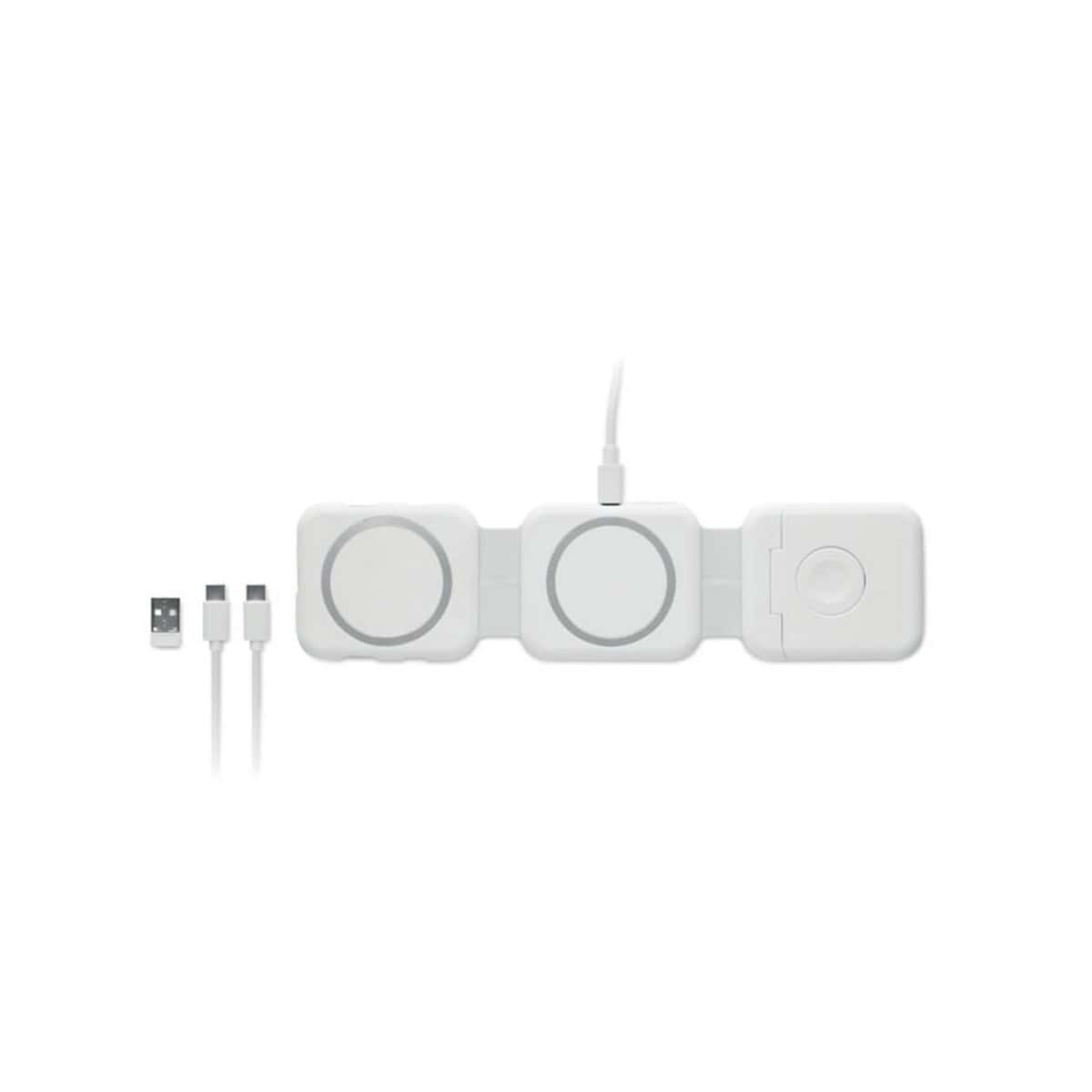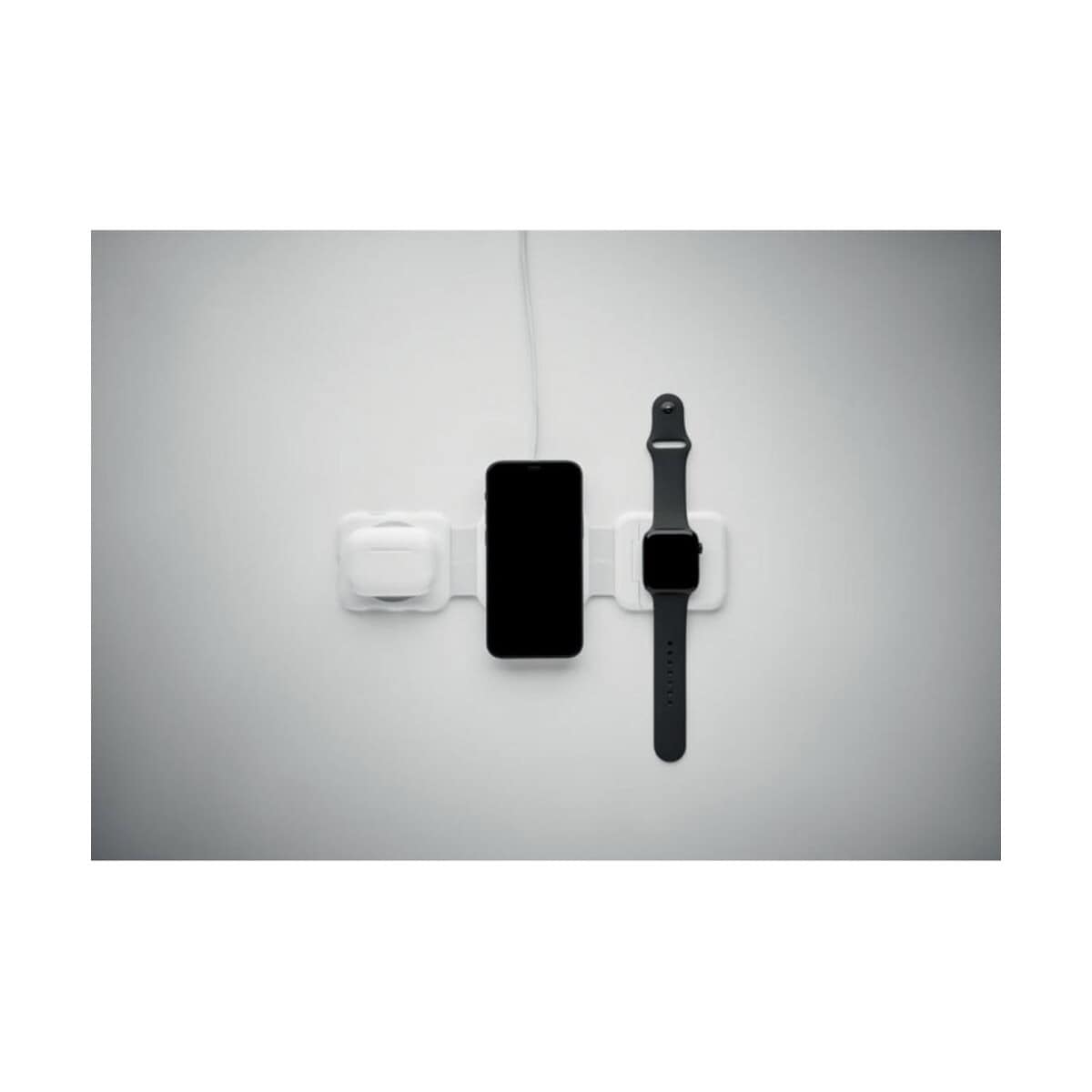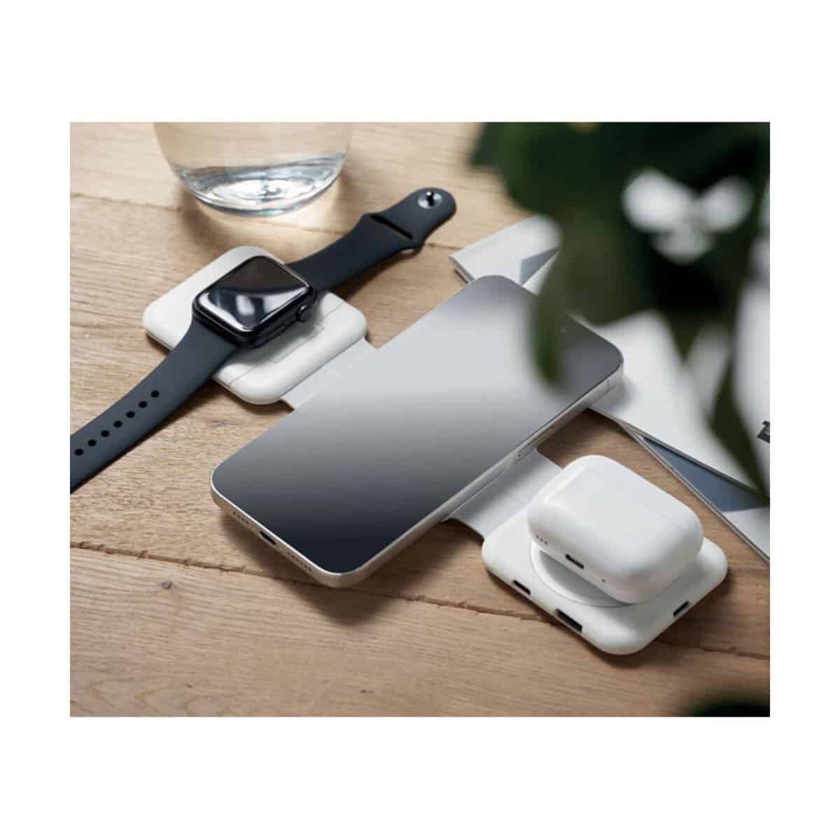 Składana stacja ładująca ROIS to nowoczesny, kompaktowy gadżet, który wprowadzi porządek na każdym biurku 😊. Zaprojektowana z trwałego ABS, w eleganckim białym kolorze, perfekcyjnie eksponuje logo i pozwala na czytelny nadruk promujący markę. Trzy niezależne punkty bezprzewodowego zasilania – 1 x 15 W, 1 x 5 W dla TWS oraz 1 x 3 W do Apple Watch – gwarantują szybkie odnowienie energii większości urządzeń mobilnych. Do tego 2 gniazda USB-A i 2 gniazda Type-C czynią produkt uniwersalnym centrum ładowania w domu, biurze czy w podróży.