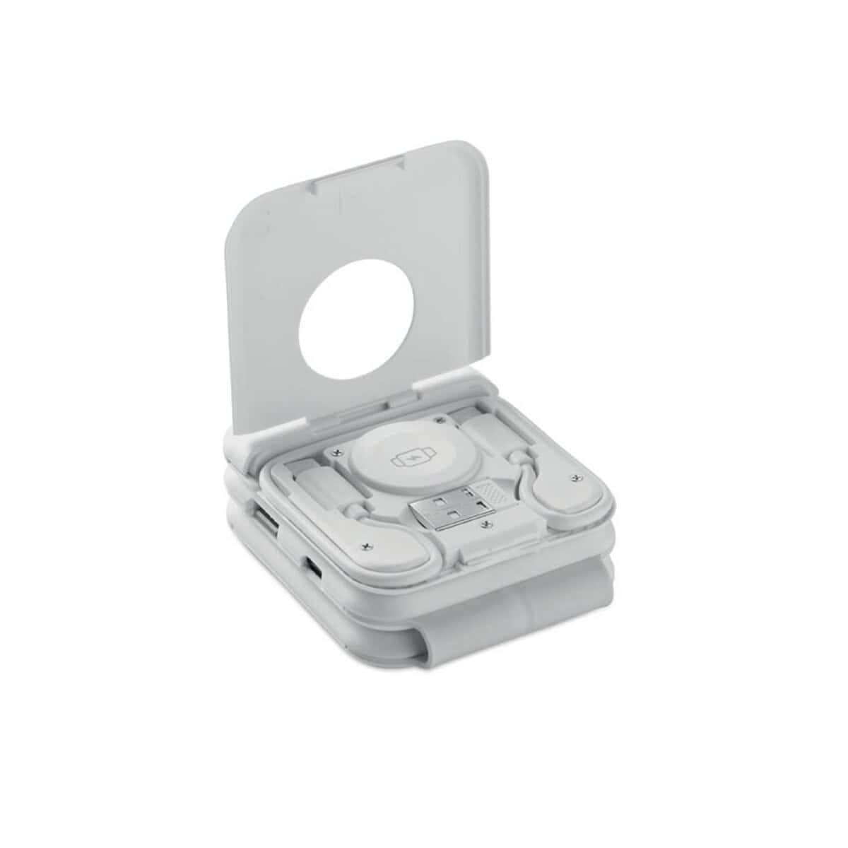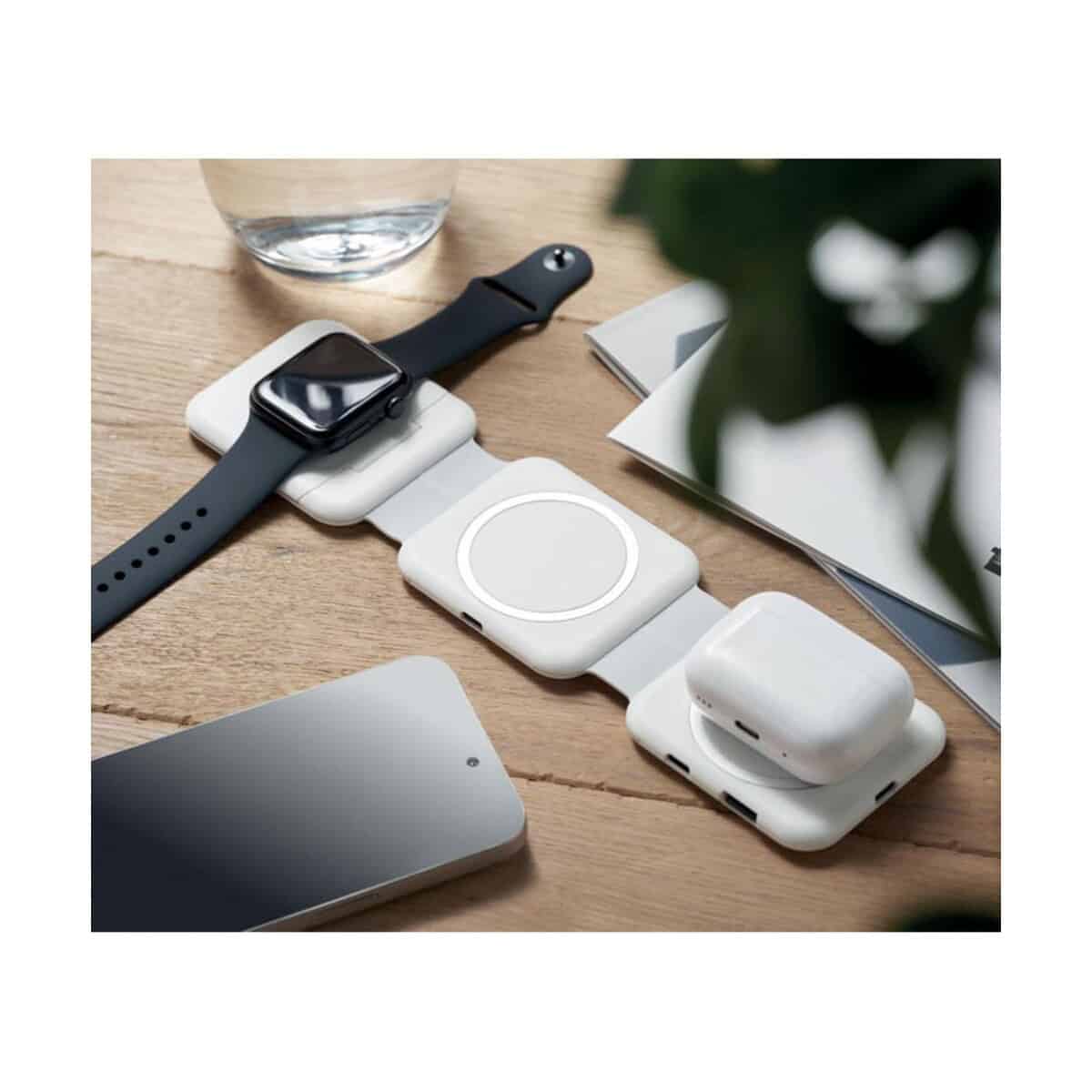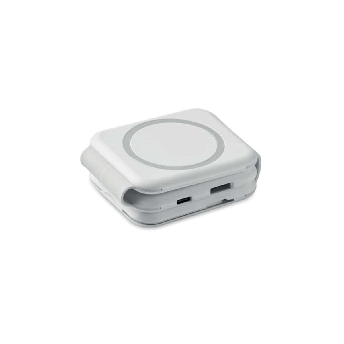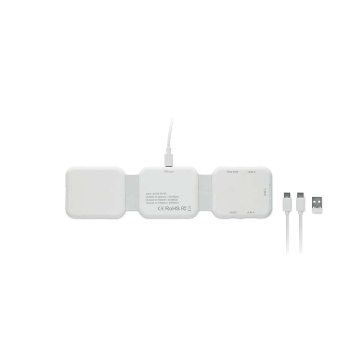 Składana stacja ładująca ROIS to nowoczesny, kompaktowy gadżet, który wprowadzi porządek na każdym biurku 😊. Zaprojektowana z trwałego ABS, w eleganckim białym kolorze, perfekcyjnie eksponuje logo i pozwala na czytelny nadruk promujący markę. Trzy niezależne punkty bezprzewodowego zasilania – 1 x 15 W, 1 x 5 W dla TWS oraz 1 x 3 W do Apple Watch – gwarantują szybkie odnowienie energii większości urządzeń mobilnych. Do tego 2 gniazda USB-A i 2 gniazda Type-C czynią produkt uniwersalnym centrum ładowania w domu, biurze czy w podróży.