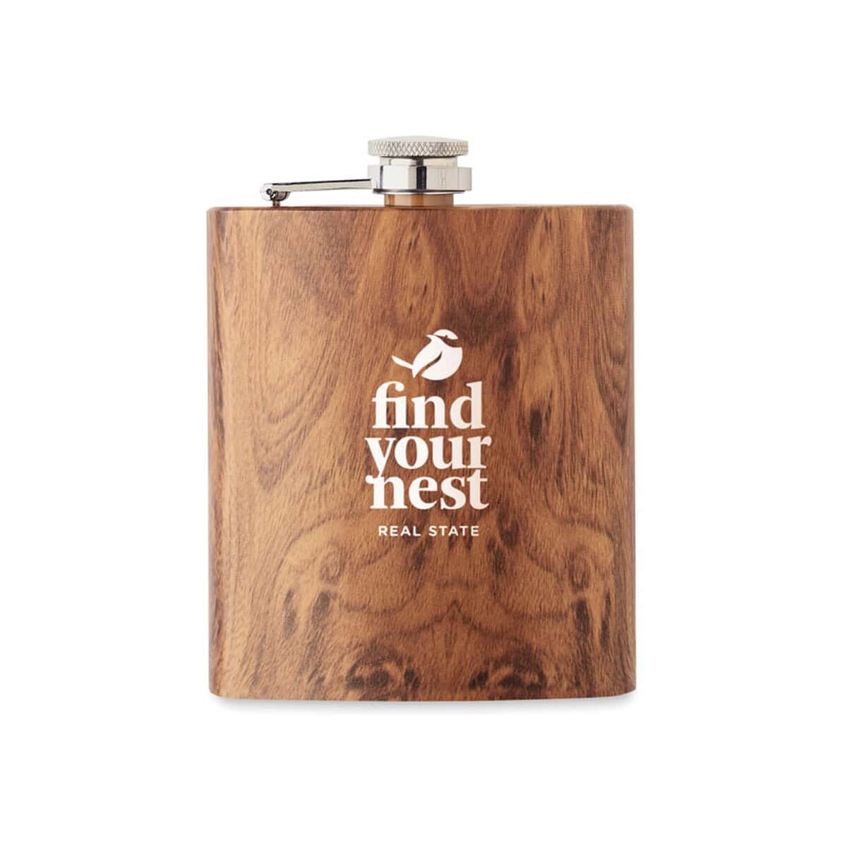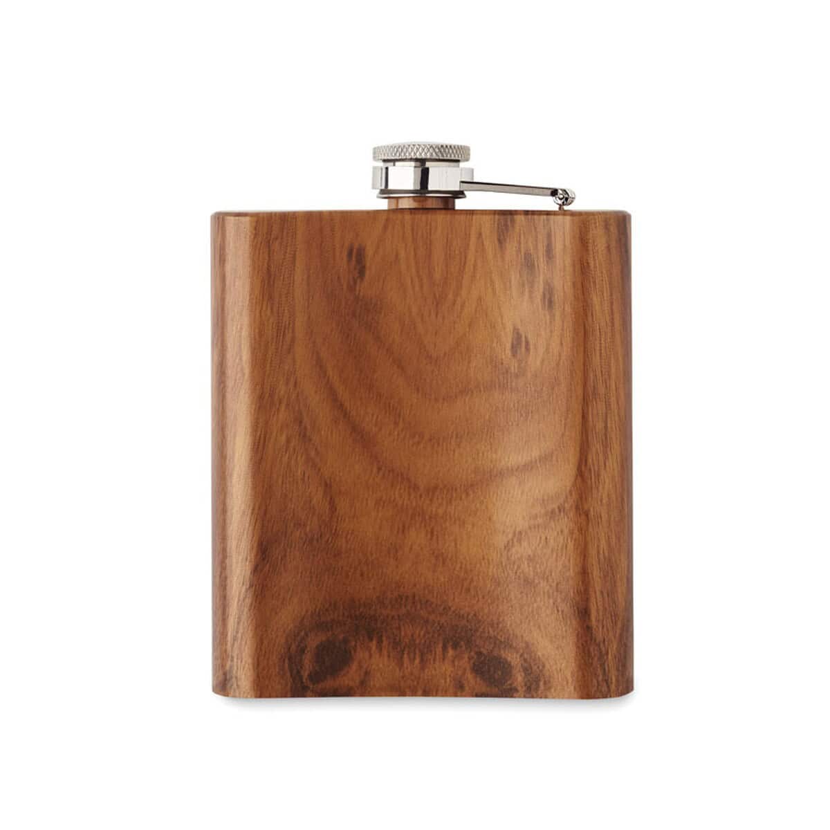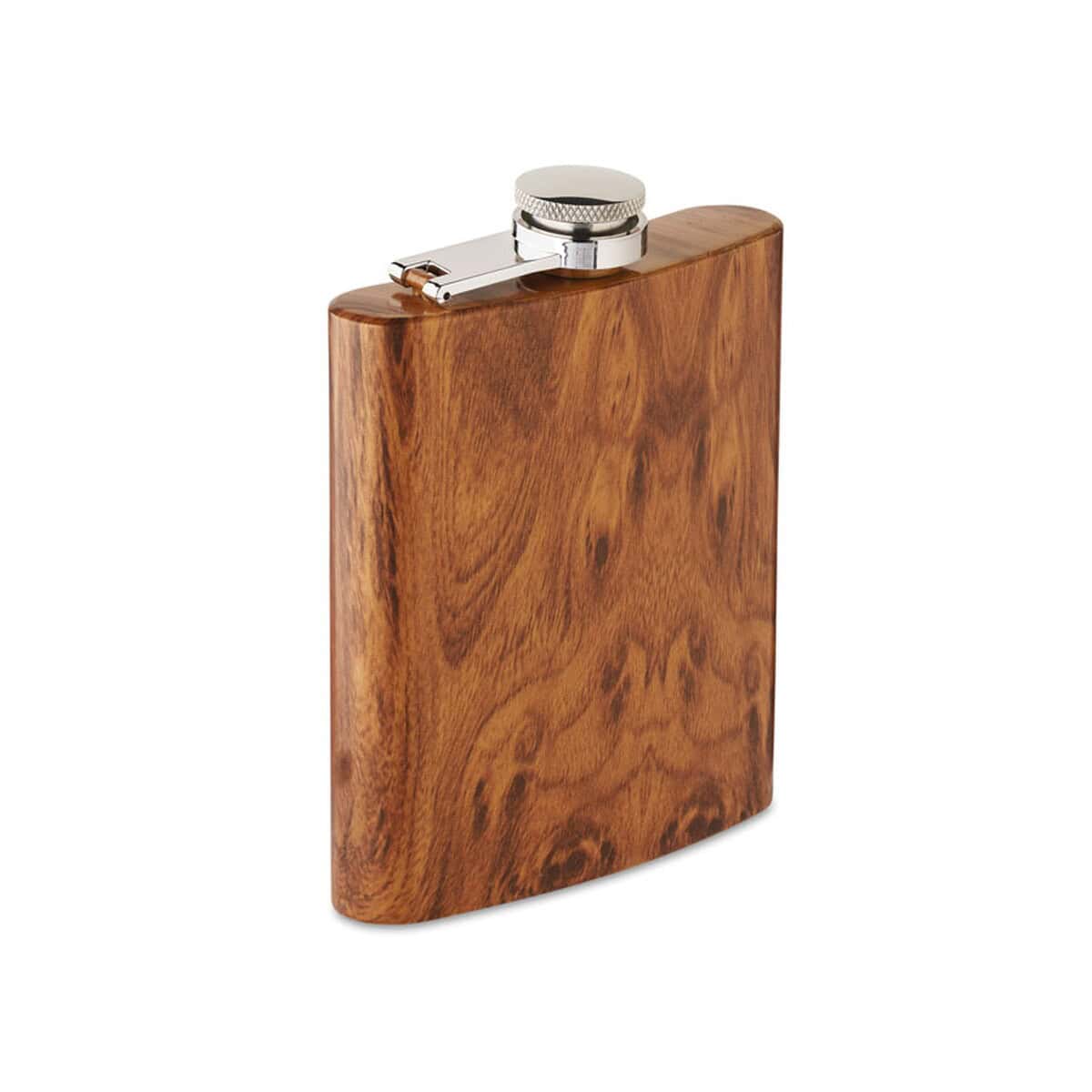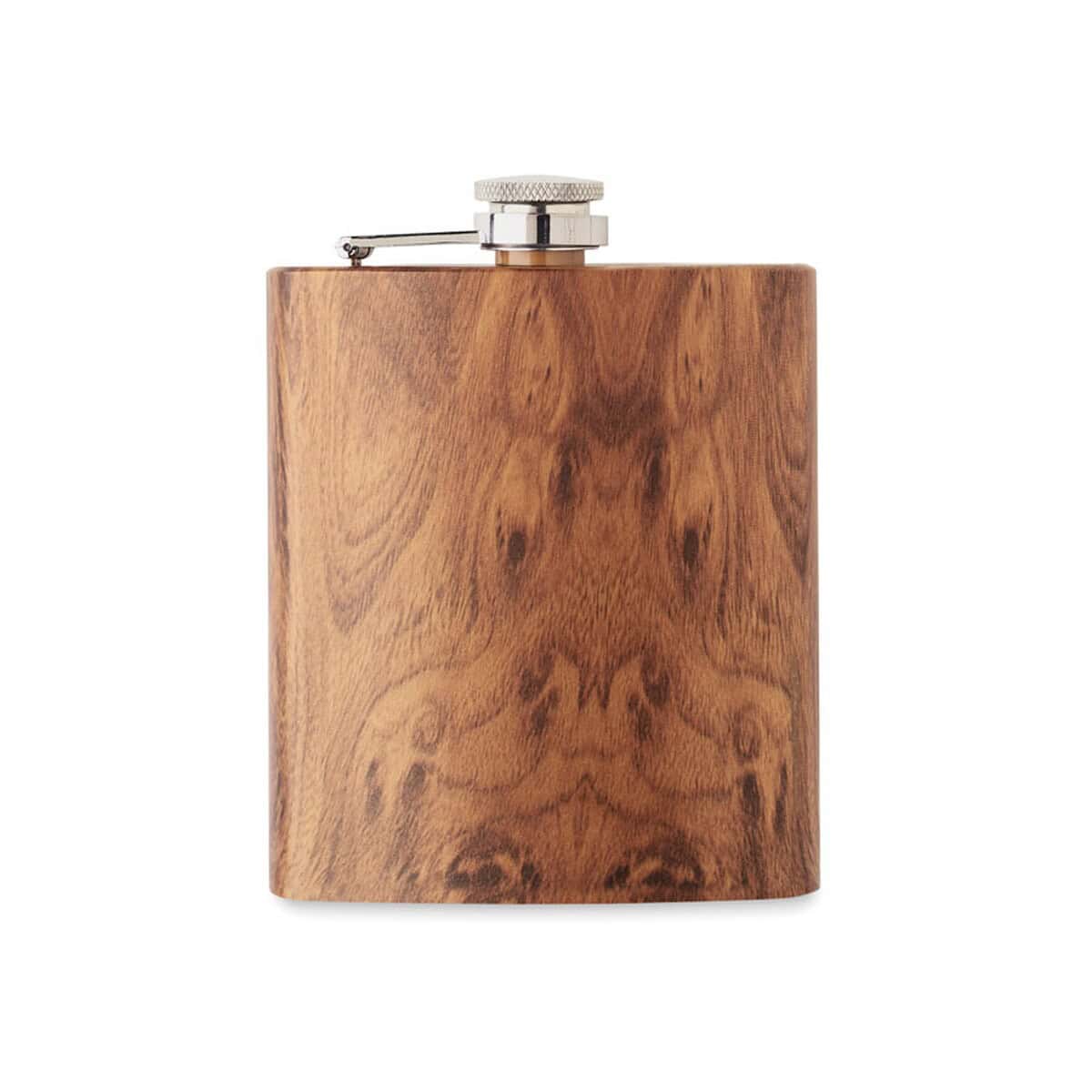 Smukła piersiówka 190 ml NAMIB FLASK to wyszukany gadżet, który od pierwszego spojrzenia przyciąga wzrok eleganckim, inspirowanym naturą wykończeniem z efektem drewna. Wykonana w 90% z recyklingowanej stali nierdzewnej i 10% stali nierdzewnej, łączy szacunek do środowiska z solidnością materiału stainless steel. Jej poręczne wymiary 12×9×2 cm oraz lekka waga 0,125 kg sprawiają, że mieści się w kieszeni marynarki, torebce czy plecaku, stając się praktycznym towarzyszem w podróży, na koncercie czy podczas firmowego eventu 😊.