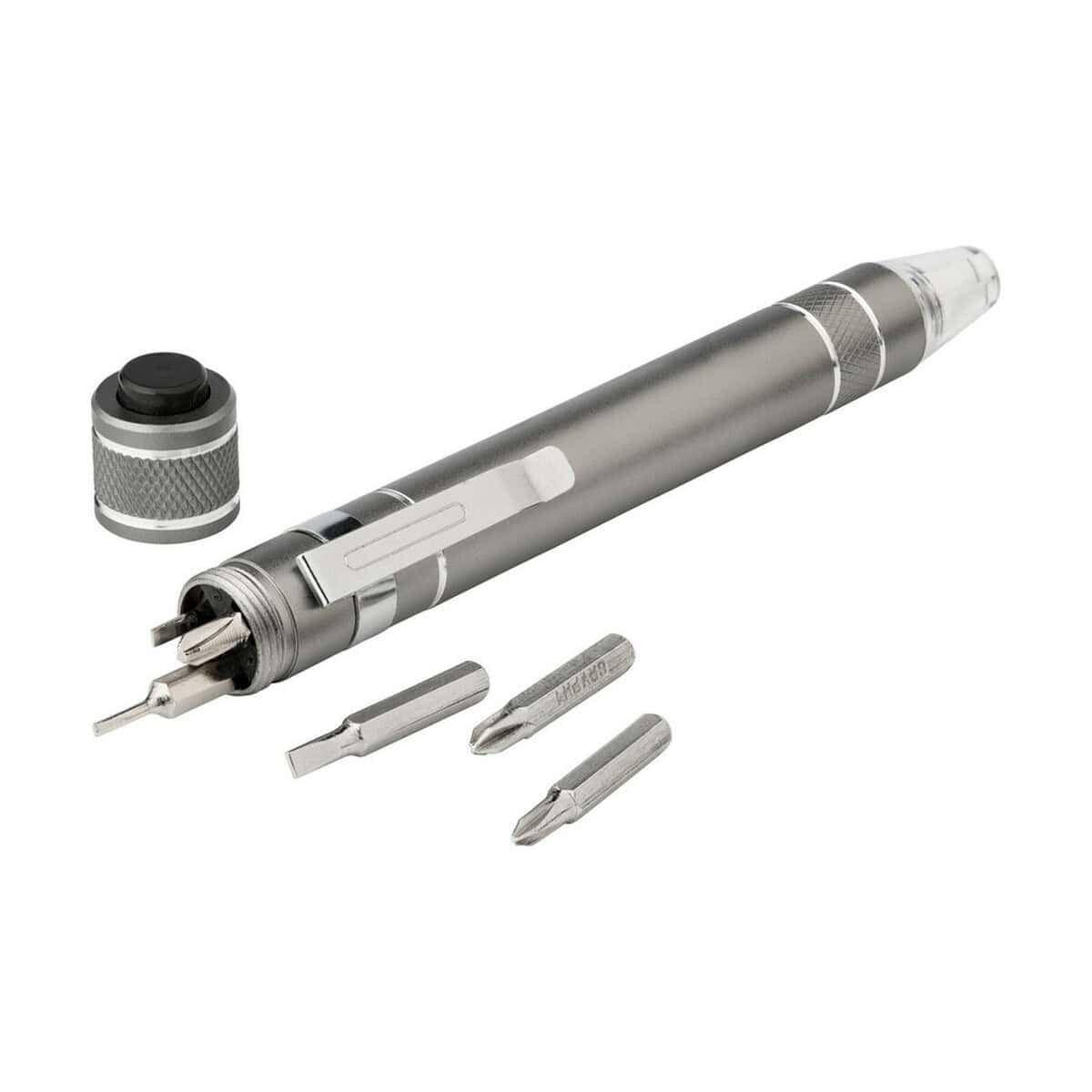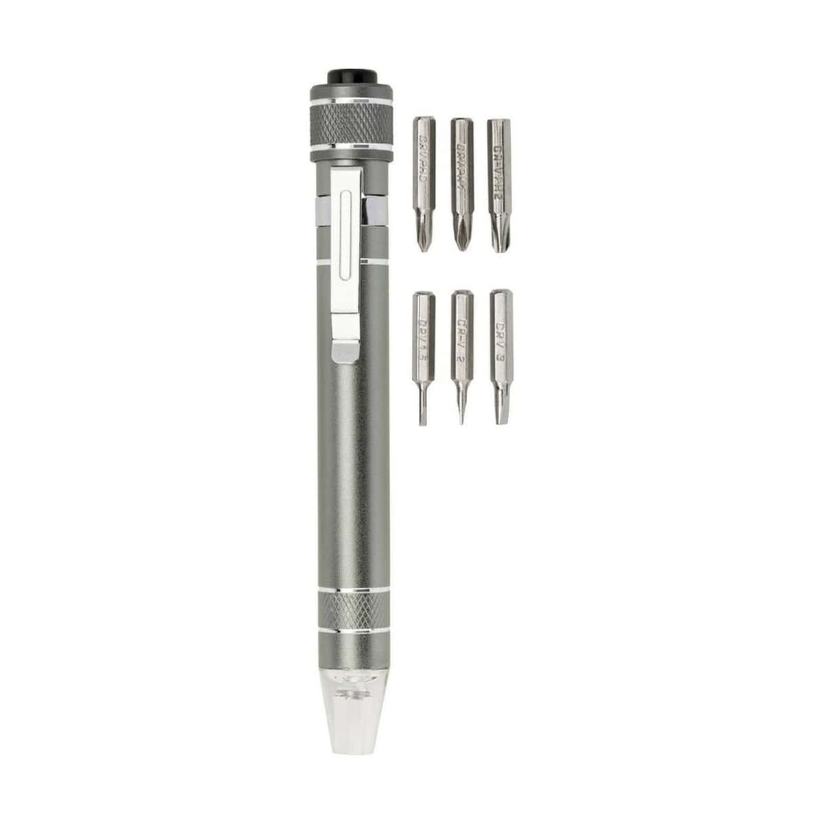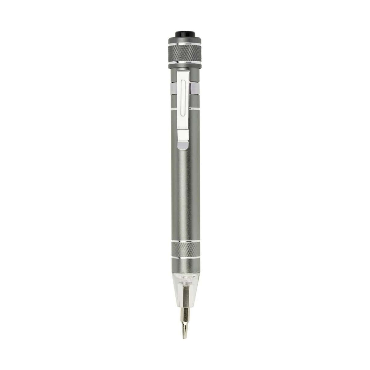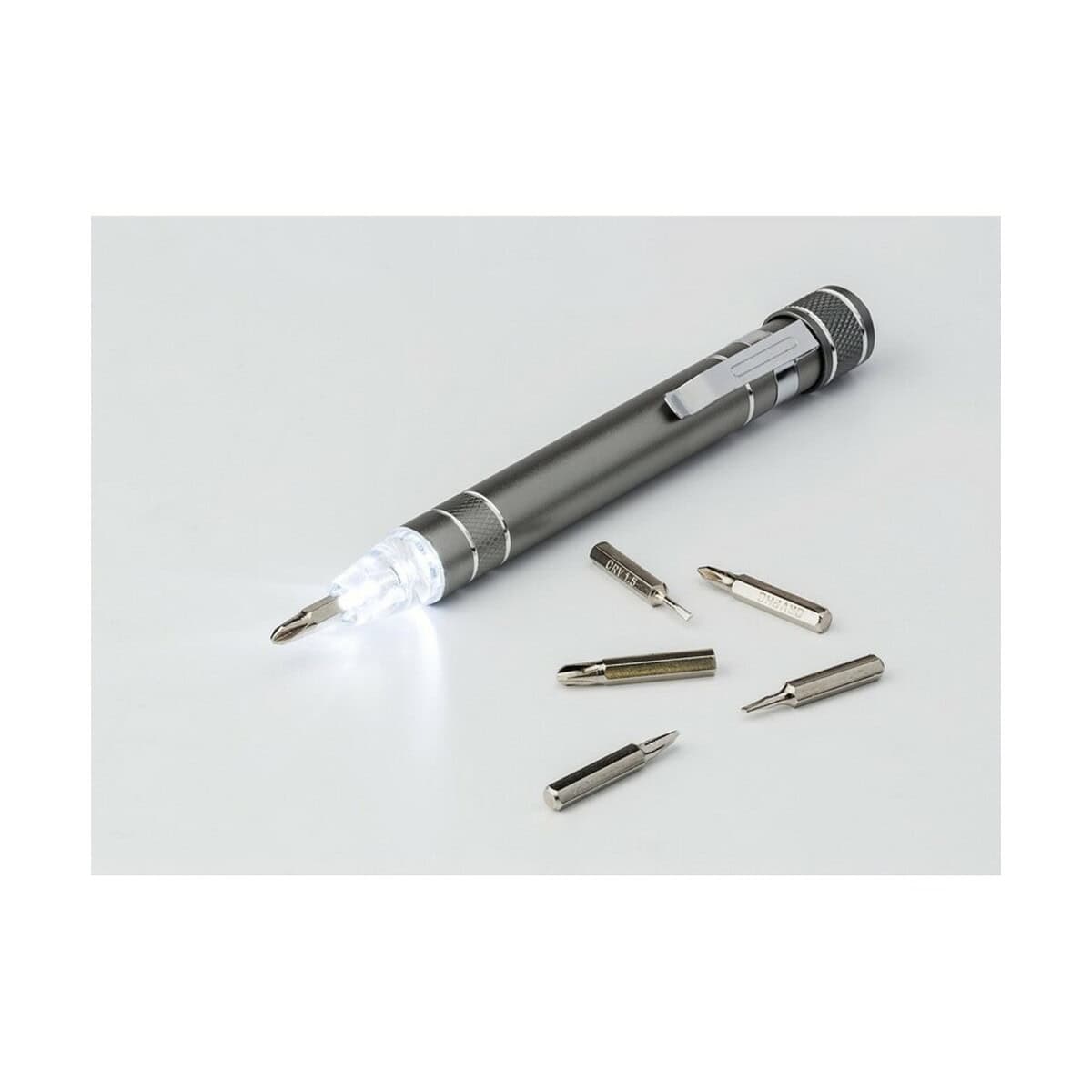 Drugie wcielenie produktu – Śrubokręt, 6 końcówek, lampka LED – to także poręczna wizytówka na targach, konferencjach czy eventach reklamowych. Lekka konstrukcja (zaledwie 50 g) i metalowy, wytrzymały materiał gwarantują długą żywotność. Poręczny format Ø1,6 × 13,1 cm sprawia, że zmieści się w kieszeni lub organizerze na biurku. Dostępny w eleganckich kolorach: szary oraz srebrny, świetnie współgra z nowoczesną stylistyką sprzętu elektronicznego.