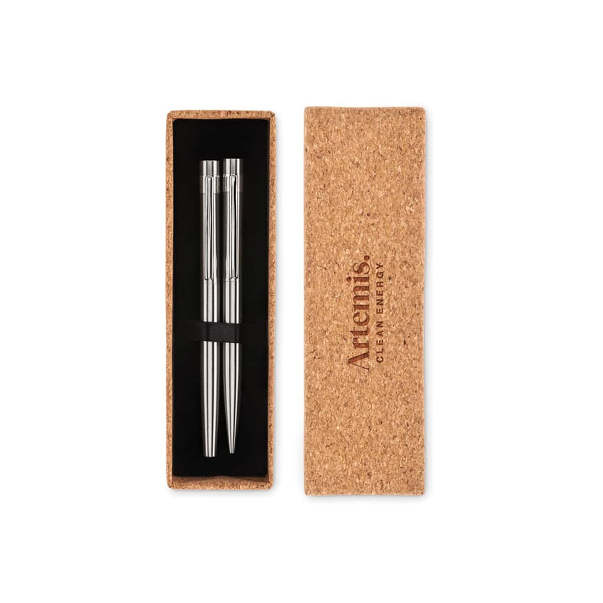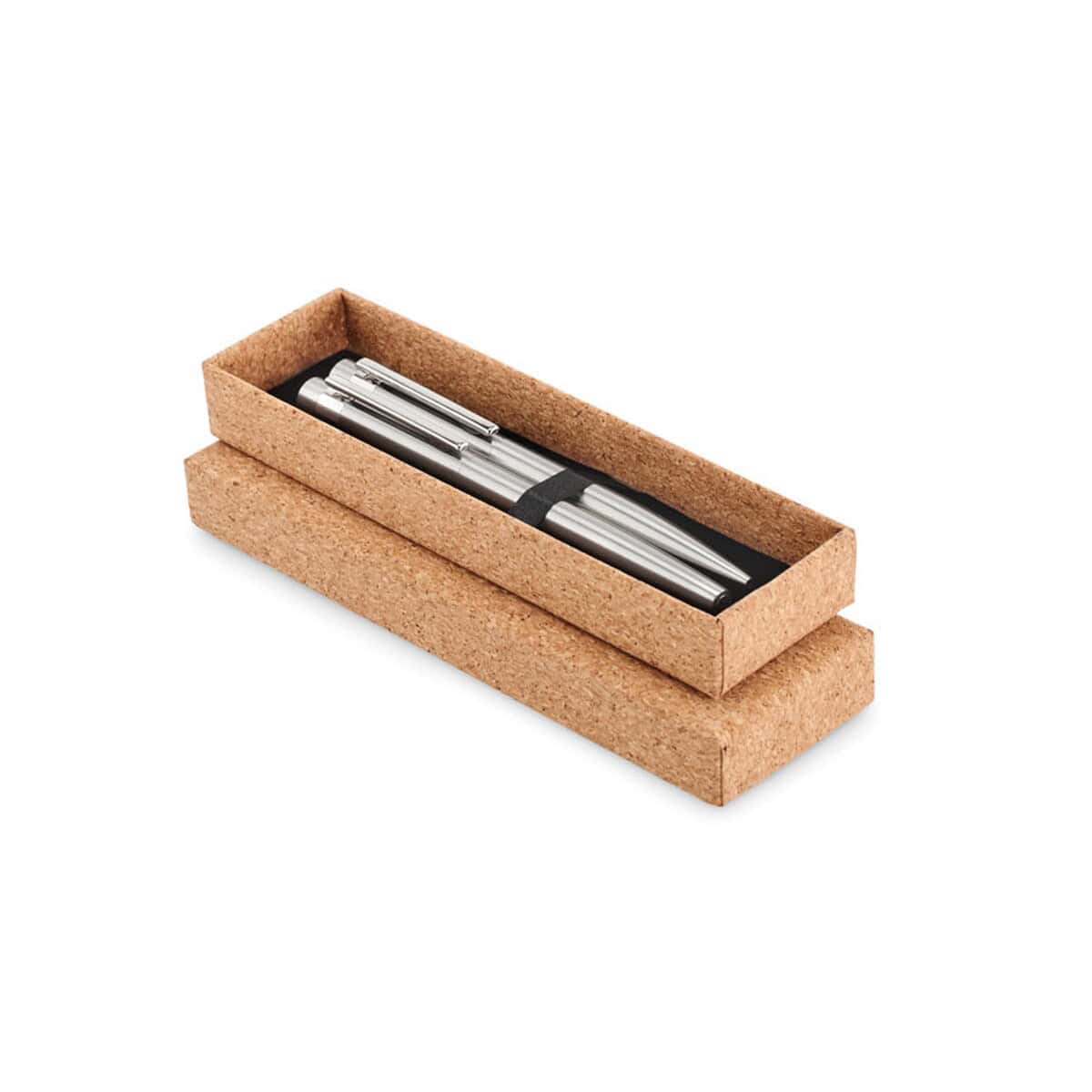 Stalowe długopisy z recyklingu GRAZ SET to wyjątkowy zestaw piśmienniczy, który łączy w sobie elegancję stali nierdzewnej i świadome podejście do ekologii. Składa się z długopisu oraz pióra kulkowego, oba wykonane z recyklingowanego materiału, co czyni je wyborem przyjaznym środowisku 🌱. Całość zapakowana jest w estetyczne pudełko z naturalnego korka, którego struktura nadaje każdemu egzemplarzowi niepowtarzalny charakter. Dzięki temu otrzymujesz nie tylko praktyczne narzędzie do pisania, ale również stylowy gadżet o wysokiej wartości estetycznej.