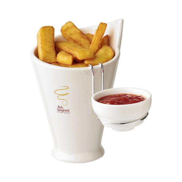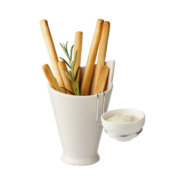 Zestaw do serwowania frytek w stylu francuskim to idealne narzędzie do podawania przekąsek i frytek bez konieczności wykorzystania wielu naczyń. Wykonana z białej ceramiki miska na sos jest elegancka i funkcjonalna, a załączony dołączony szczypiec ułatwia podawanie i jedzenie. Estetyczny wygląd sprawia, że prezentowane potrawy wyglądają bardzo ładnie i zapewniają niezapomniane wrażenia estetyczne. Sprawdzi się zarówno na świątecznym stole, jak i na imprezie. Zestaw jest łatwy w czyszczeniu i można go używać do przygotowywania wielu przekąsek.