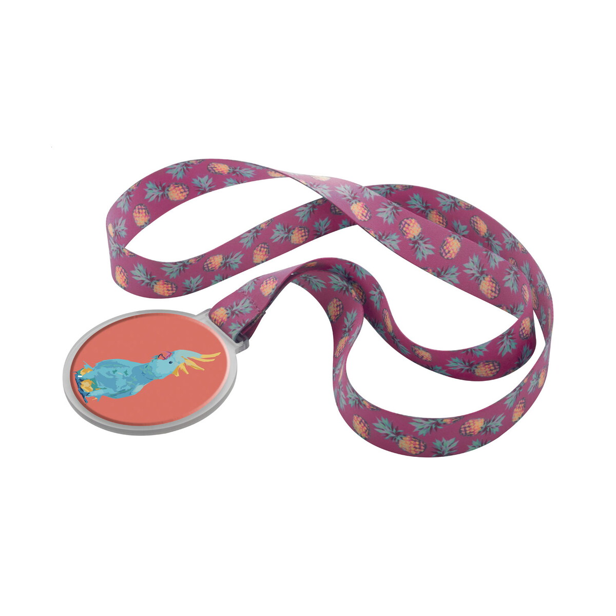 Subdal RPET medal to ekologiczny, wyróżniający się gadżet, który natychmiast przyciąga wzrok swoim połyskiem epoxy domingu oraz perfekcyjną jakością druku. Personalizowany, akrylowy medal o średnicy ø70 mm i wadze zaledwie 18 g otrzymujesz w komplecie z długą na 500 mm smyczą wykonaną z poliestru pozyskanego z recyklingu butelek PET – dzięki temu każdy egzemplarz podkreśla odpowiedzialność środowiskową marki. Na białej powierzchni medalu możemy umieścić dowolne logo poprzez pełnokolorową sublimację, a wypukłe wykończenie epoxy sprawia, że barwy pozostają intensywne i odporne na zarysowania. Cena podstawowa obejmuje zarówno sublimację, jak i efektowny doming, a minimalne zamówienie zaczyna się już od 100 sztuk 🙂