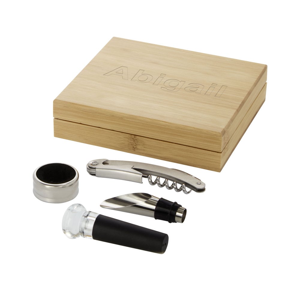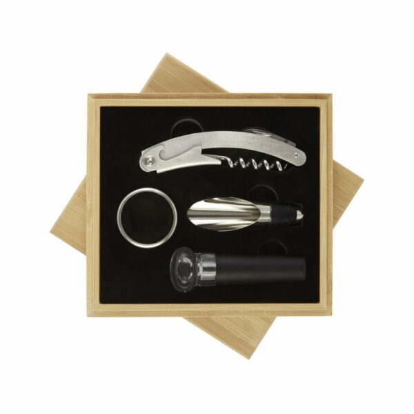 Zestaw do wina składa się z czterech elementów: korkociągu kelnerskiego, zatyczki, nalewaka i pierścienia. Zestaw jest dostarczany w eleganckim, bambusowym pudełku upominkowym, wyprodukowanym zgodnie z zasadami zrównoważonego rozwoju. Korkociąg kelnerski jest wygodny w użyciu, dzięki czemu odkorkowanie wina jest szybkie i łatwe. Zatyczka utrzymuje świeżość, a nalewak i pierścień ułatwiają nalewanie i servowanie. Ten 4-częściowy zestaw do wina to idealny dodatek do każdej kolekcji.