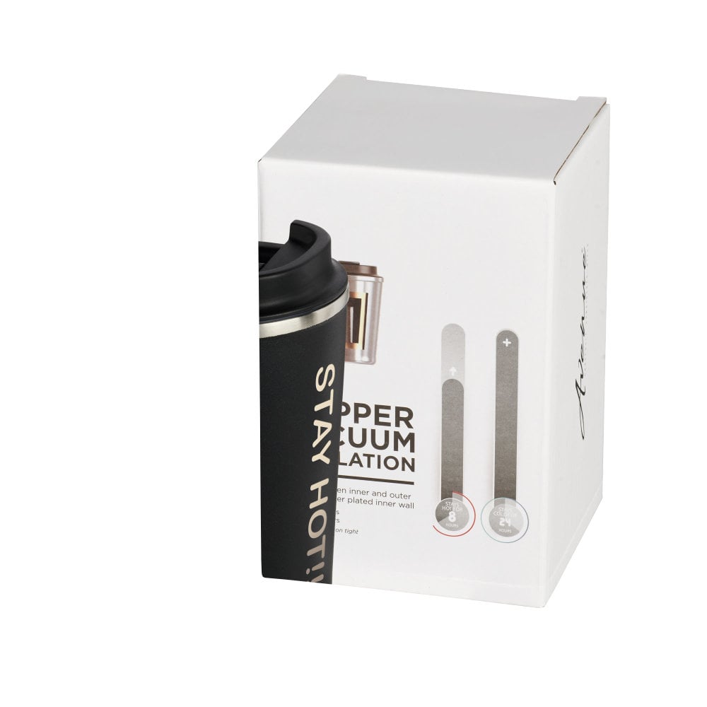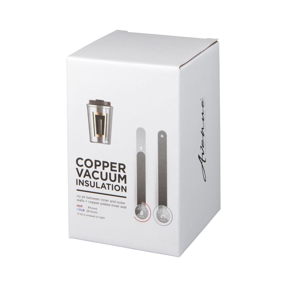Kubek Avenue o pojemności 360ml jest idealnym rozwiązaniem dla wszystkich, którzy chcą utrzymać niską temperaturę napojów przez długi czas. Wykonany z dwuwarstwowej próżniowej konstrukcji ze stali nierdzewnej i miedzianej izolacji, zapewnia utrzymanie niskiej temperatury napojów przez 24 godzin i wysokiej przez co najmniej 8 godzin. Dodatkowo, konstrukcja zapobiega kondensacji na zewnątrz kubka. Dzięki zakręcanej, odpornej na przeciekanie pokrywie, napój będzie bezpieczny. Modna trwała powłoka malowana proszkowo nada kubkowi stylowy wygląd. Kubek zapakowany jest w pudełko upominkowe Avenue.