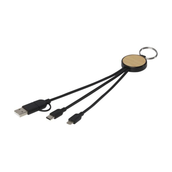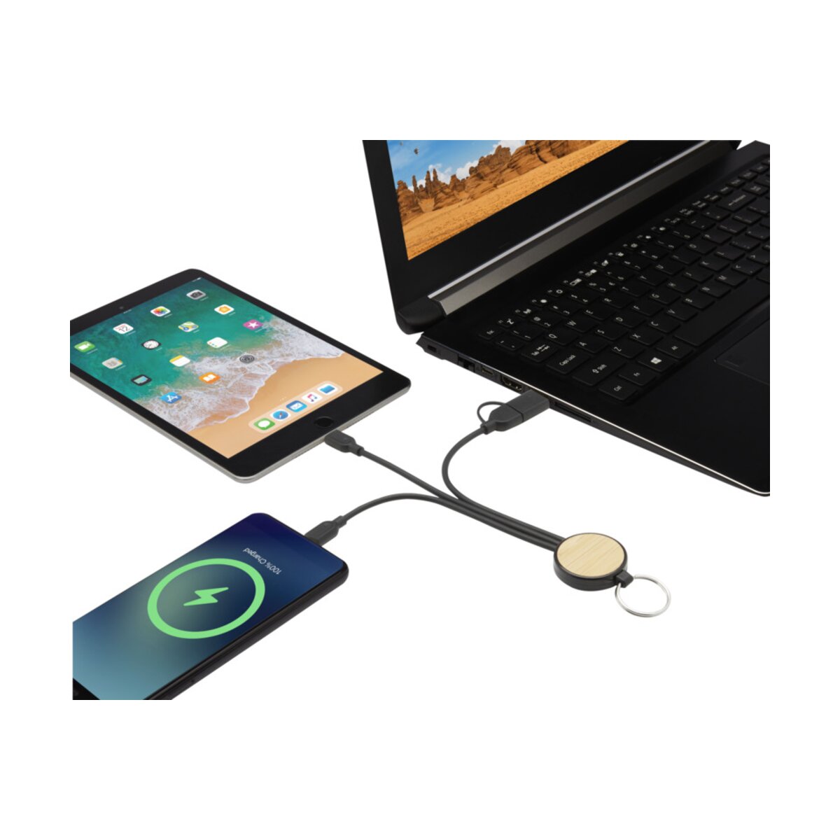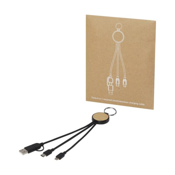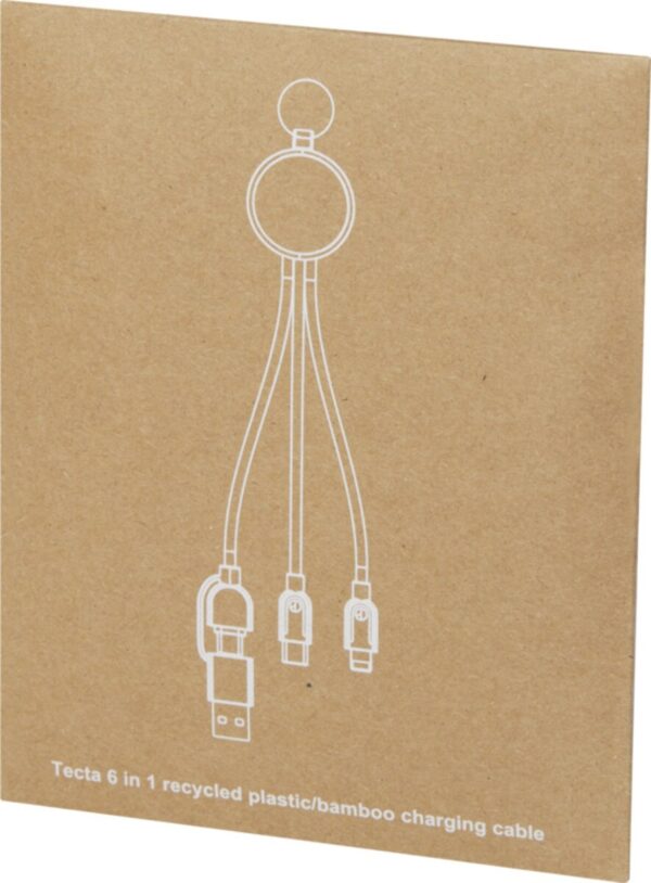 Kabel do ładowania Tecta 6 w 1 z bambusa i tworzyw sztucznych pochodzących z recyklingu to przykład połączenia zrównoważonego rozwoju ze stylem. Ten kabel RTPE o długości 25 cm zapewnia moc ładowania 2 A. Wejście: USB A i typ C. Wyjście: Typ C, micro USB i micro USB 2 w 1 oraz podwójne końcówki Lightning kompatybilne z urządzeniami z systemem iOS i Android. Aluminiowe końcówki USB zapewniają bezpieczne i stabilne połączenie, gwarantując niezawodne ładowanie za każdym razem. Srebrny brelok ze stali nierdzewnej służy do wygodnego zwijania i przenoszenia kabla. Zapakowany w kopertę z papieru Kraft.