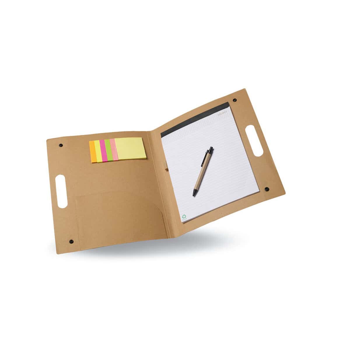 Teczka konf, karton ALBERTA to ekologiczny, a zarazem niezwykle elegancki gadżet, który uczyni każde spotkanie biznesowe czy szkolenie jeszcze bardziej profesjonalnym 📁. Wykonana z kartonu pochodzącego z recyklingu, zachwyca naturalnym, beżowym odcieniem i dbałością o środowisko. Wewnątrz znajduje się notatnik w linie (20 kartek), dwuczęściowy blok samoprzylepny, komplet średnich żółtych karteczek, pięć kolorowych znaczników oraz zaokrąglona kieszeń, w której bez trudu zmieścisz ulotki, wizytówki czy materiały promocyjne. Całość uzupełnia dopasowany długopis z papierowym korpusem i niebieskim tuszem, wygodnie mocowany w specjalnym uchwycie. Zamknięcie na zatrzask gwarantuje bezpieczeństwo dokumentów, a wycięte uchwyty ułatwiają przenoszenie. Wymiary 34,5 × 28,5 × 2,5 cm i niewielka waga 0,286 kg sprawiają, że produkt jest lekki i poręczny 🙂.