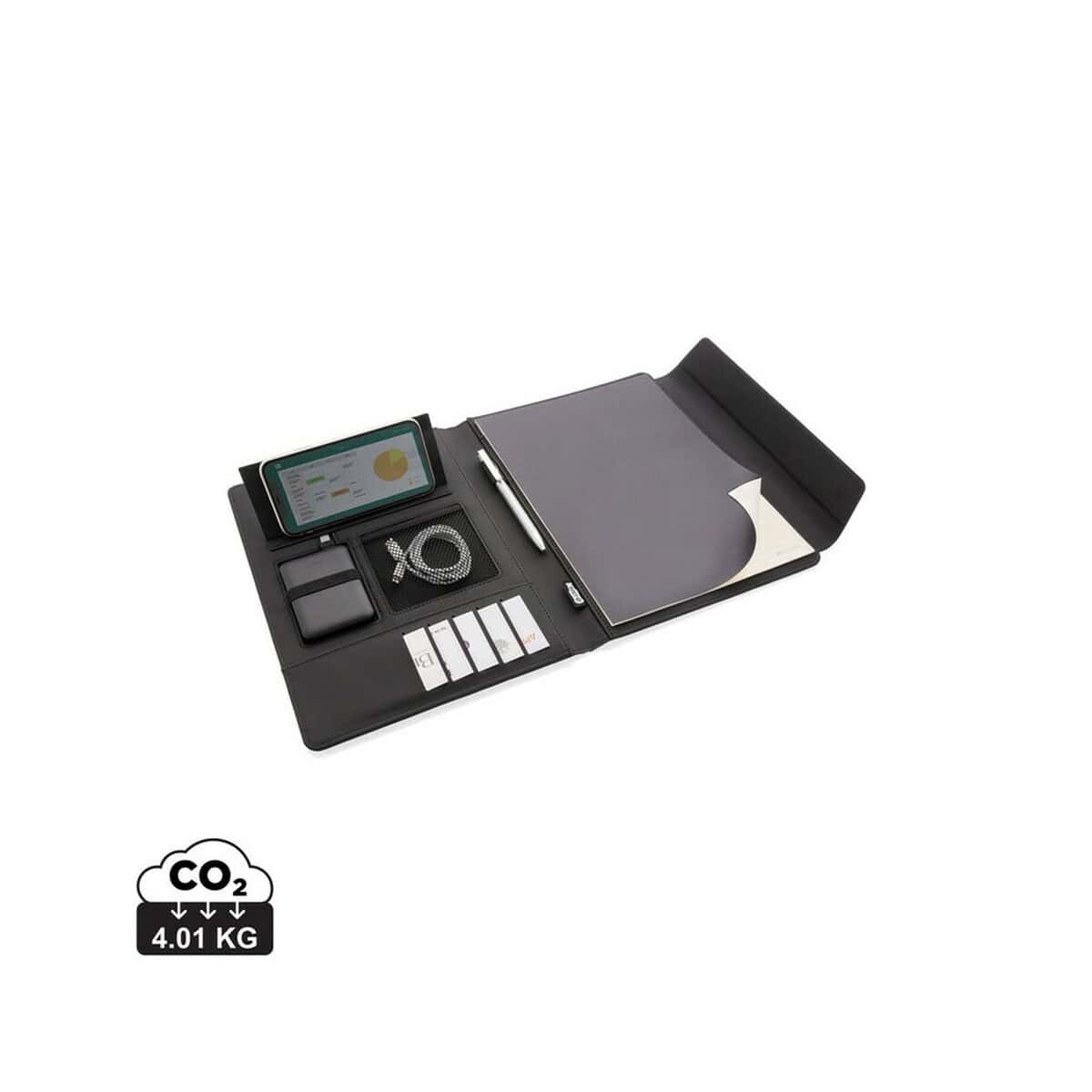 Teczka konferencyjna A4 Fiko, power bank 5000 mAh to wielofunkcyjny gadżet, który łączy w sobie elegancję biznesowej teczki z praktycznością przenośnego zasilania. Wykonana z przyjaznej środowisku mieszanki RPET i PU, podkreśli proekologiczne wartości marki, a zarazem zapewni wytrzymałość i przyjemny w dotyku, matowy finish. Wewnątrz czeka notatnik z 20 kremowych kartek 80 g/m², trzy kieszenie na wizytówki, miejsce na długopis, dodatkowe przegrody oraz stabilny stojak na telefon, co tworzy kompaktowe centrum dowodzenia podczas spotkań 😊.