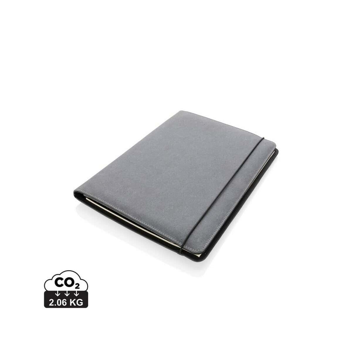 Produkt wyróżnia niewielki ślad węglowy na poziomie 2,06 kg CO₂, co czyni go rozwiązaniem przyjaznym dla środowiska. Wymiary: 31,1 × 23,7 × 2 cm pozwalają na wygodne przenoszenie w torbie lub plecaku, a jednocześnie zapewniają wystarczająco dużo miejsca na materiały formatu A4. Materiał: skóra z recyklingu, papier z recyklingu gwarantuje trwałość oraz miły w dotyku, luksusowy wygląd, który wzmocni wizerunek każdej marki.