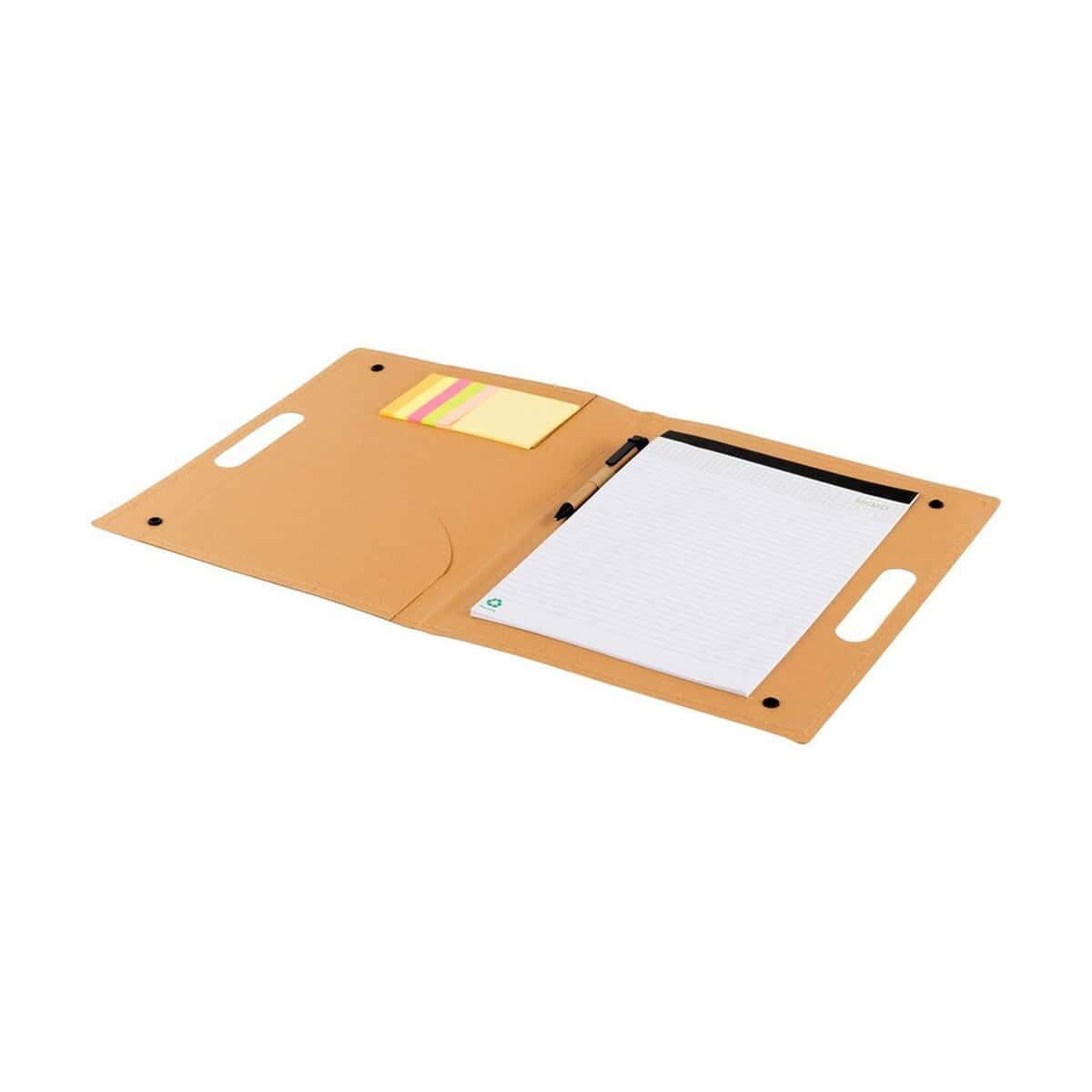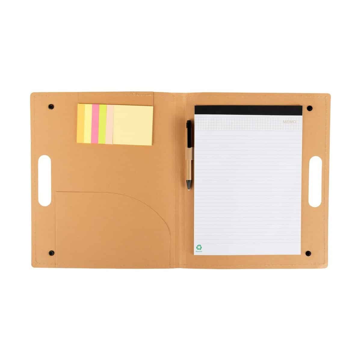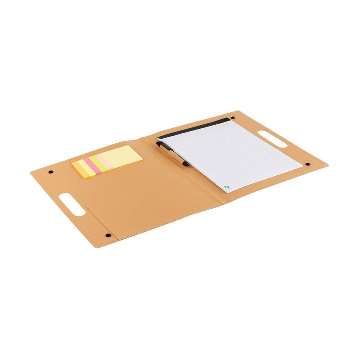 Teczka konferencyjna, notatnik ok. A4, długopis, karteczki samoprzylepne to znakomity gadżet biznesowy, który z łatwością odmieni wizerunek każdej marki 😊. Wykonana z wytrzymałego papieru 600 g/m2 w stonowanym brązie, mieści w sobie notatnik 20 kartek w linie formatu A4, ekologiczny długopis oraz aż 100 karteczek samoprzylepnych w czterech żywych kolorach. Całość zamyka funkcjonalny uchwyt, który ułatwia przenoszenie dokumentów na szkoleniach, targach czy spotkaniach z klientami. Jej kompaktowe wymiary 34,5 × 28,3 × 2,2 cm sprawiają, że zmieści się w torbie lub plecaku, a jednocześnie pomieści wszystkie niezbędne materiały.