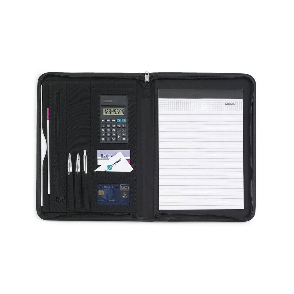 Teczka konferencyjna ok. A4 z notatnikiem i kalkulatorem to znakomity sposób, aby już przy pierwszym spotkaniu biznesowym wyróżnić się profesjonalizmem. Solidna konstrukcja z metalu i mikrofibry w eleganckiej czerni sprawia, że zarówno na sali konferencyjnej, jak i w podróży służbowej prezentujesz się pewnie i stylowo. Zamek błyskawiczny chroni dokumenty, a wewnętrzny notatnik z 20 liniowanymi kartkami ułatwia zapisanie najważniejszych wniosków ze spotkania. Wbudowany, podwójnie zasilany kalkulator ratuje, gdy trzeba błyskawicznie przeliczyć koszty lub kursy walut – wszystko masz pod ręką 🙂