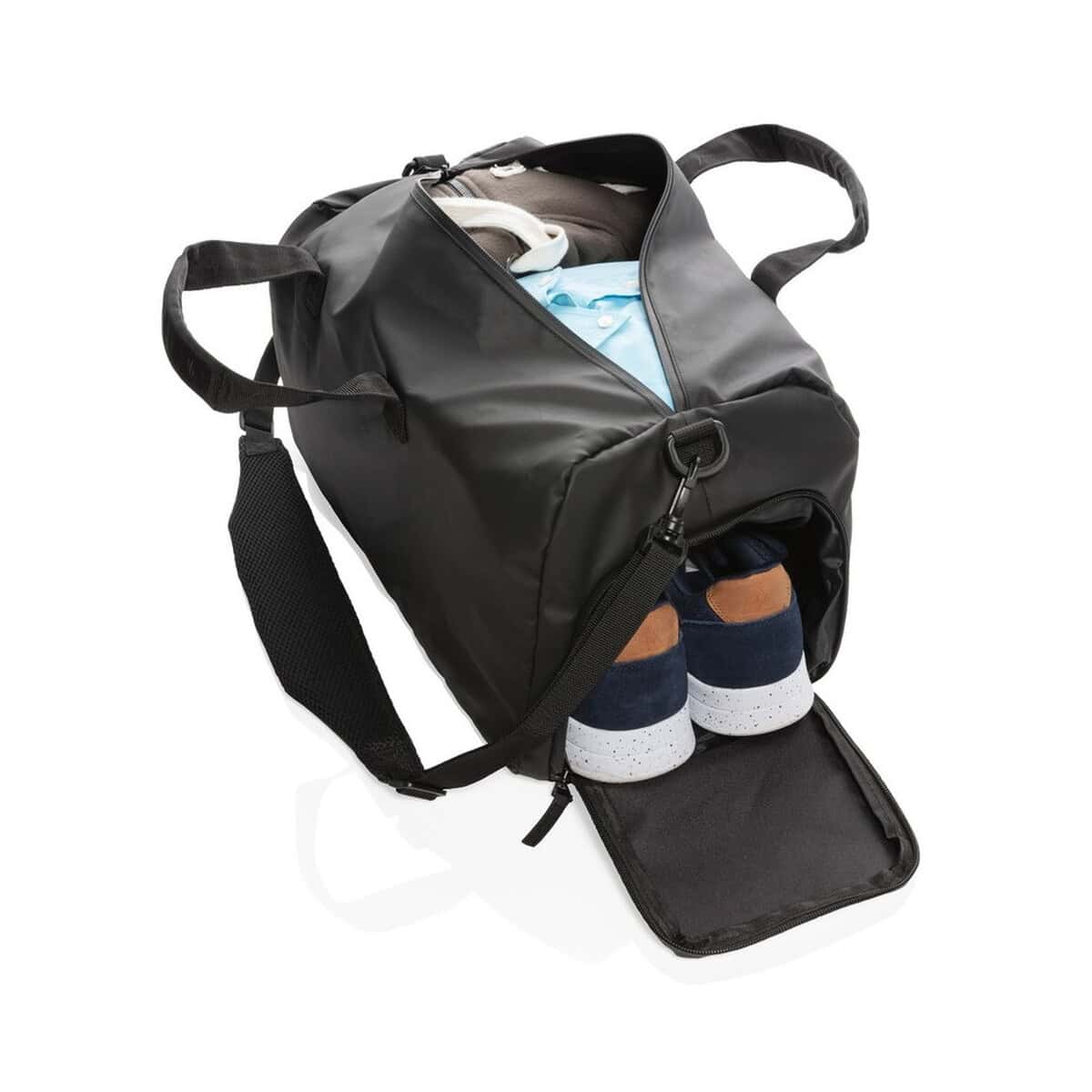 Torba sportowa, podróżna Fashion to znakomite połączenie miejskiej elegancji z funkcjonalnością, które sprawdzi się zarówno w drodze na siłownię, jak i podczas weekendowego wypadu za miasto. Jej minimalistyczny, czarny design przyciąga wzrok, a przestronna konstrukcja z wytrzymałego poliuretanu wzmocnionego włóknem poliestrowym zapewnia odporność na codzienne wyzwania. Format odpowiada wymogom bagażu podręcznego, dzięki czemu bez problemu zabierzesz ją na pokład samolotu 🙂
